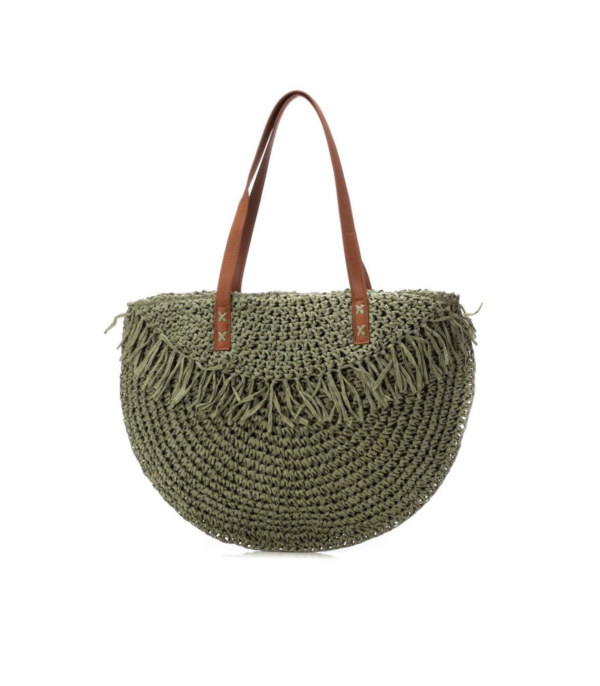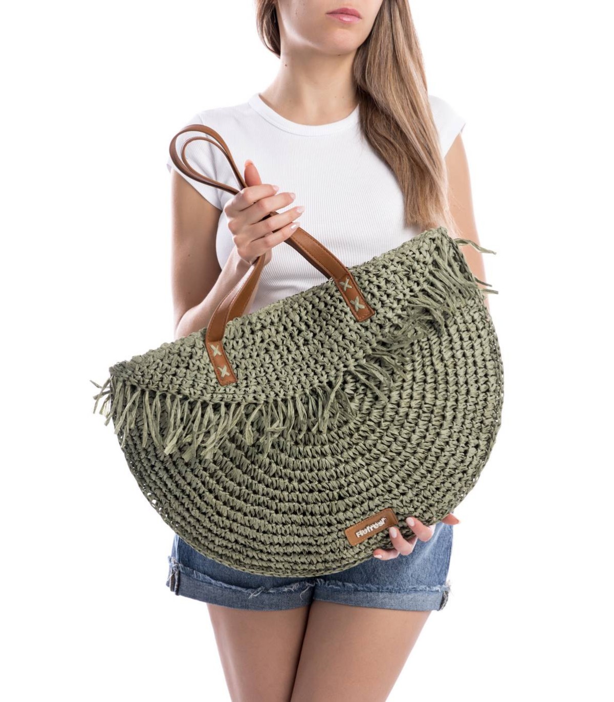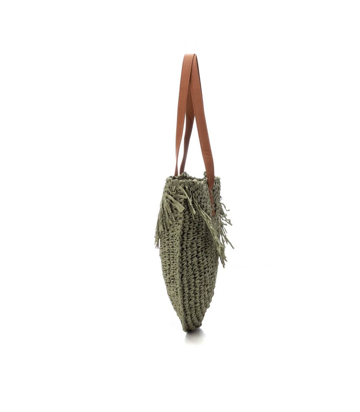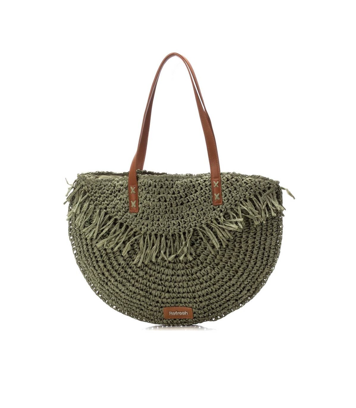 Bolso mediano de hombro, marca Refresh. Fabricado en rafia. Cierre mediante cremallera para mayor seguridad. Flecos decorativos dan a este bolso, un toque veraniego y elegante. Medidas 32x44x4cm. Este modelo ha obtenido el certificado vegano por la organización mundial PETA (Organización de los derechos de los animales).