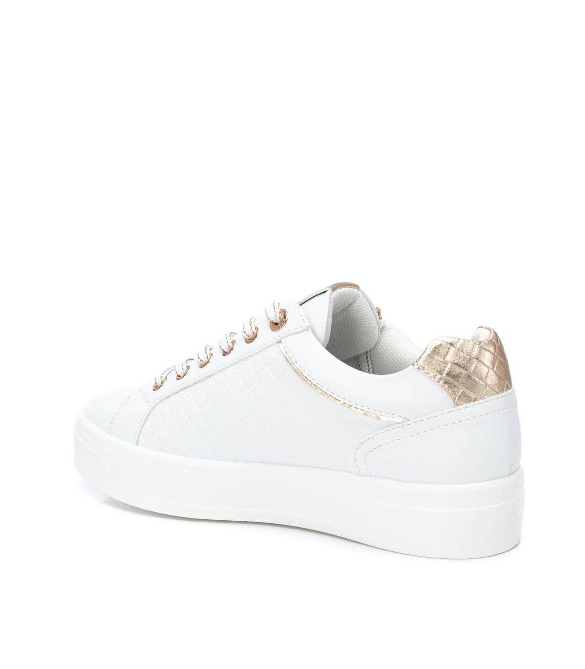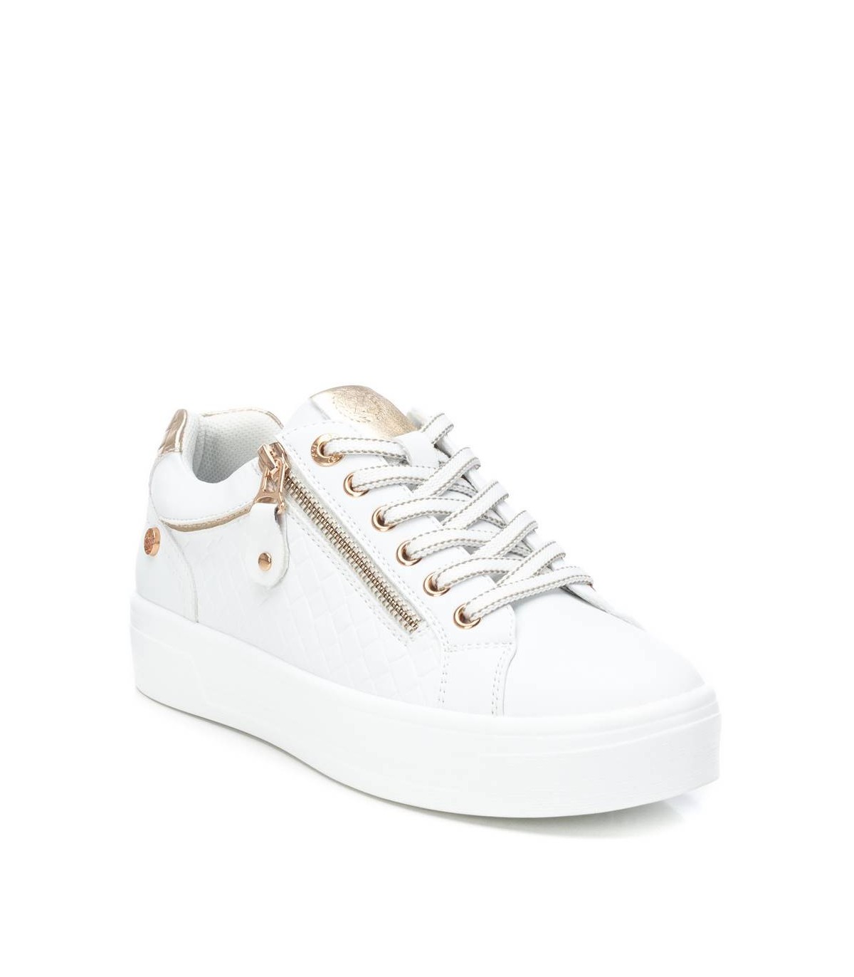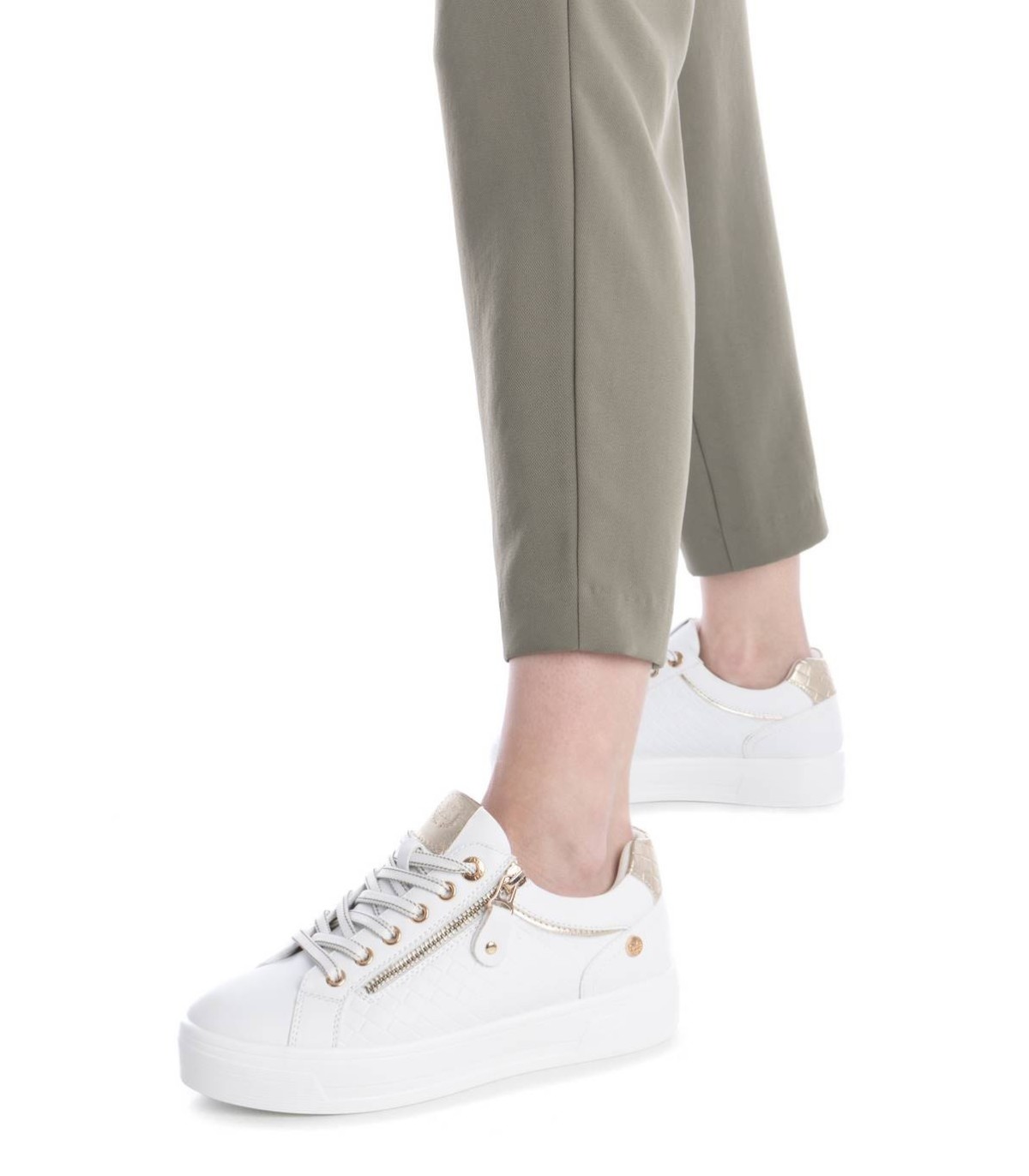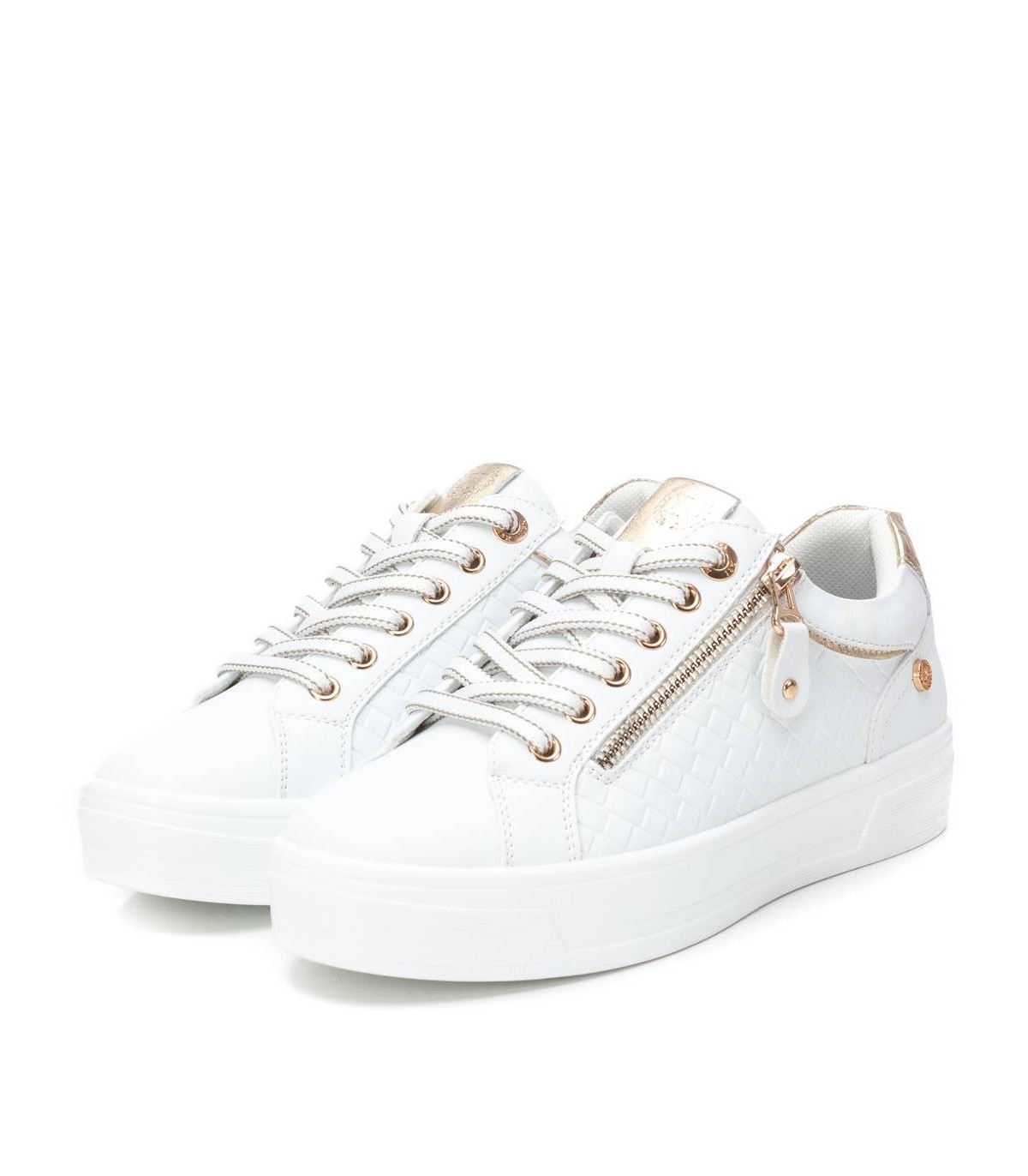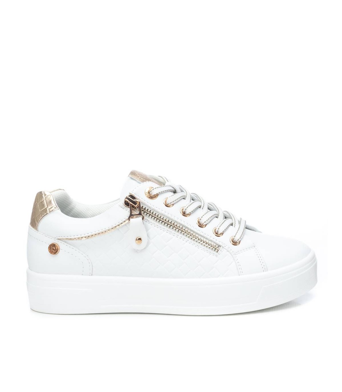 Zapatilla de mujer, de la marca Xti. Fabricada en material que imita a la piel con lateral grabado. Cierre mediante cremallera en el lateral, con cordones decorativos. Con plantilla extraíble. Bonita suela de goma antideslizante. Este modelo ha obtenido el certificado vegano por la organización mundial PETA (Organización de los derechos de los animales).