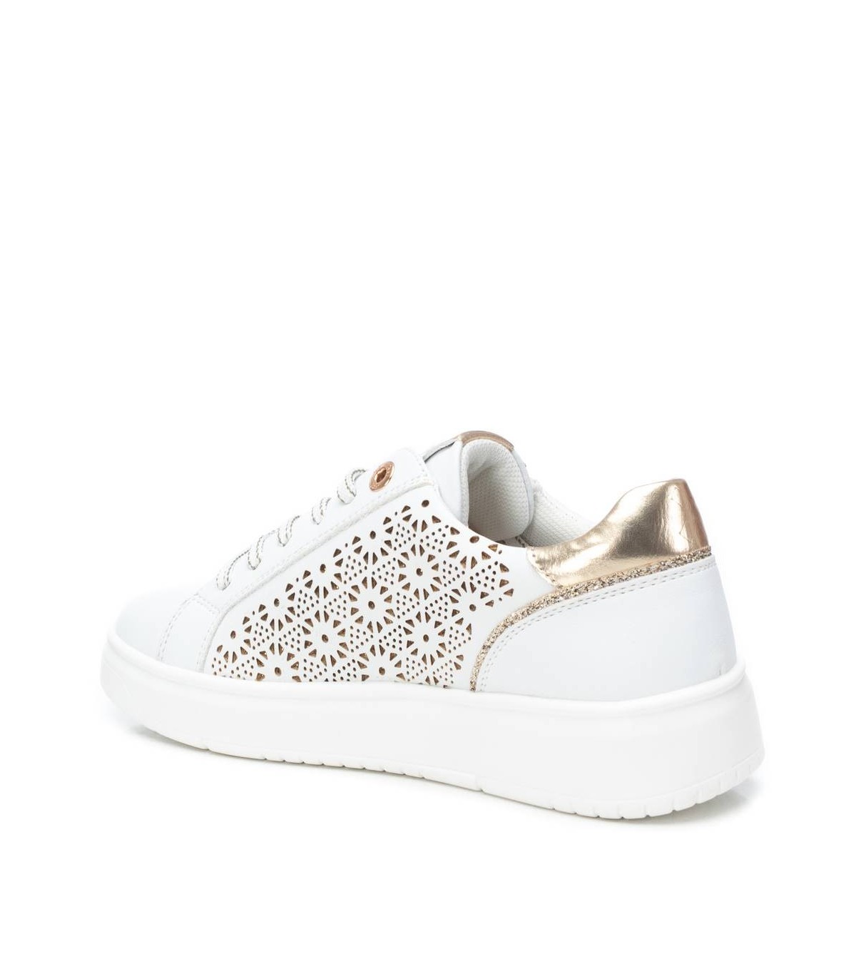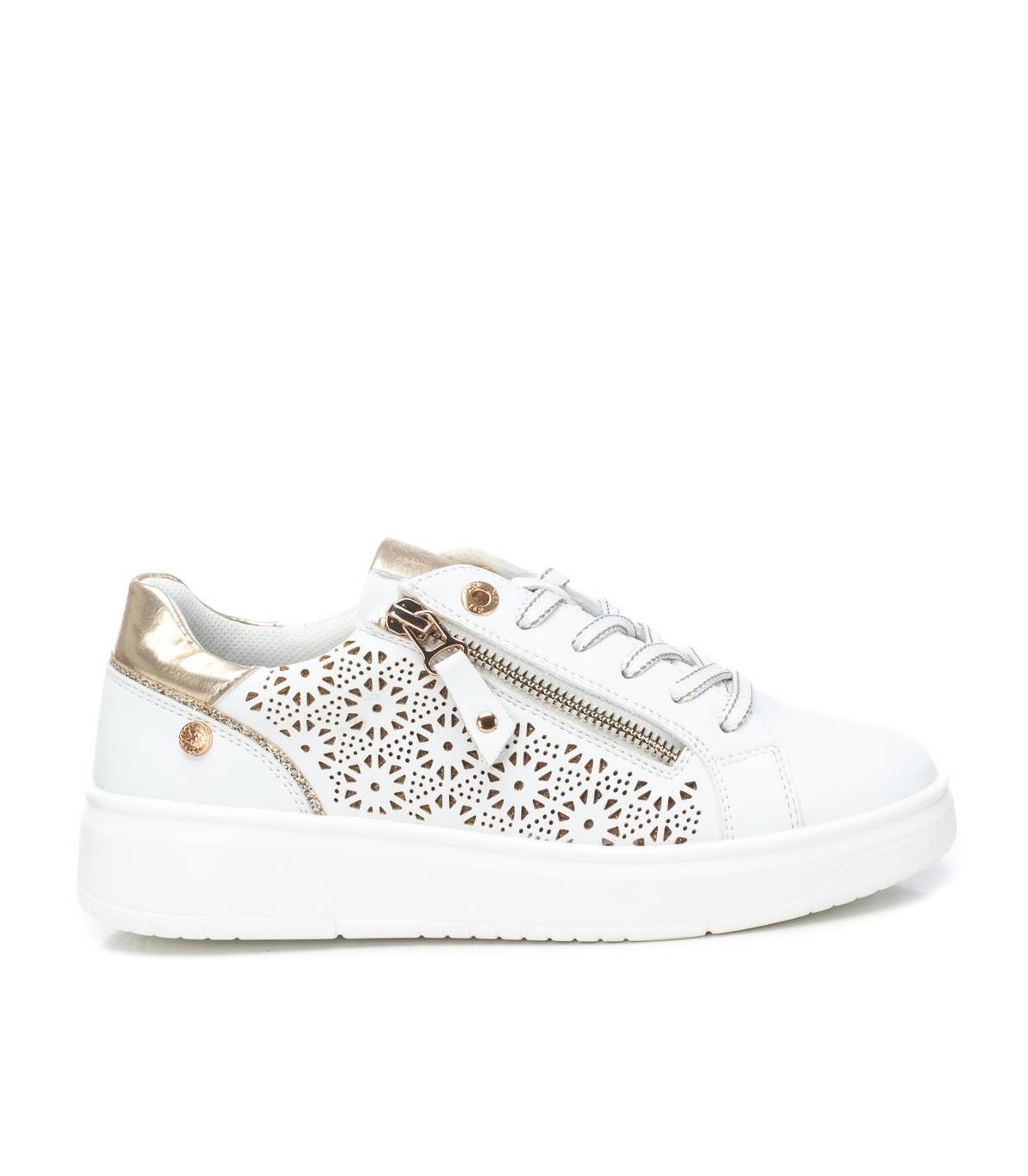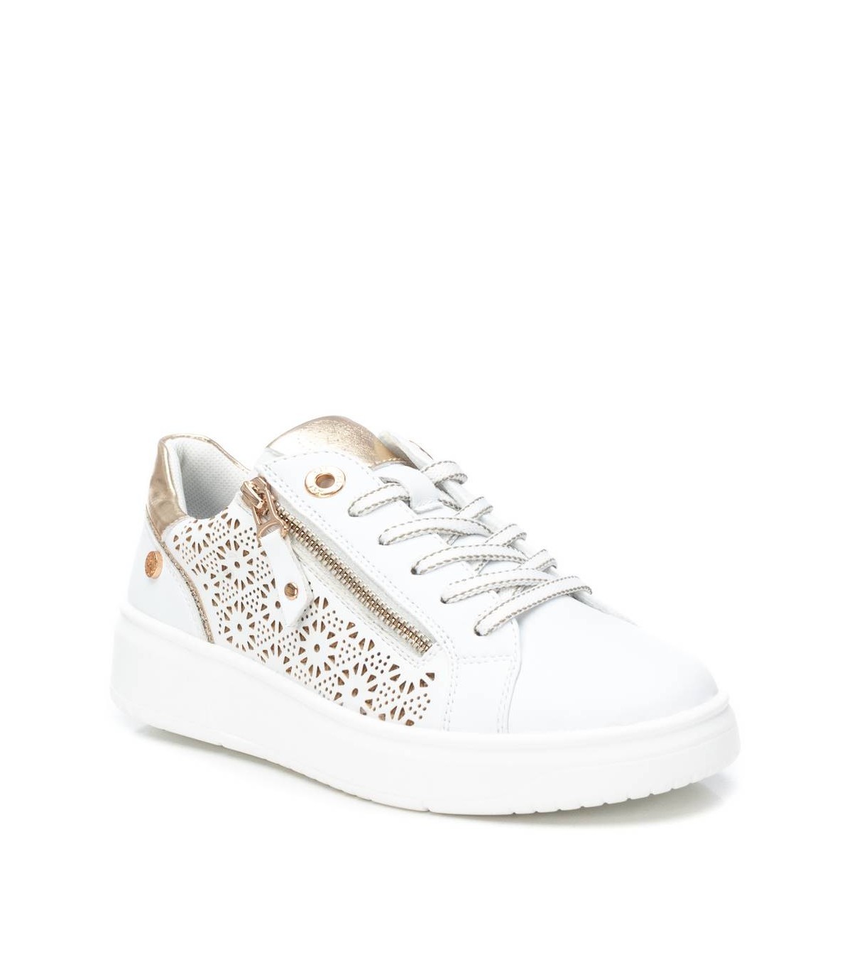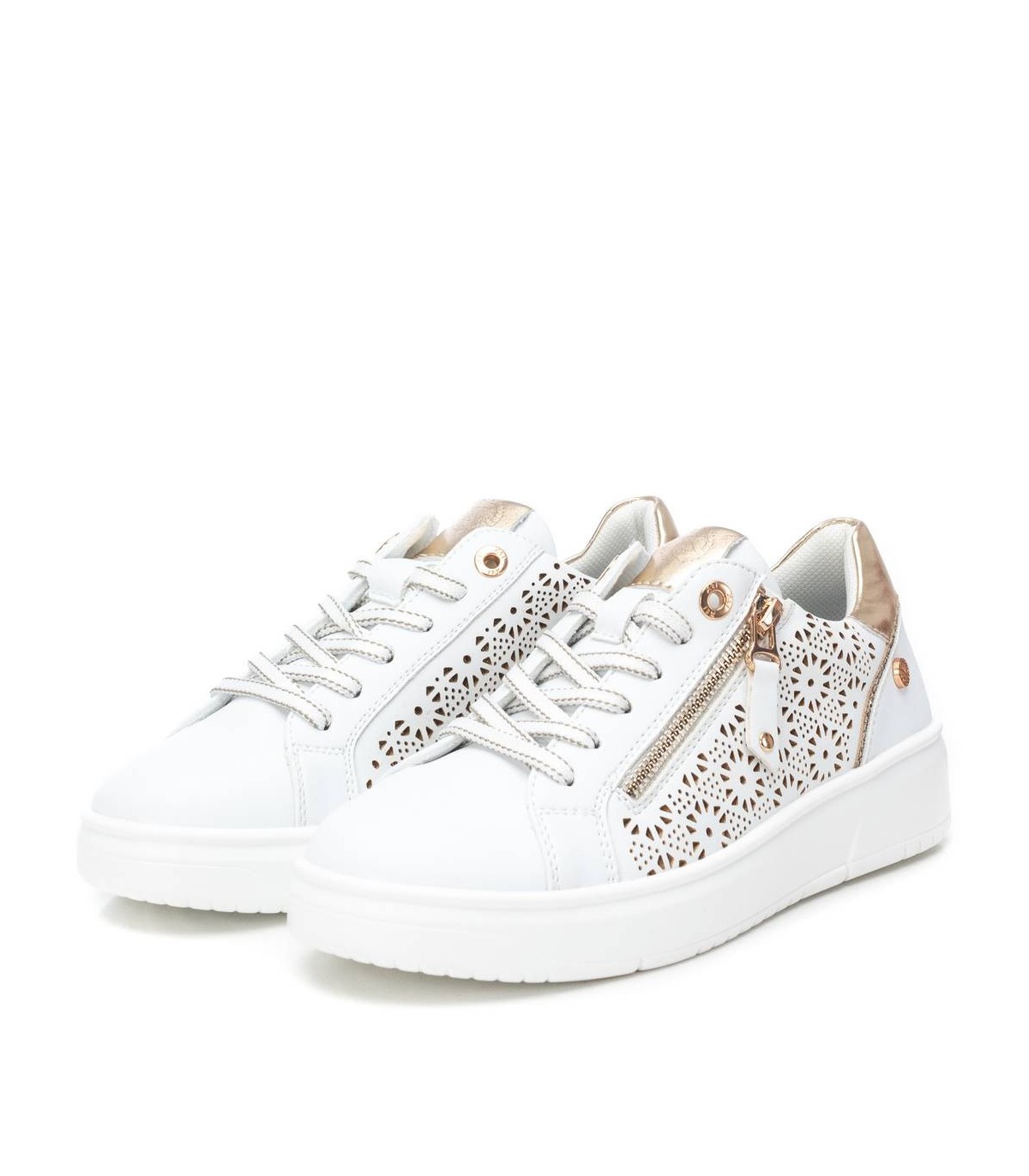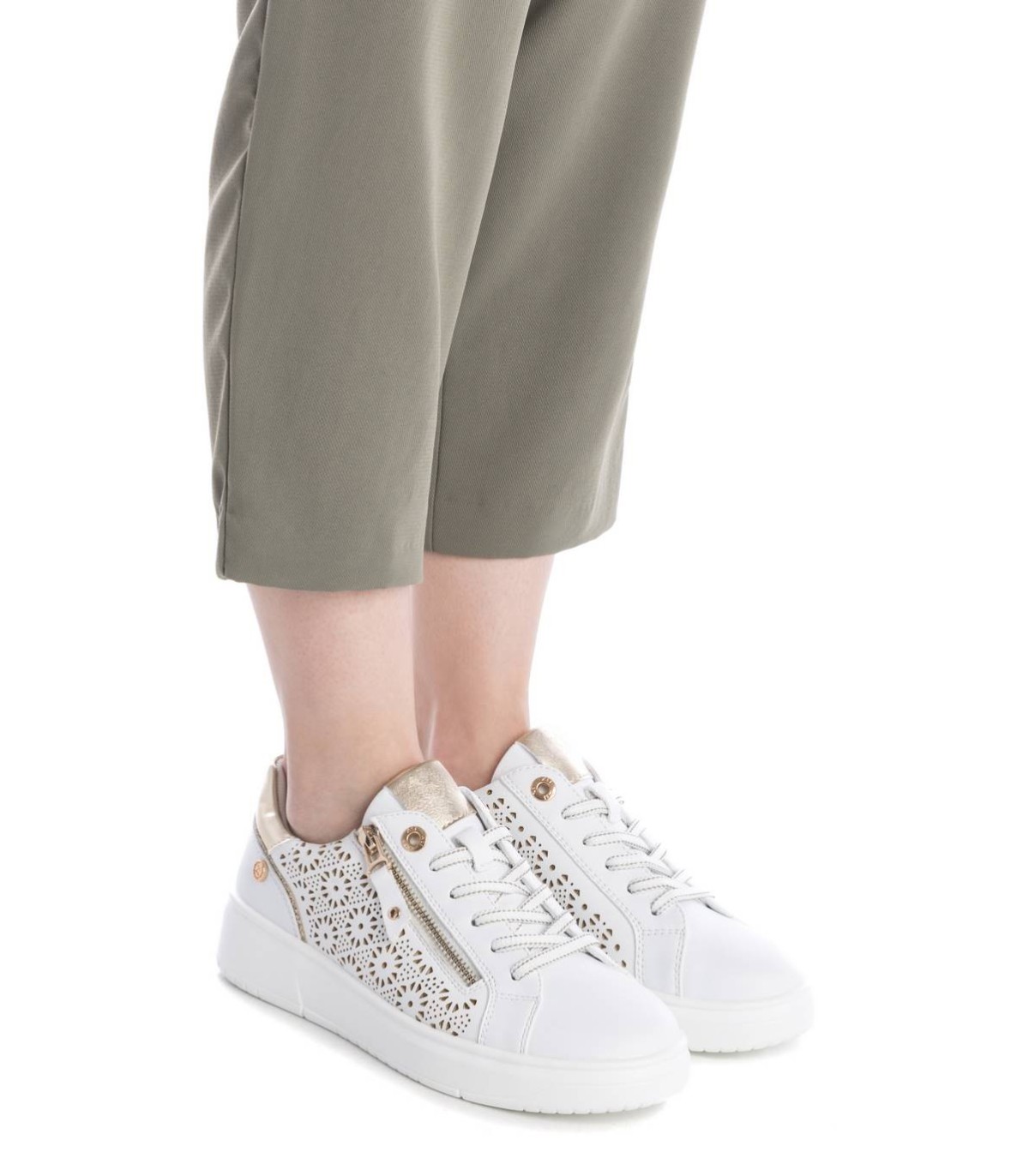 Zapatilla de mujer, de la marca Xti. Fabricada en material que imita a la piel y lateral con pequeño troquelado. Cierre mediante cremallera en el lateral, con cordones decorativos. Bonita suela de goma antideslizante. Con plantilla extraíble. Este modelo ha obtenido el certificado vegano por la organización mundial PETA (Organización de los derechos de los animales).