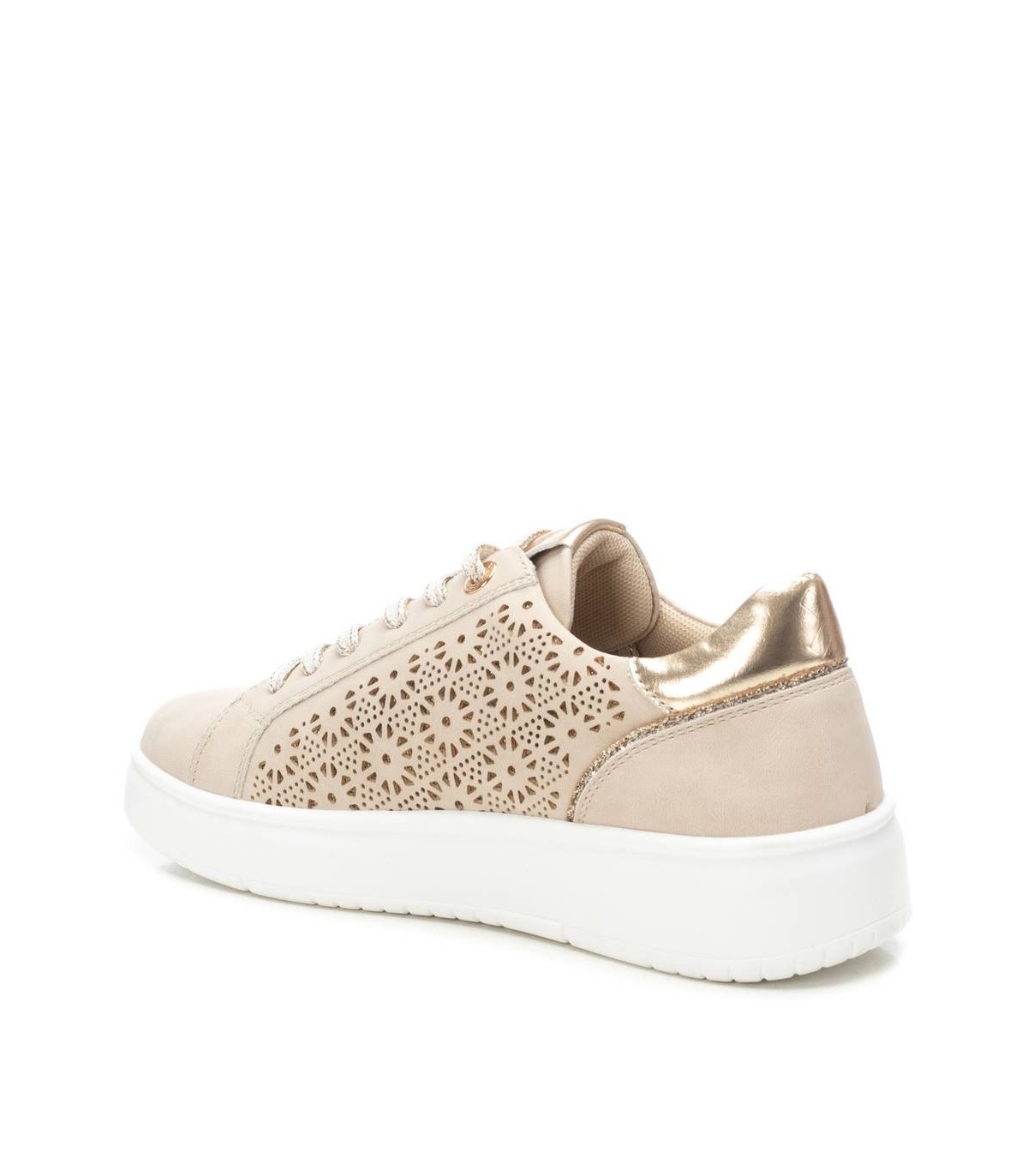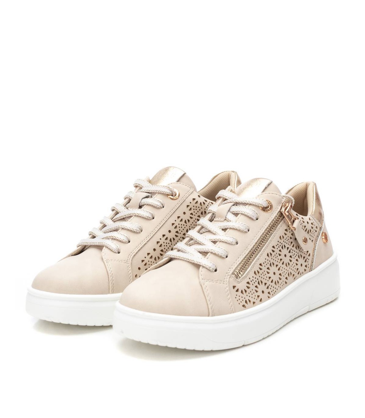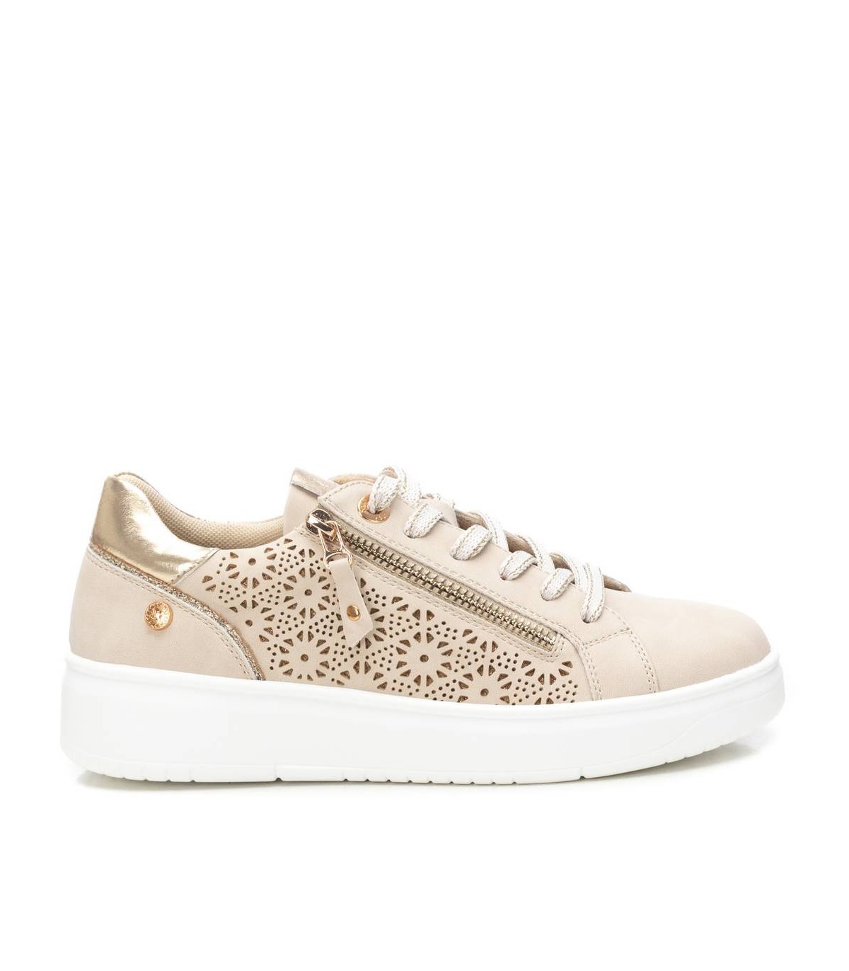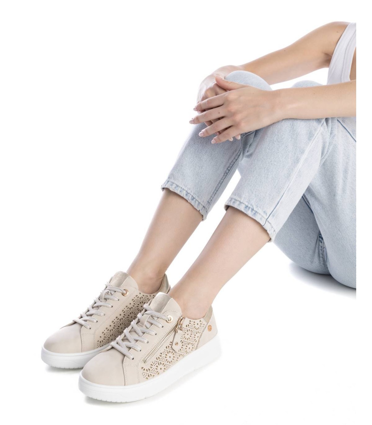 Zapatilla de mujer, de la marca Xti. Fabricada en material que imita a la piel y lateral con pequeño troquelado. Cierre mediante cremallera en el lateral, con cordones decorativos. Bonita suela de goma antideslizante. Con plantilla extraíble. Este modelo ha obtenido el certificado vegano por la organización mundial PETA (Organización de los derechos de los animales).