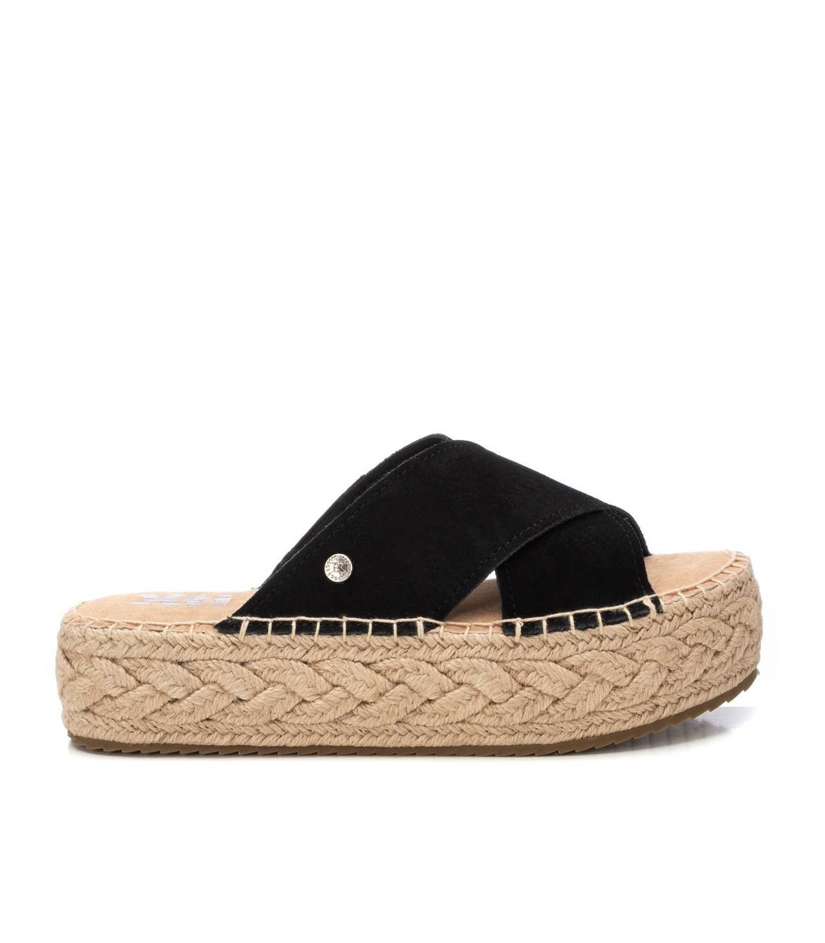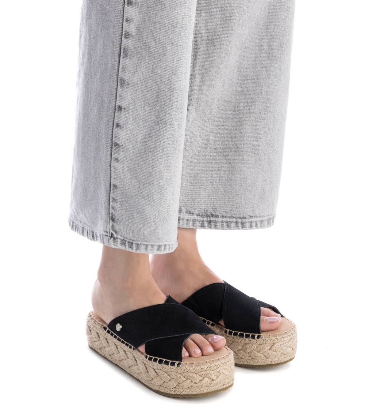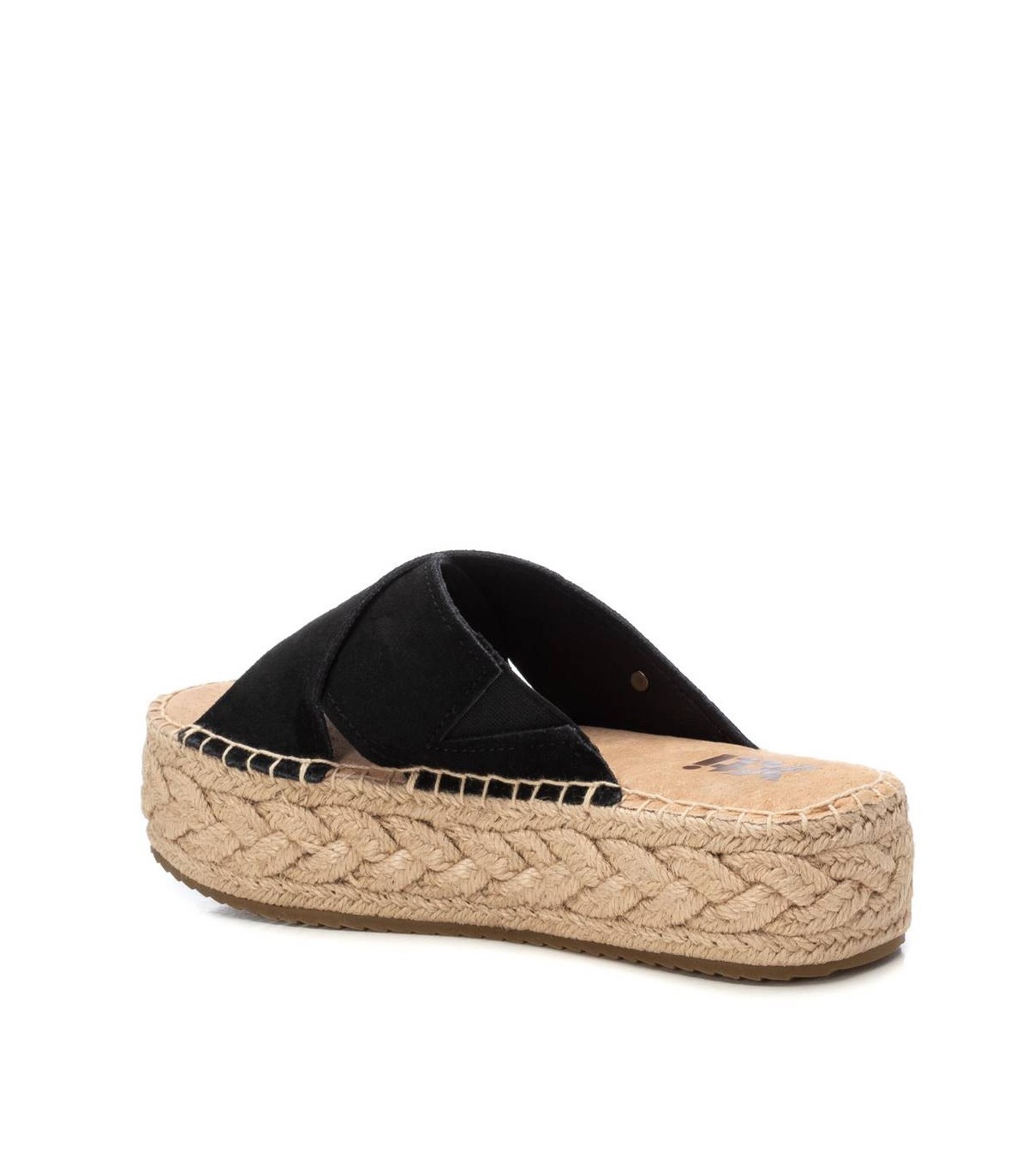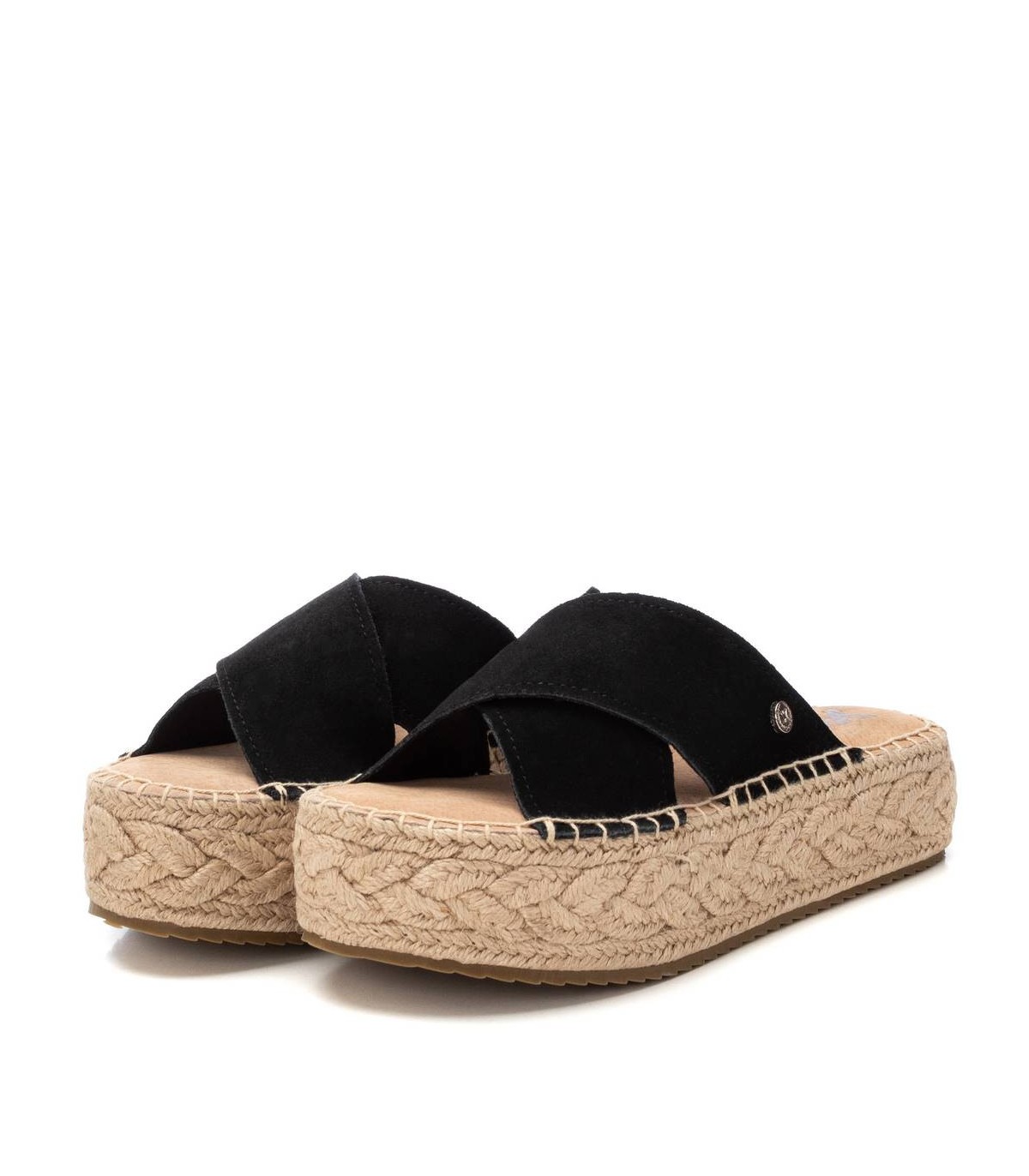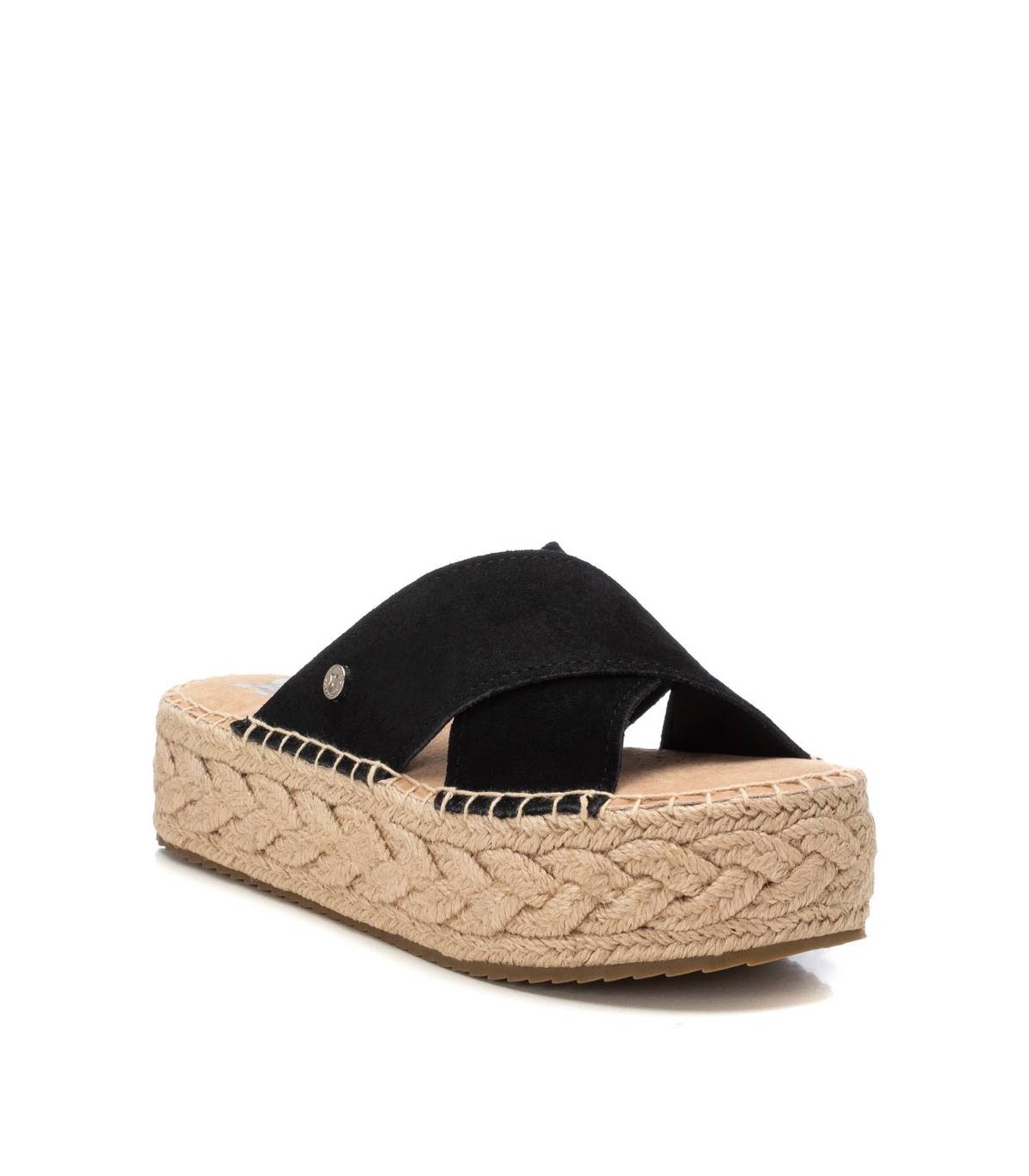 Sandalia con plataforma, de la marca Xti. Fabricada en serraje. Diseño de pala ancha cruzada con plataforma de yute y suela de goma antideslizante. Combínala con tus looks de esta temporada.