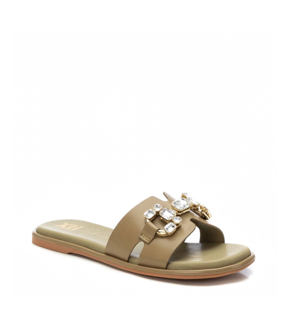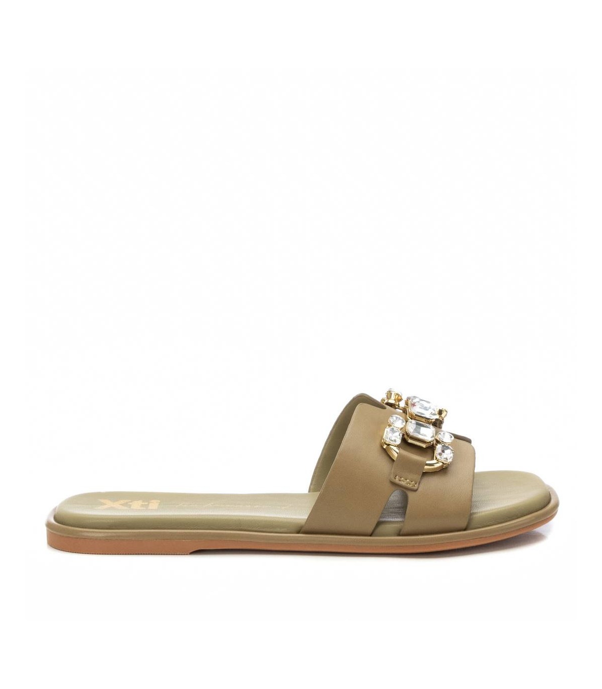 Sandalia plana de mujer, de la marca Xti. Fabricada en suave material que imita la piel, de alta calidad, con diseño de pala y detalle metálico. Suela de goma antideslizante. Este modelo ha obtenido el certificado vegano por la organización mundial PETA (Organización de los derechos de los animales).