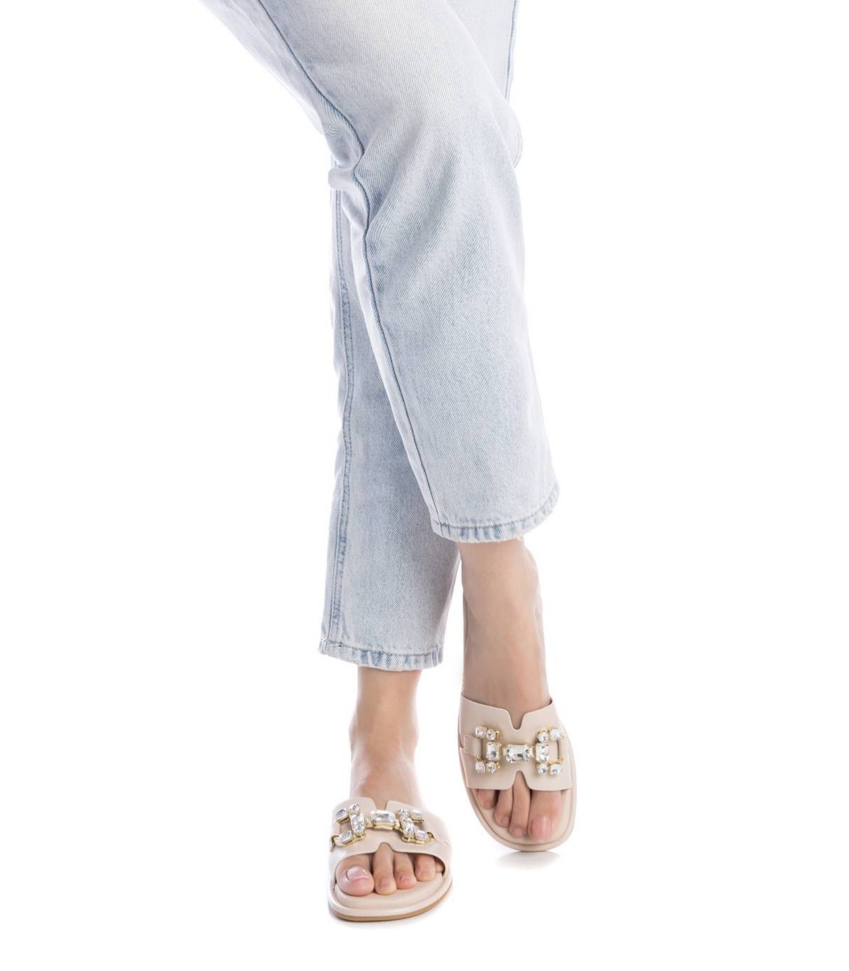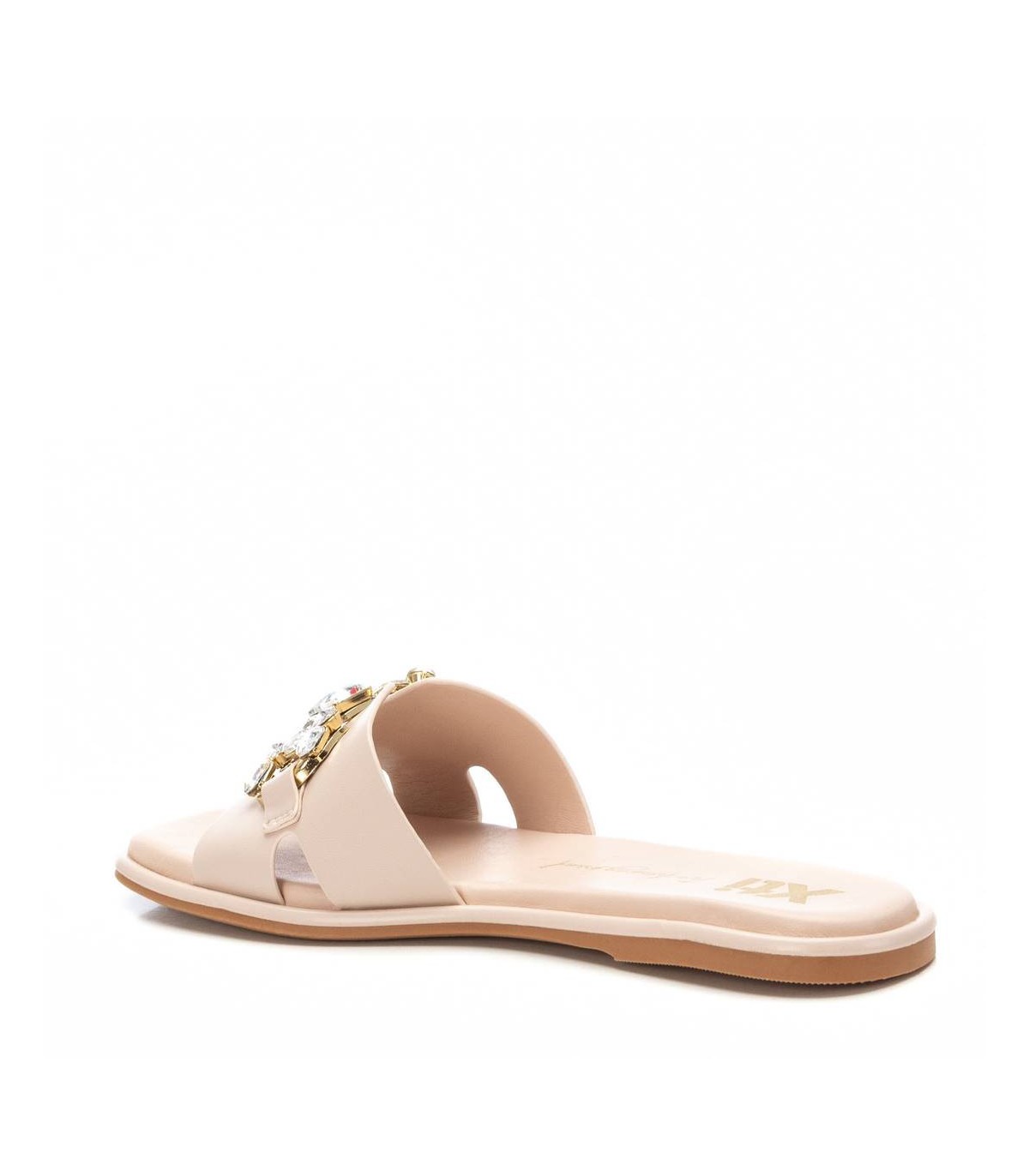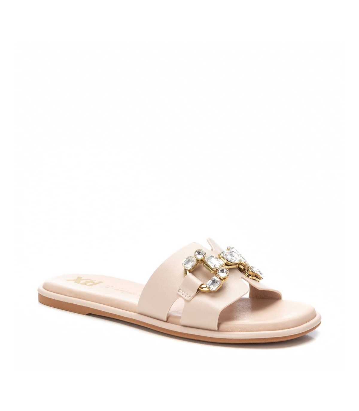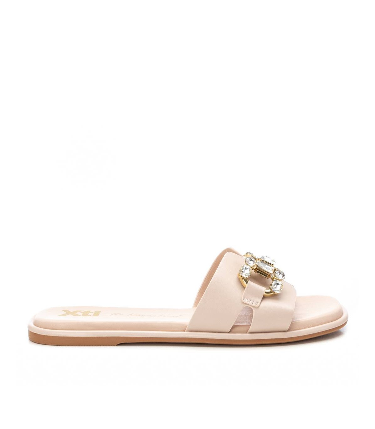 Sandalia plana de mujer, de la marca Xti. Fabricada en suave material que imita la piel, de alta calidad, con diseño de pala y detalle metálico. Suela de goma antideslizante. Este modelo ha obtenido el certificado vegano por la organización mundial PETA (Organización de los derechos de los animales).