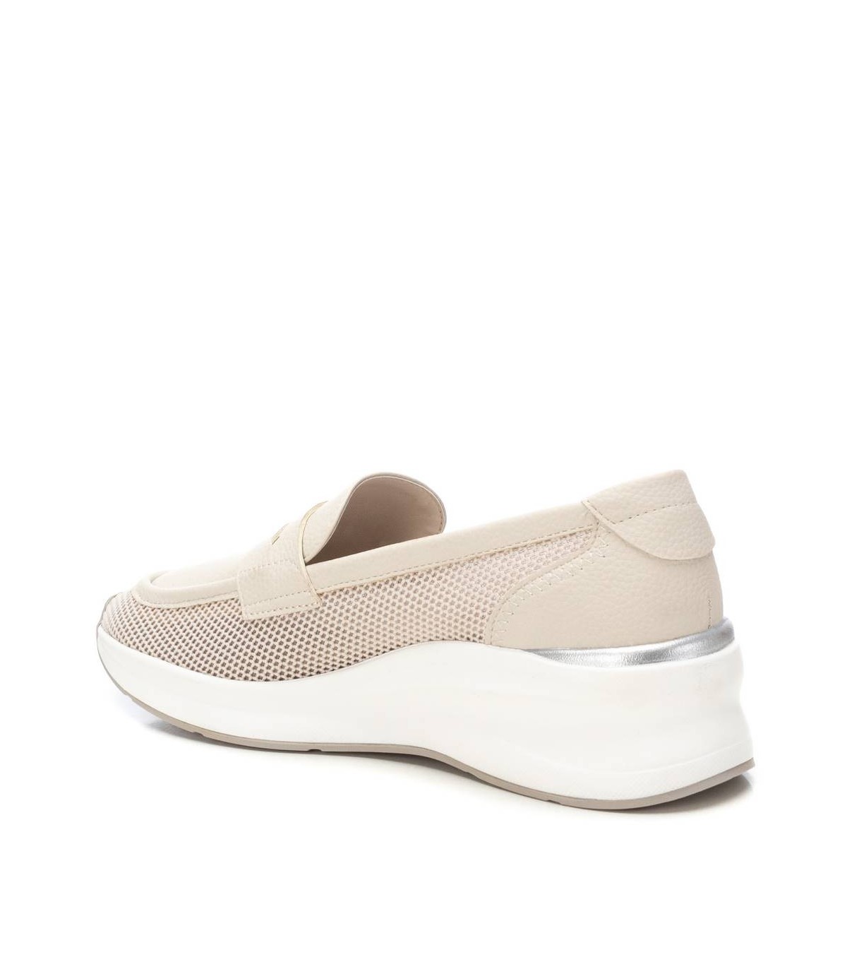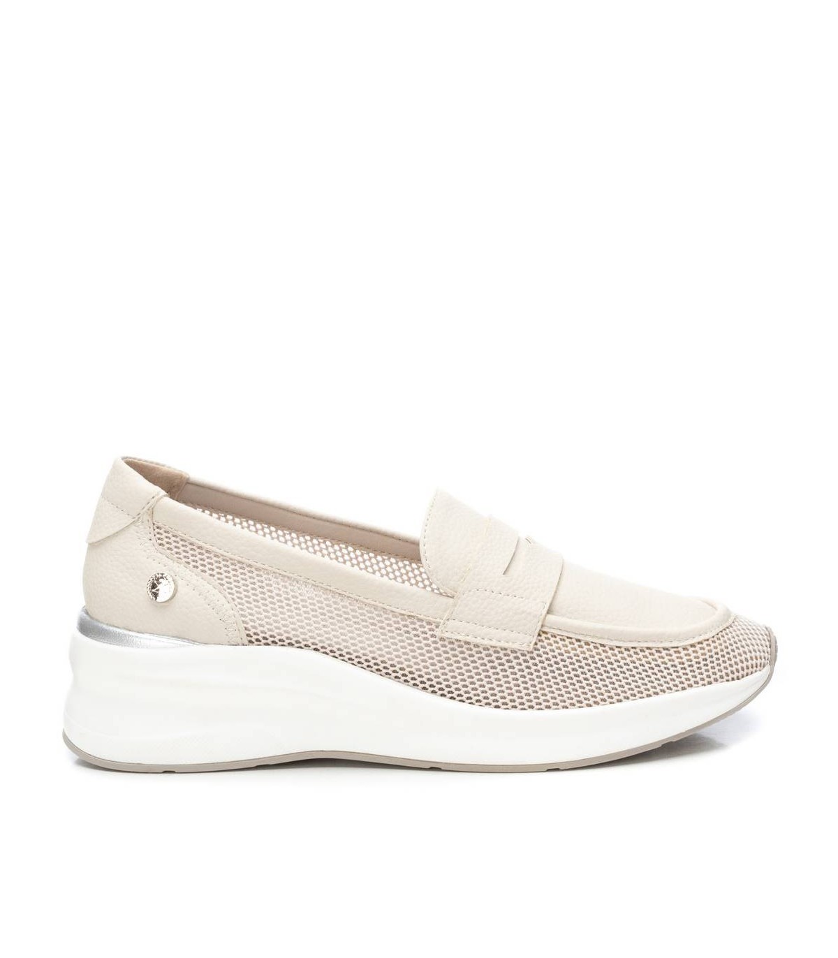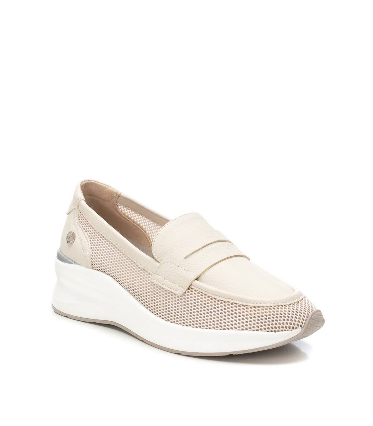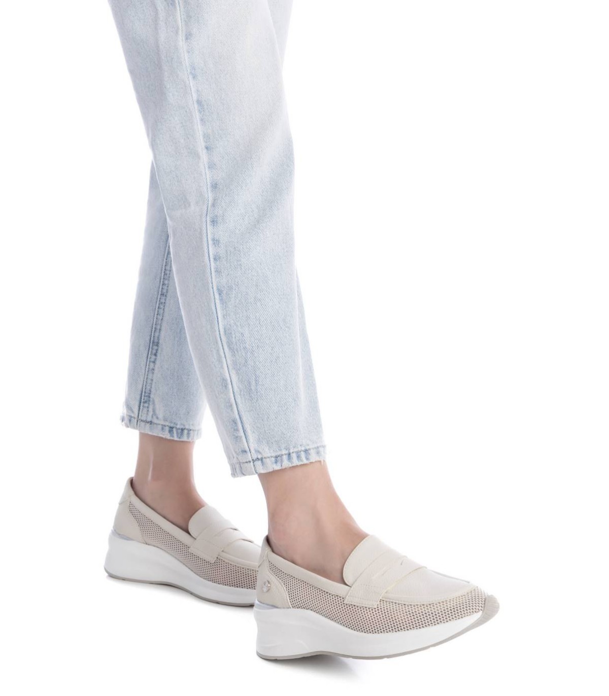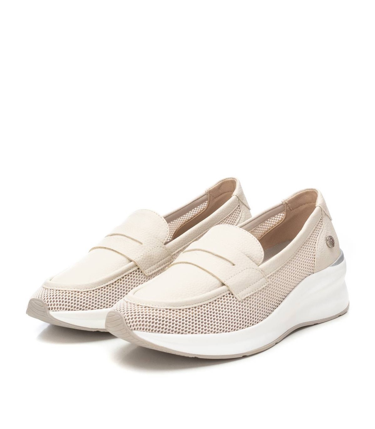 Mocasín de mujer, de la marca Xti. Fabricado en material textil combinado con material que imita la piel. Suela deportiva, con la cual se crea de un modelo clásico, algo innovador, cómodo y elegante. Este modelo ha obtenido el certificado vegano por la organización mundial PETA (Organización de los derechos de los animales).