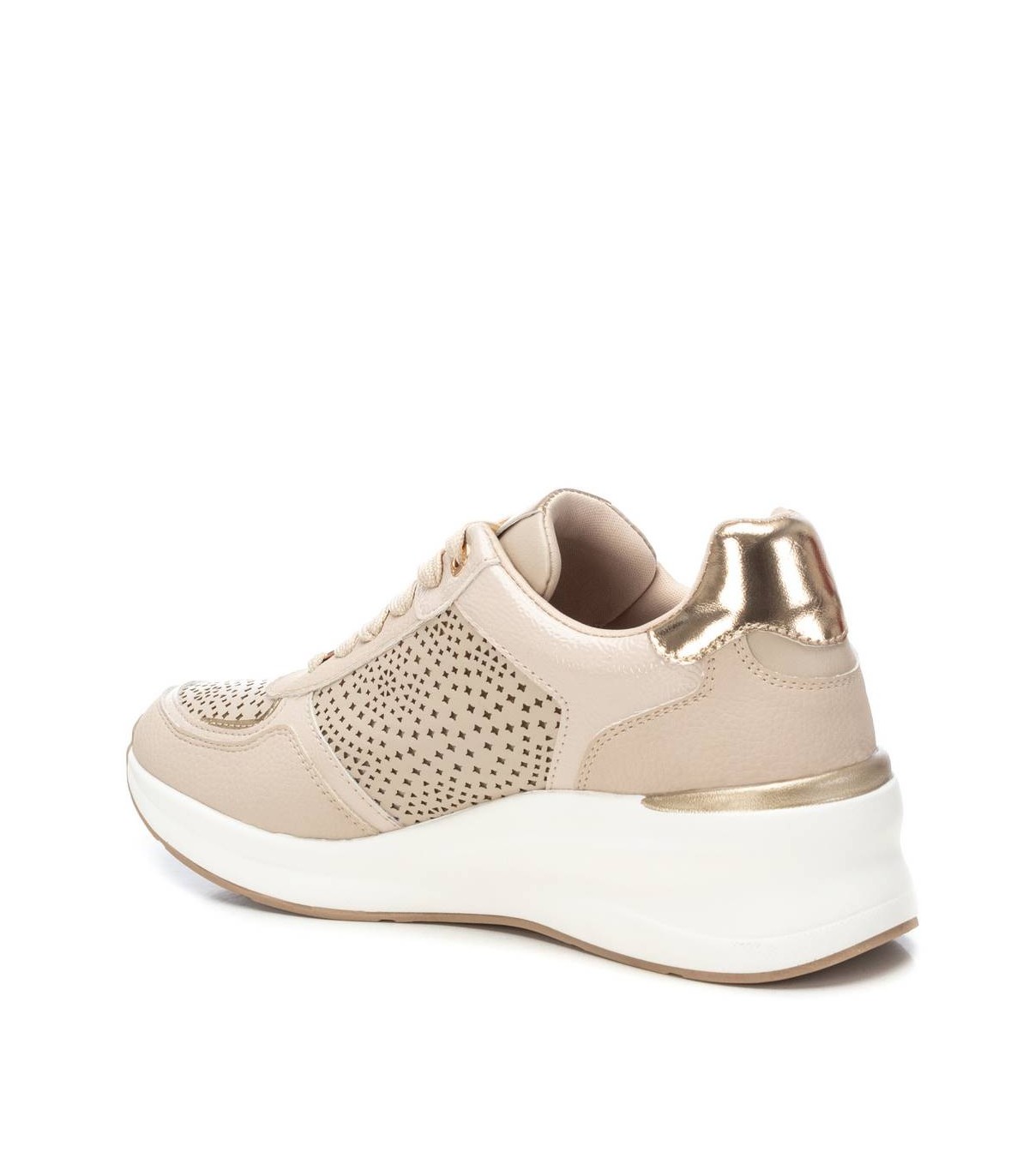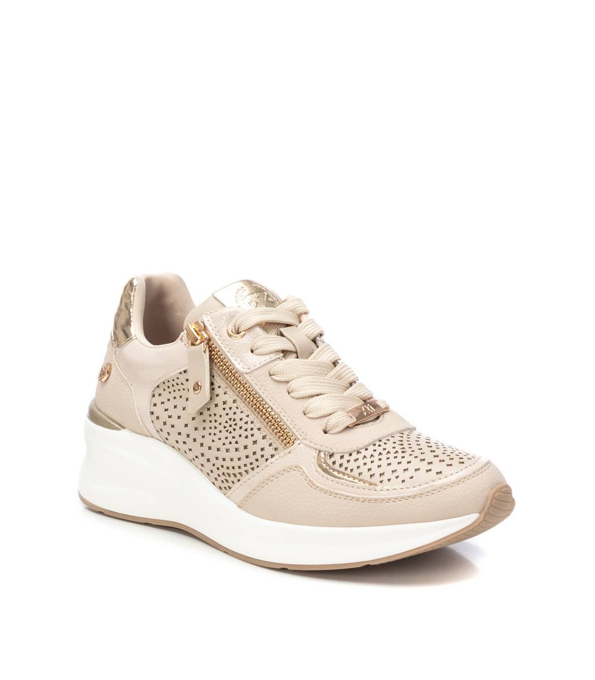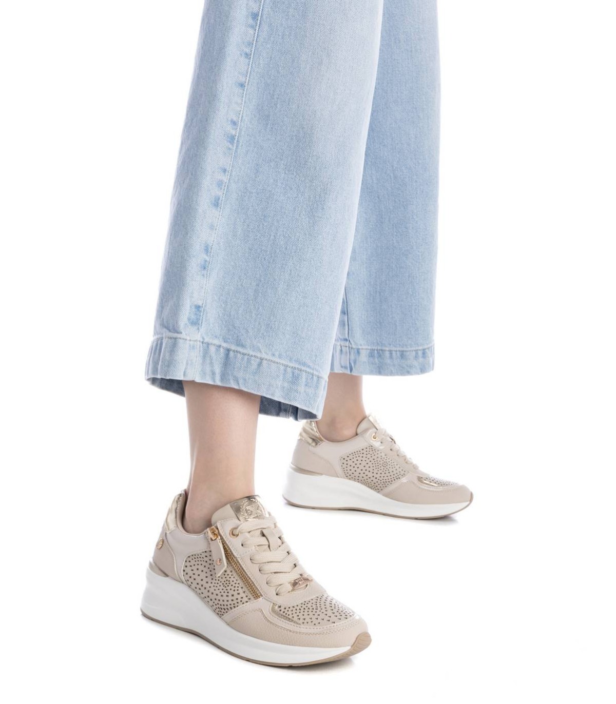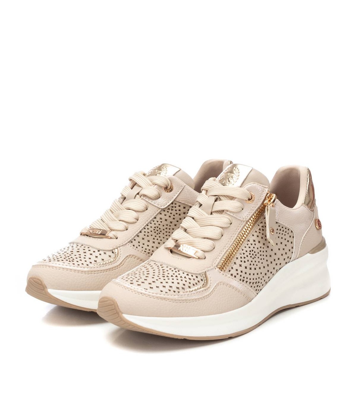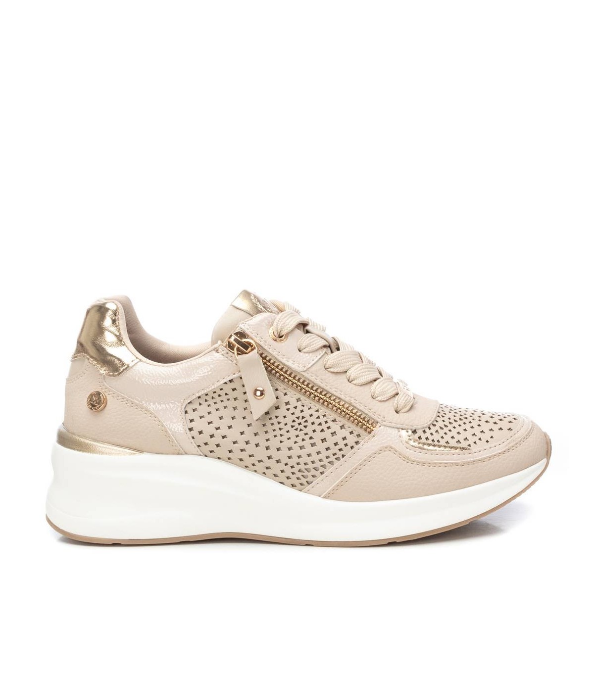 Zapatilla de mujer, de la marca Xti. Fabricada en material que imita la piel, combinada con charol y detalles metalizados.
