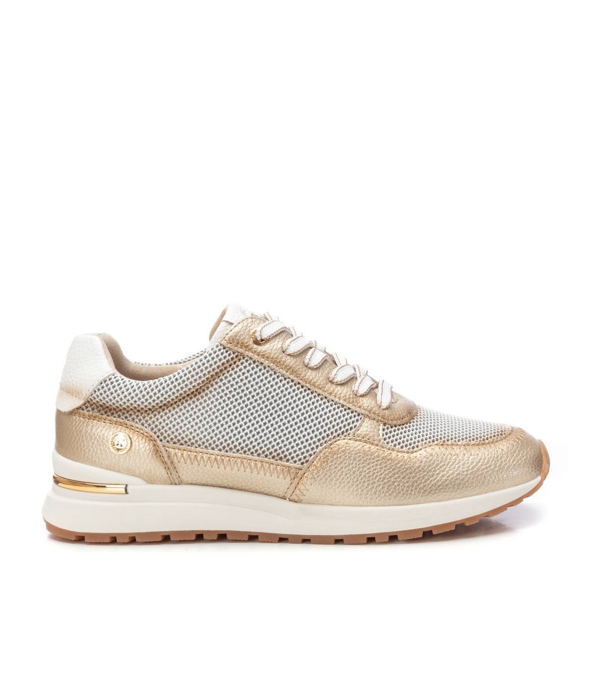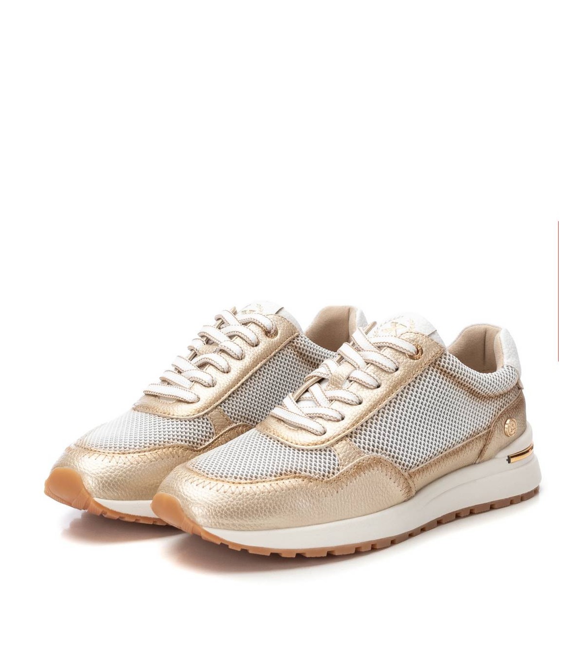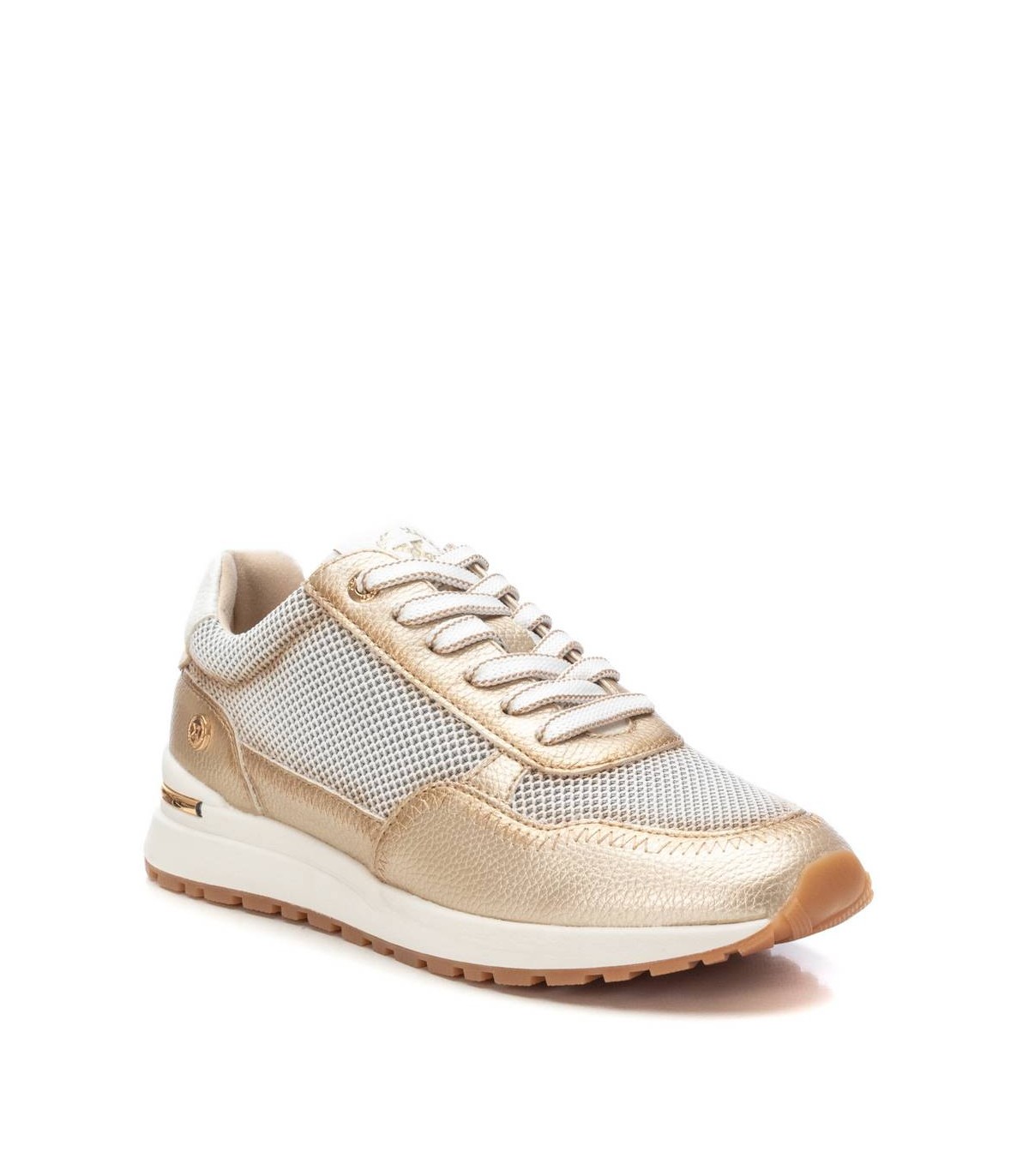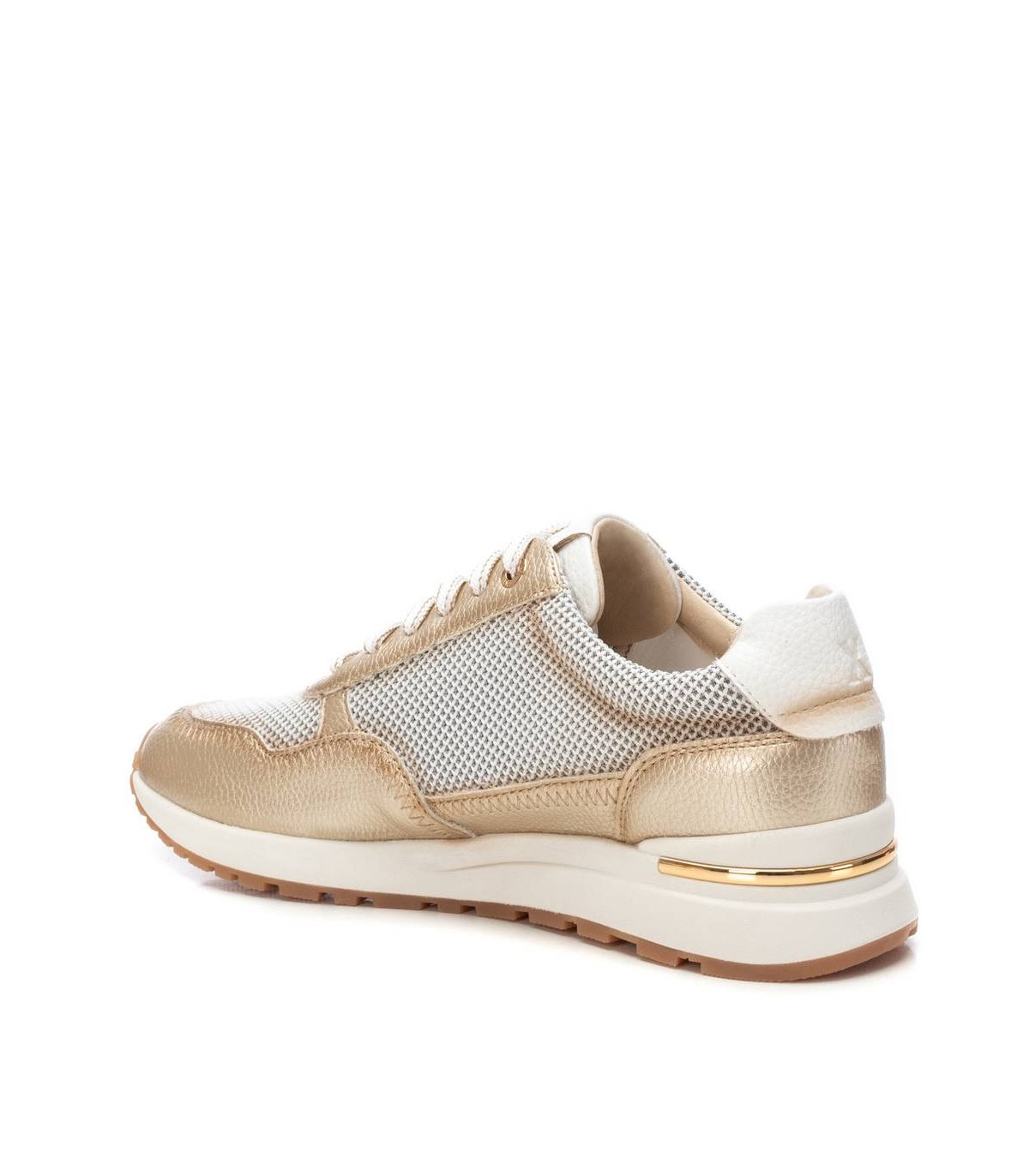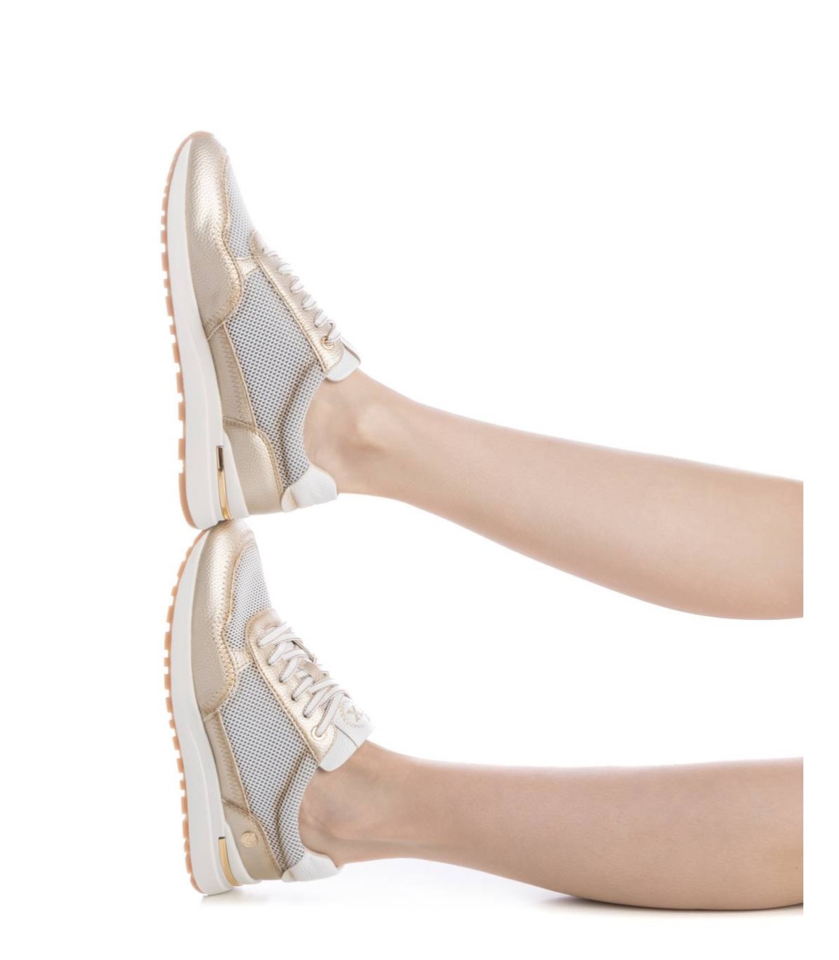 Zapatilla de mujer, de la marca Xti. Fabricada en material que imita la piel con efecto metalizado combinado con material textil de rejilla. Cierre mediante cordones. Suela de goma antideslizante con detalle metálico en el talón. Con plantilla extraíble. Este modelo ha obtenido el certificado vegano por la organización mundial PETA (Organización de los derechos de los animales).