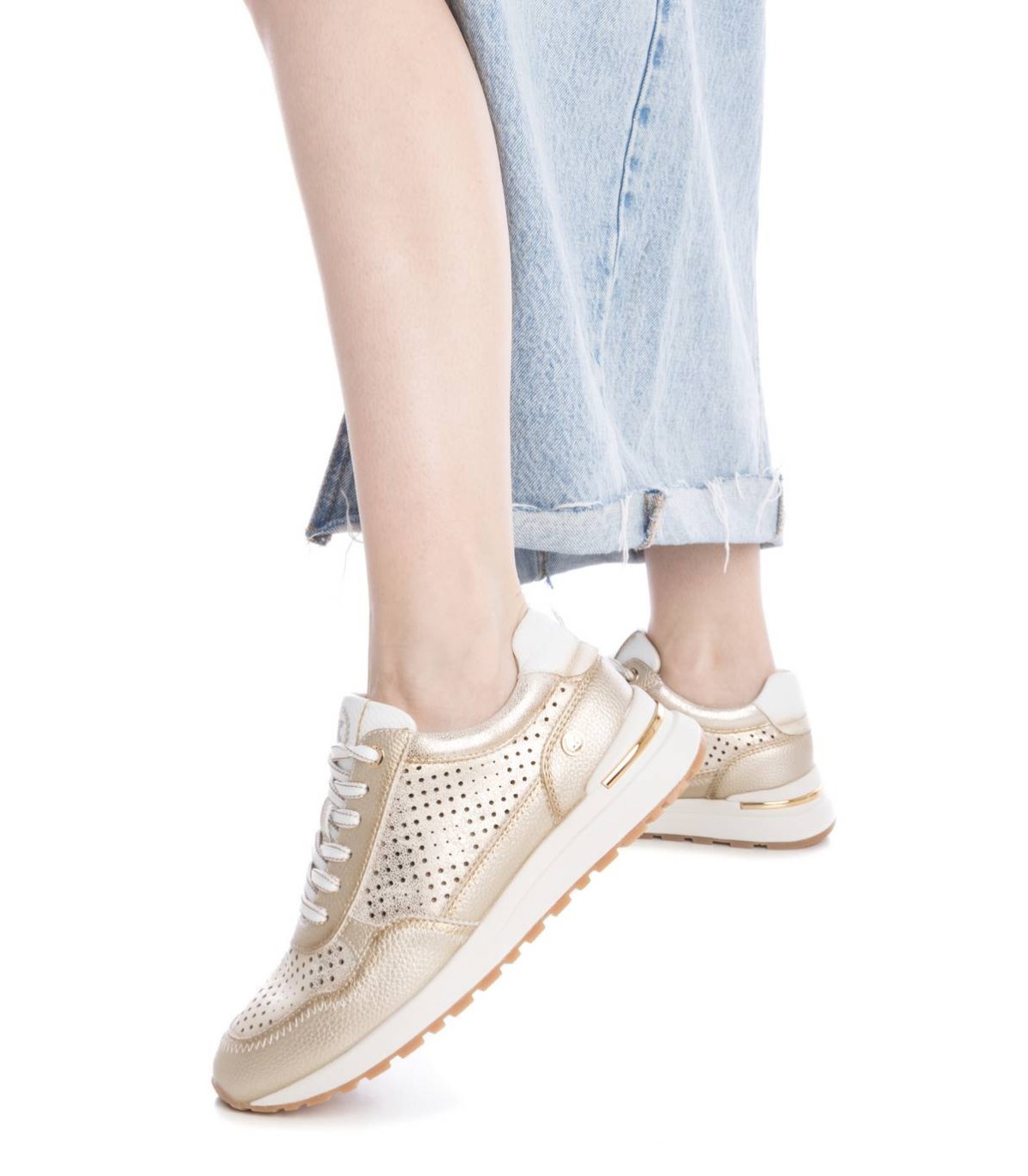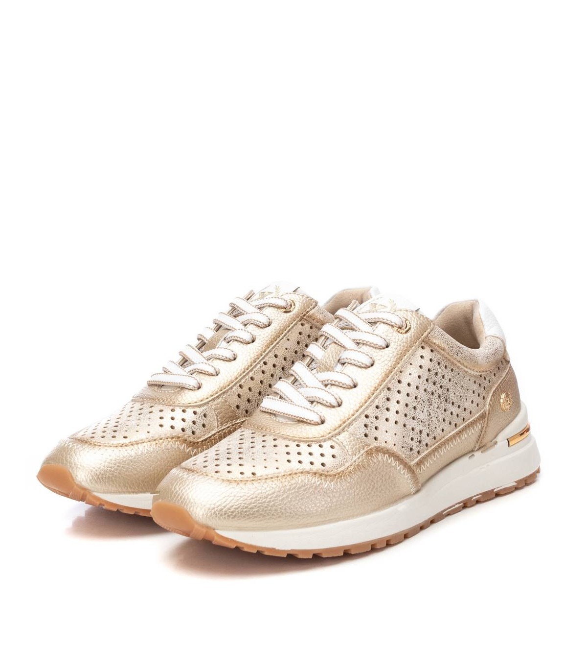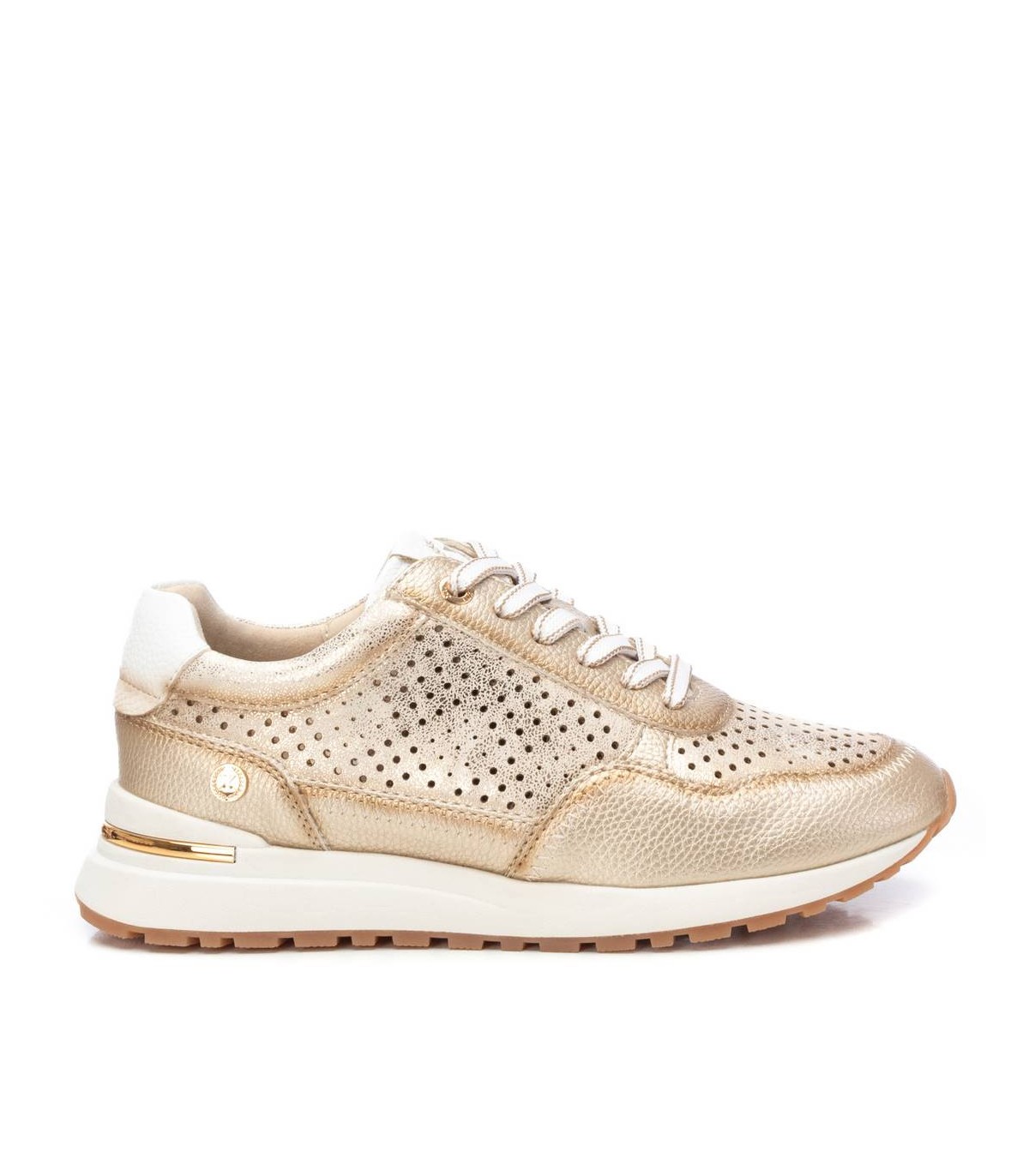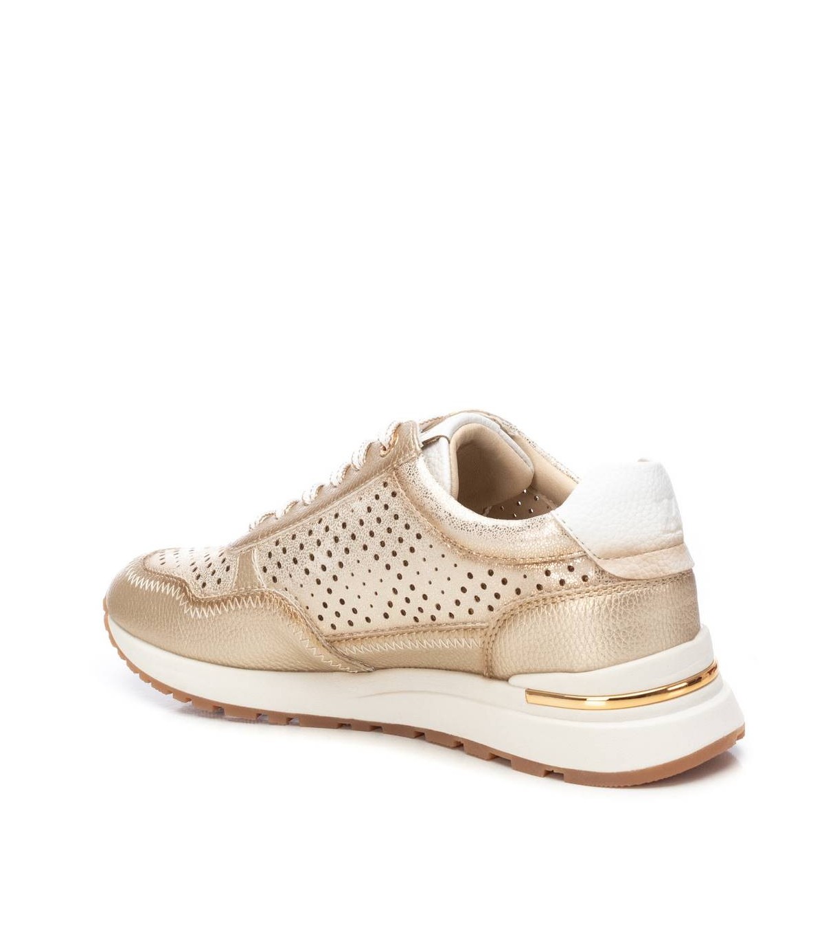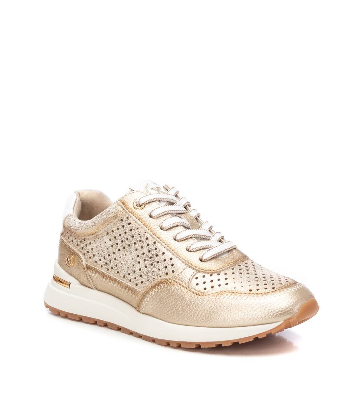 Zapatilla de mujer de la marca Xti. Fabricada en material que imita la piel. Diseño de troquelado en lateral y puntera. Cierre con cordoneras. Suela antideslizante y con detalle metalizado en el talón. Con plantilla extraíble. Este modelo ha obtenido el certificado vegano por la organización mundial PETA (Organización de los derechos de los animales).