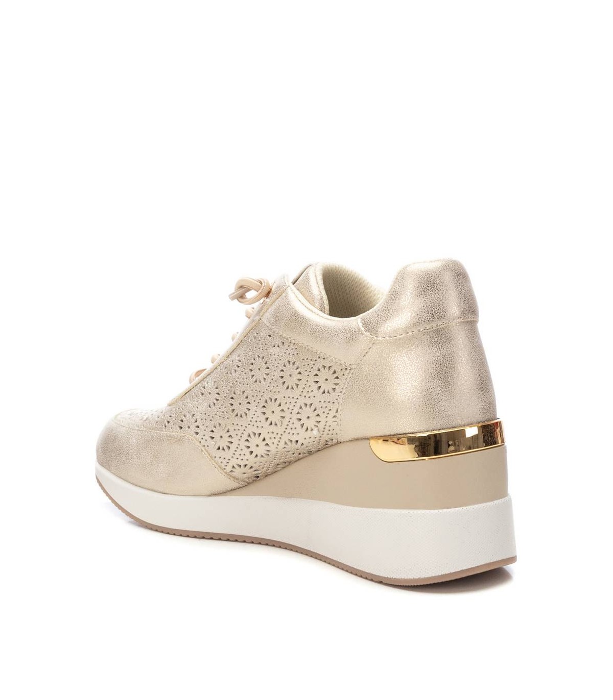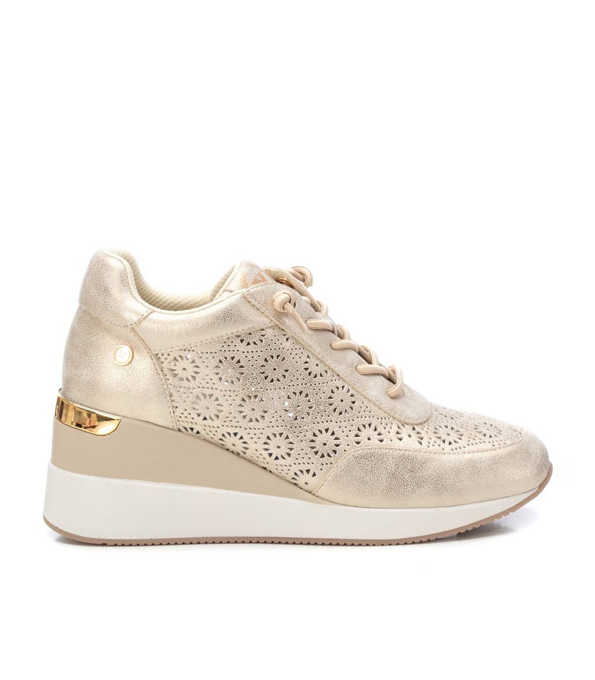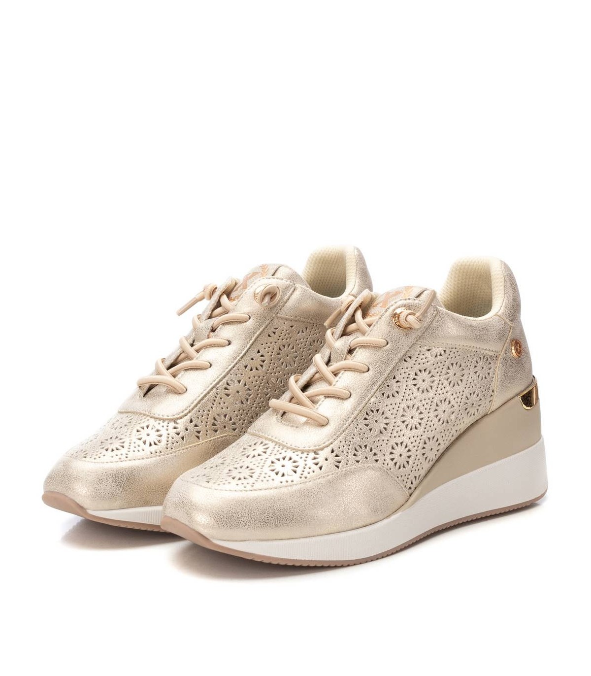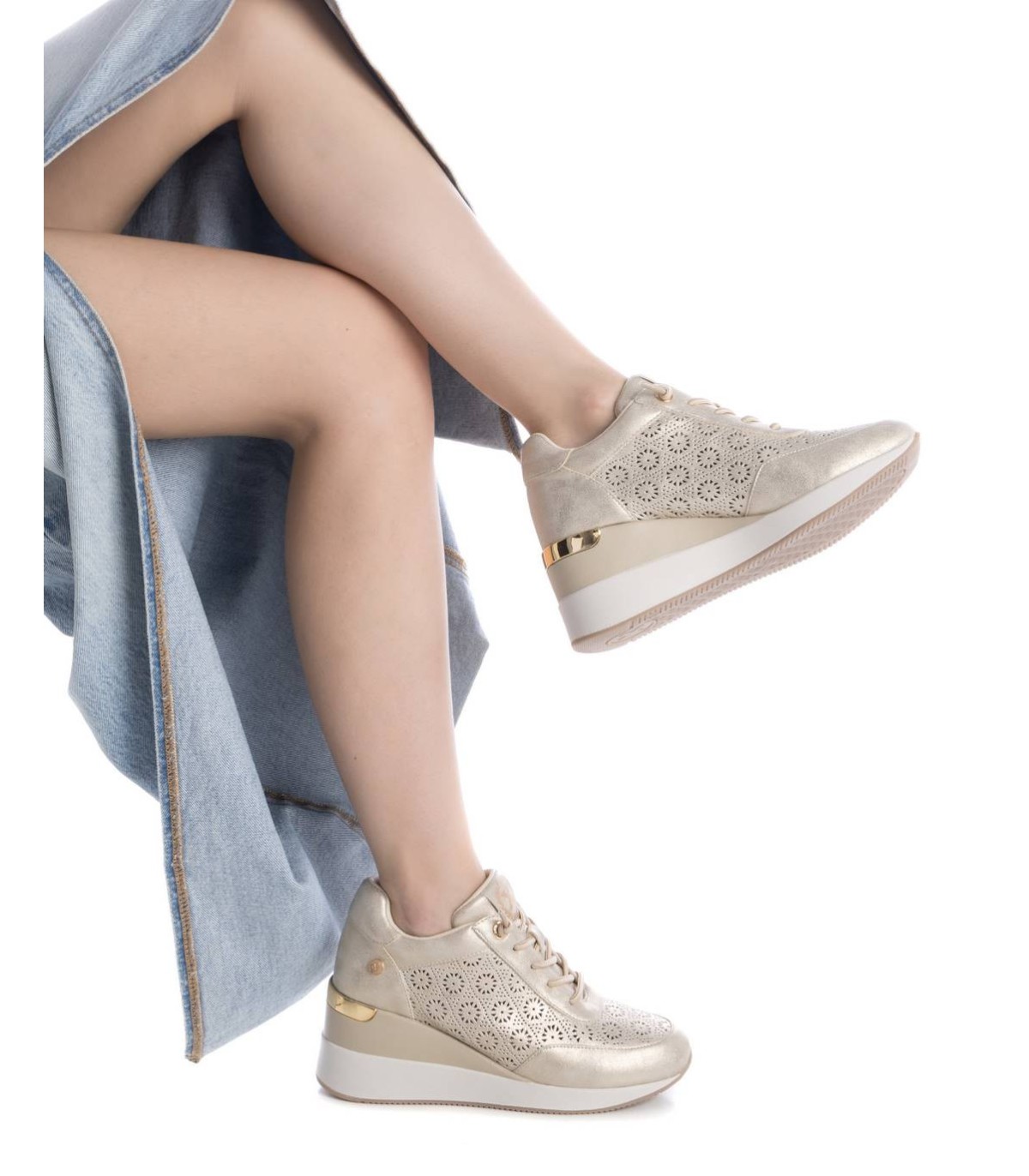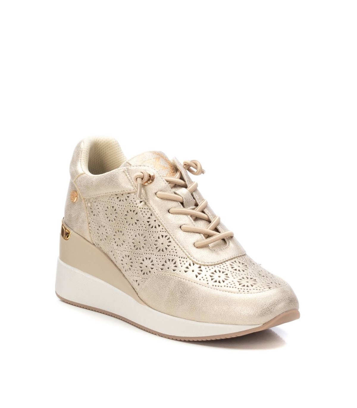 Zapatilla de mujer, de la marca Xti. Fabricada en material metalizado que imita la piel con detalle de troquelado decorativo. Cierre mediante cordones ajustables. Con plantilla extraíble. Cuña con suela de goma antideslizante. Ideal para aportar unos cm sin perder comodidad. Este modelo ha obtenido el certificado vegano por la organización mundial PETA (Organización de los derechos de los animales).
