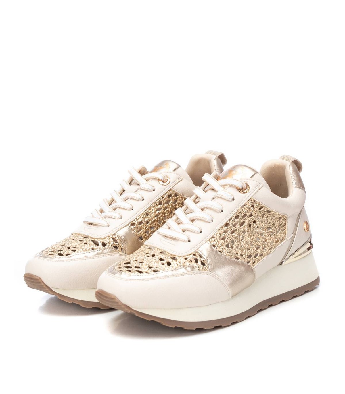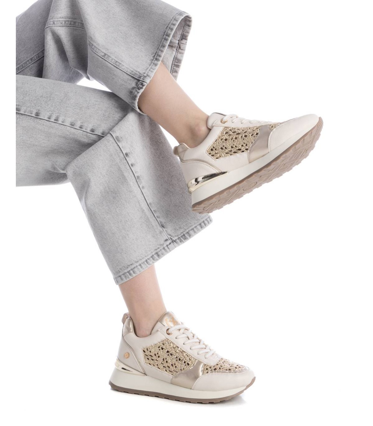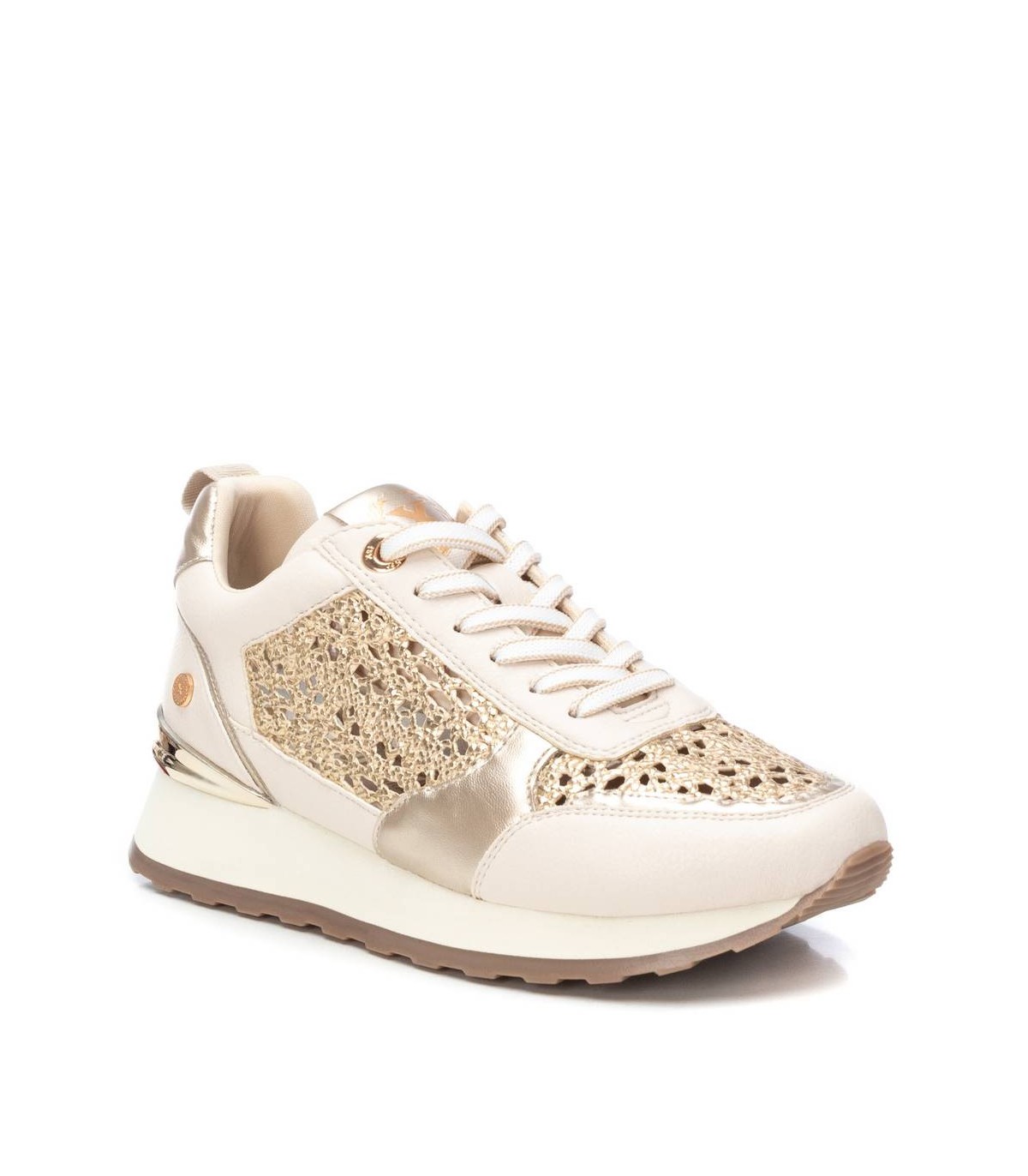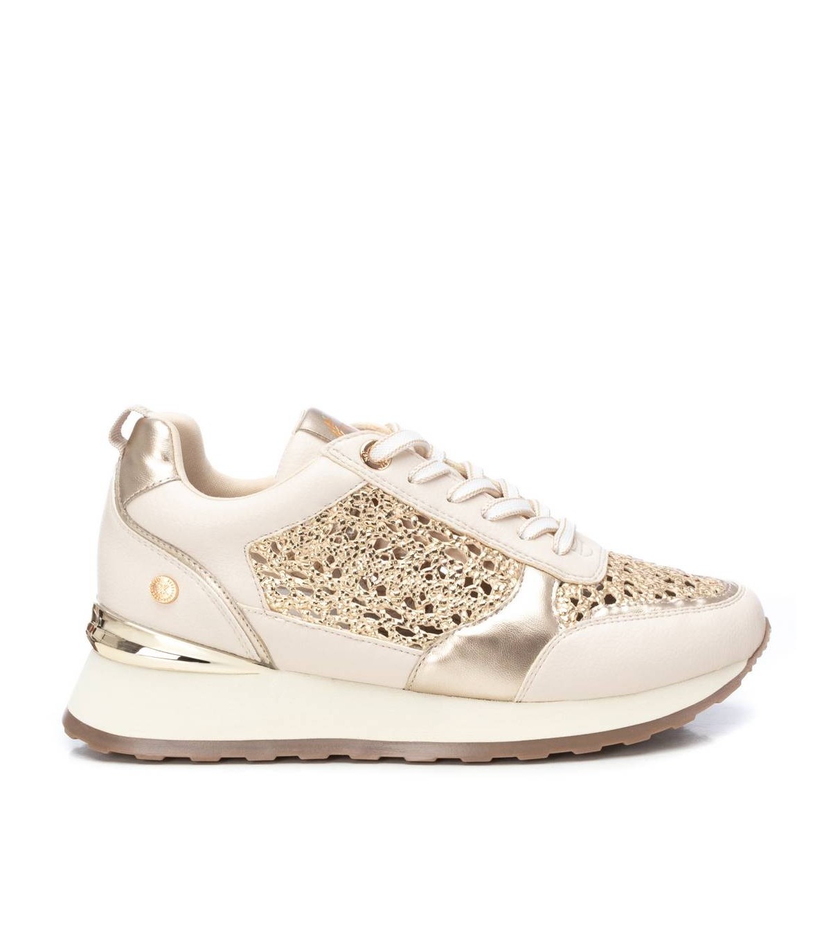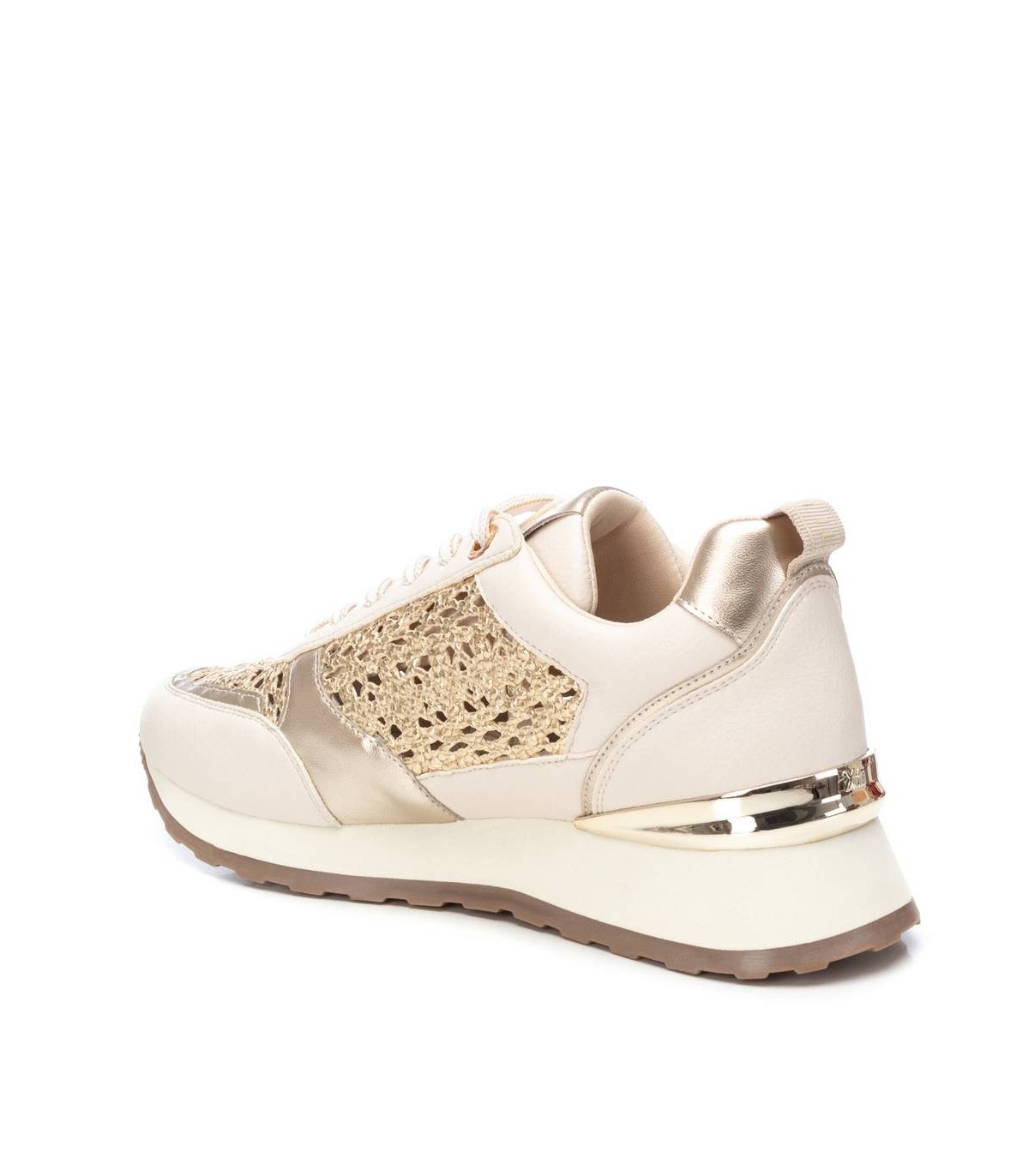 Zapatilla de mujer, de la marca Xti. Fabricadas en material que imita a la piel combinada con piezas y rafia metalizadas. Cierre mediante cordones con detalles al tono de las deportivas. Super cómodas y elegantes para vestir tu día a día. Suela antideslizante con detalle metalizado en el talón. Con plantilla extraíble. Este modelo ha obtenido el certificado vegano por la organización mundial PETA (Organización de los derechos de los animales).
