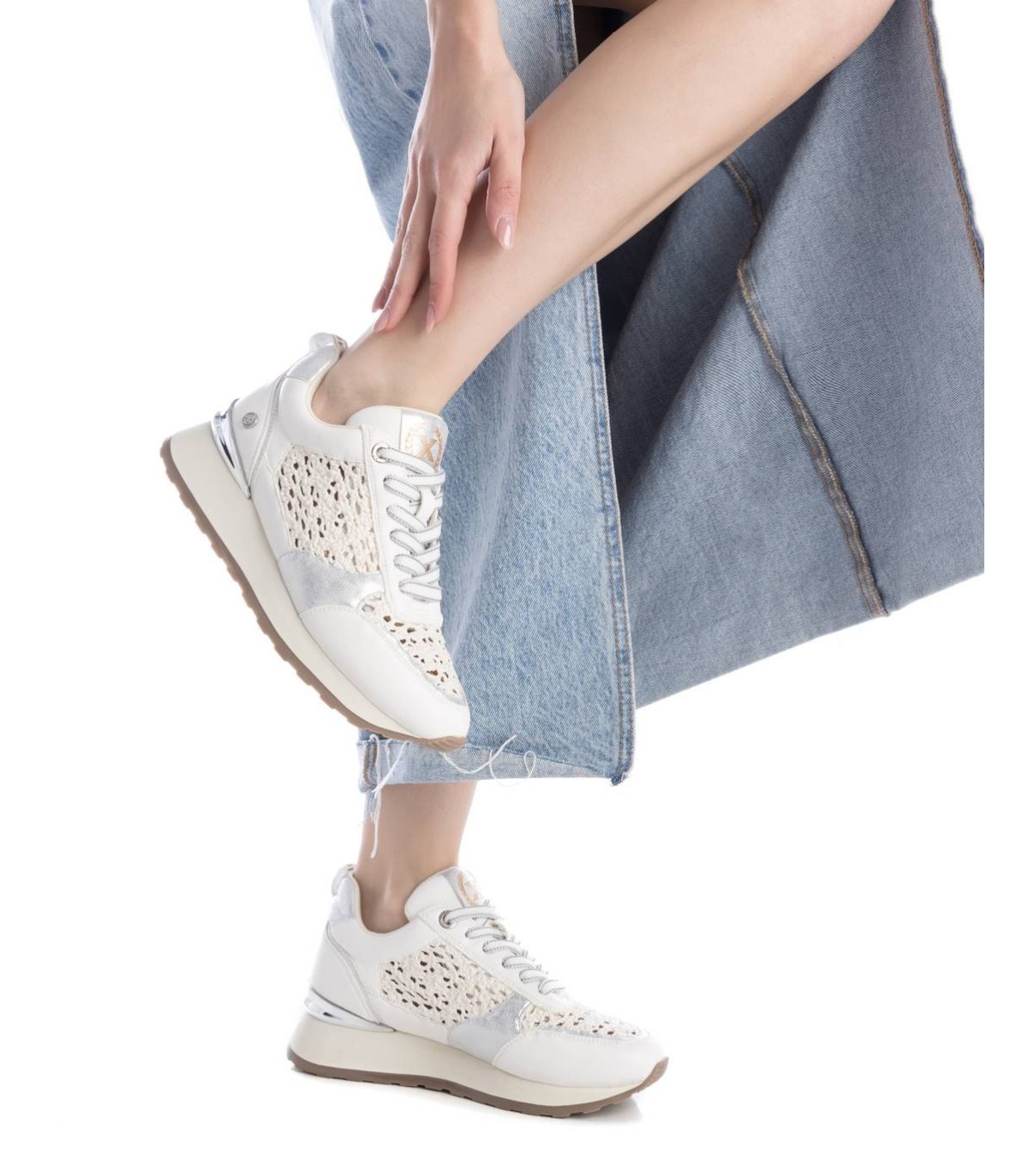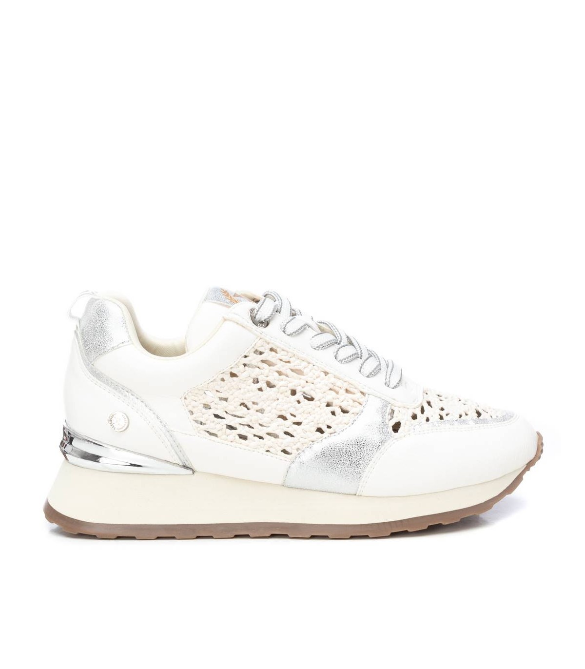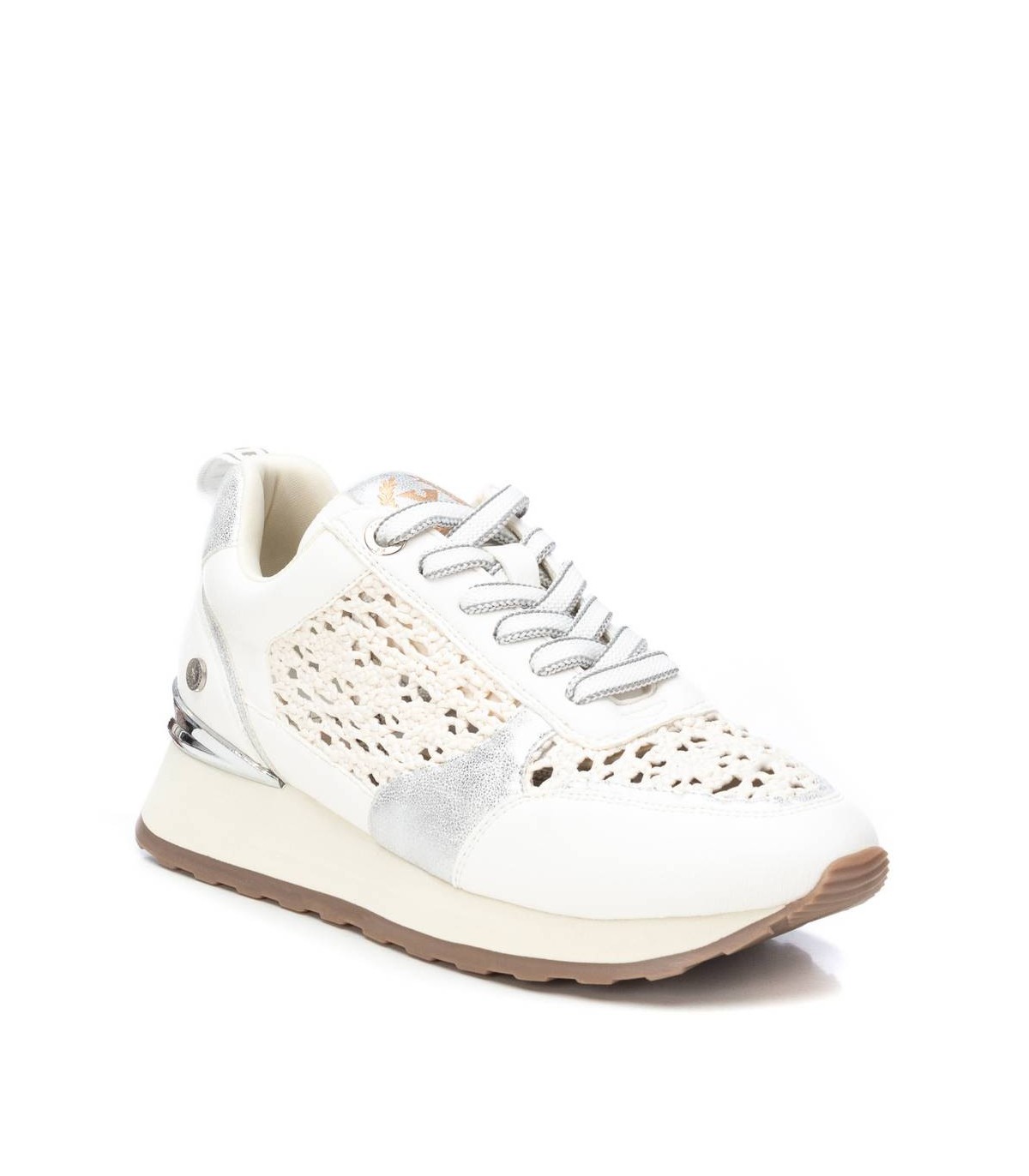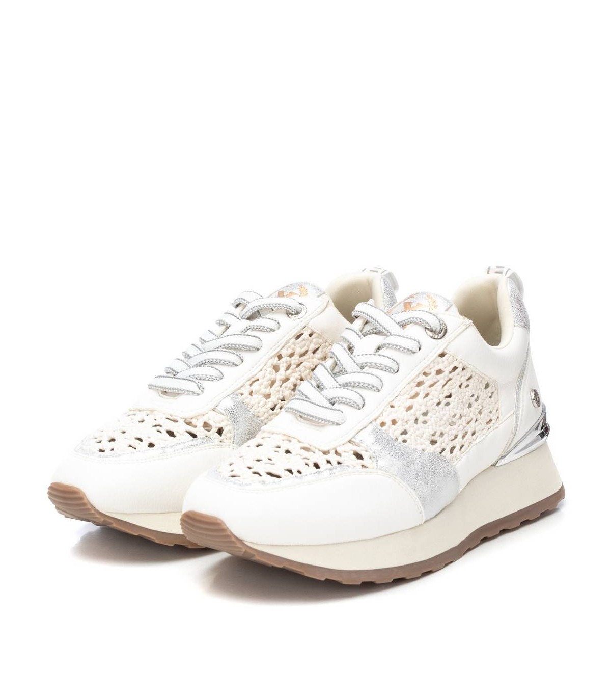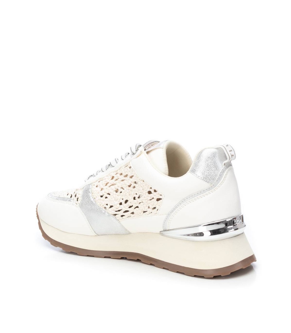 Zapatilla de mujer, de la marca Xti. Fabricadas en material que imita a la piel combinada con piezas y rafia metalizadas.