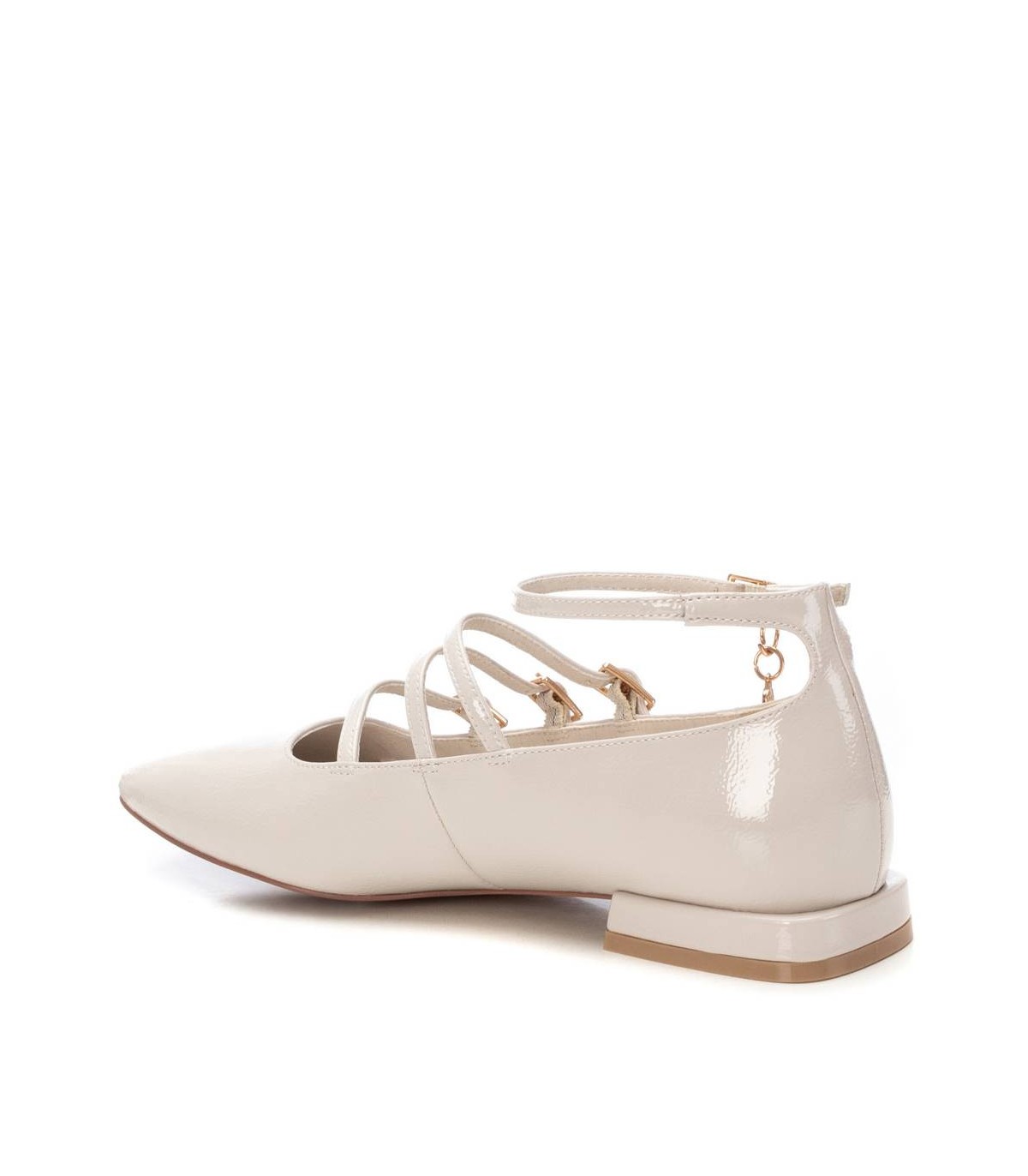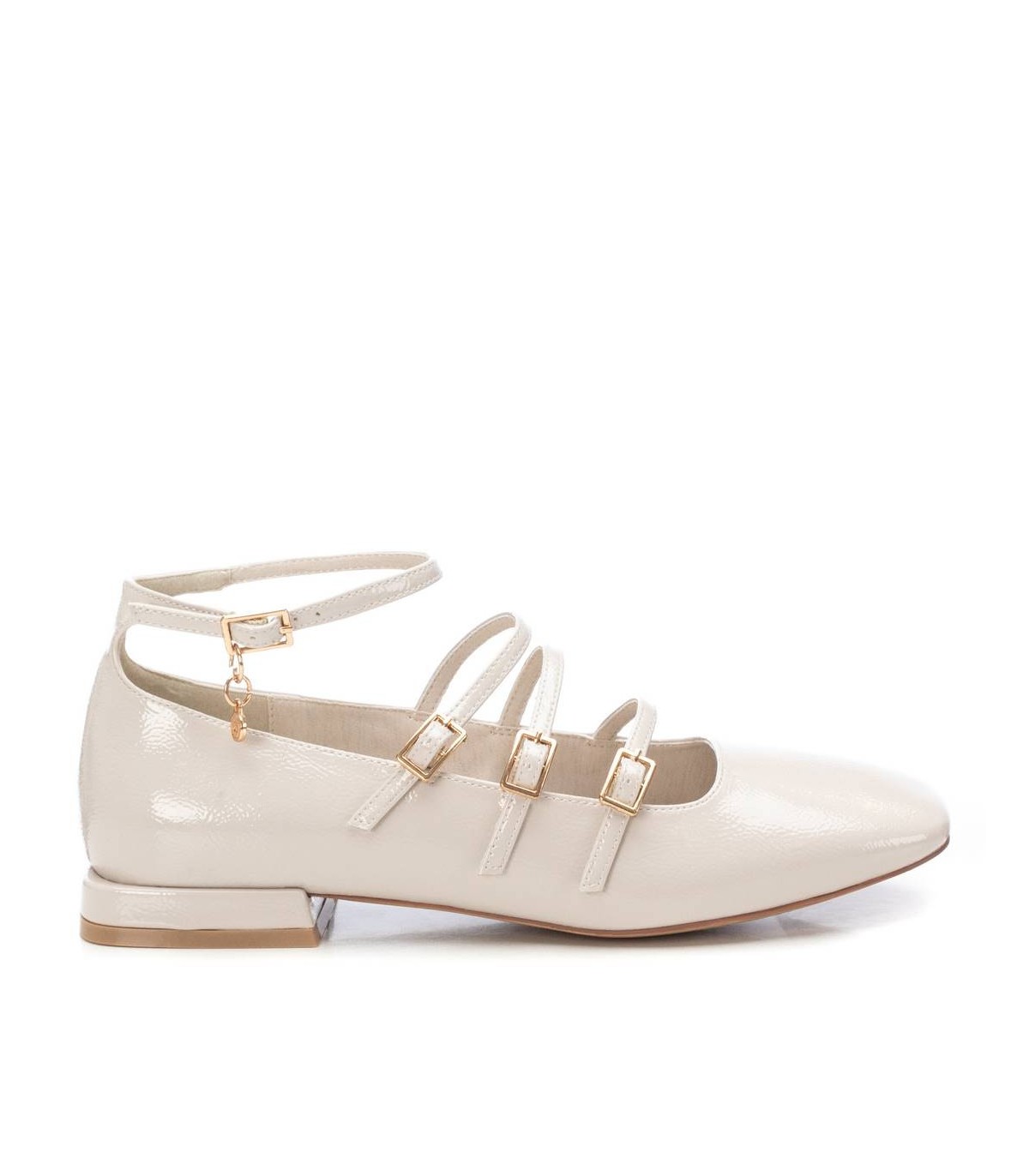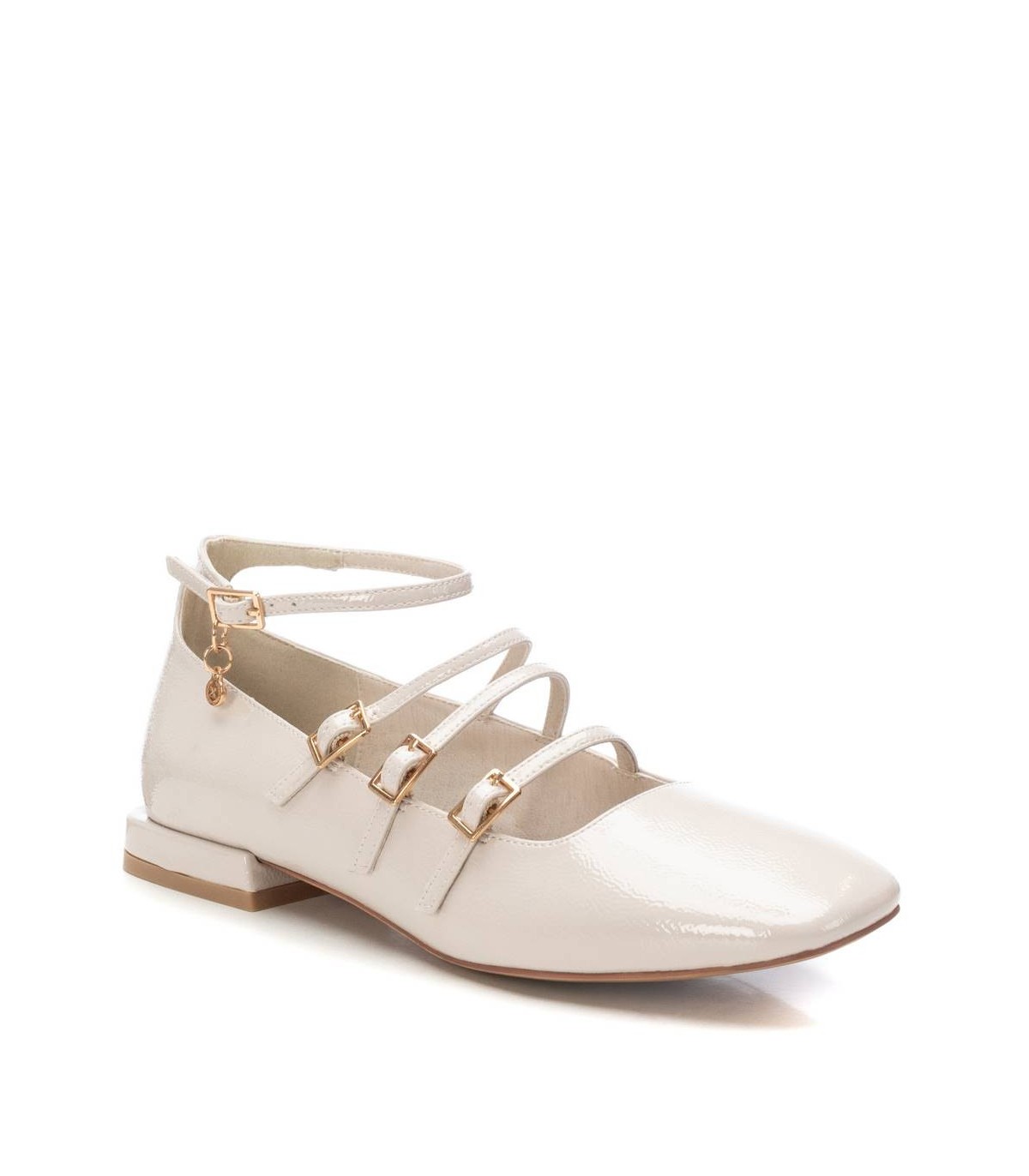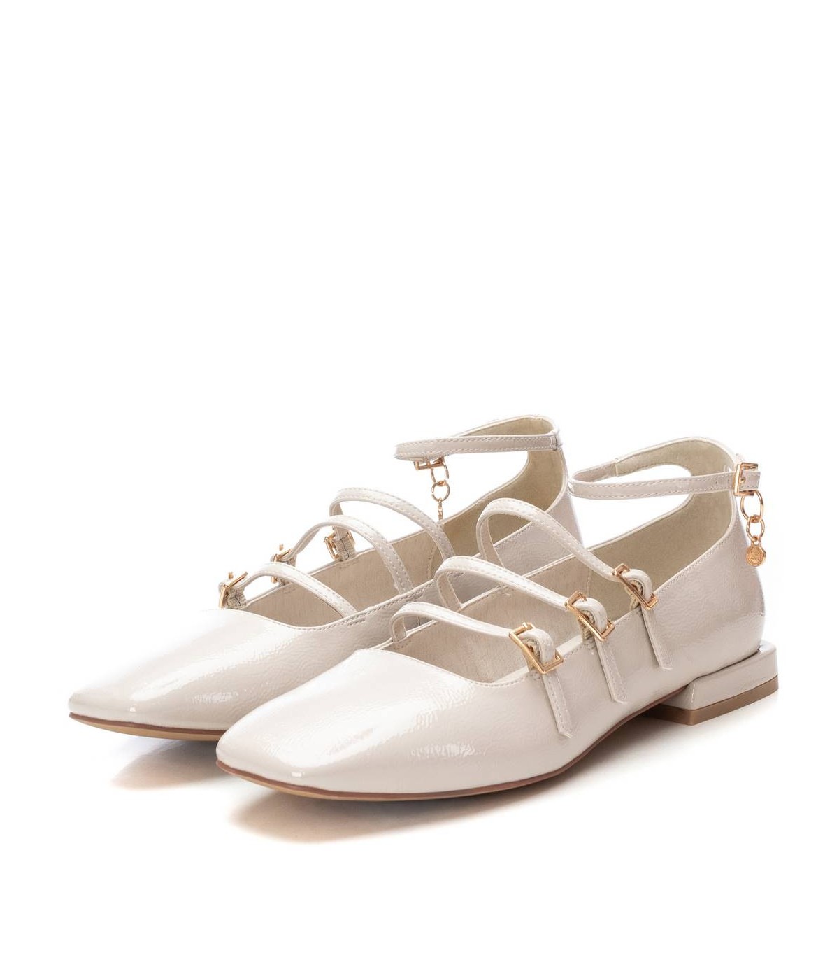 Bailarina de mujer, de la marca Xti. Fabricada en charol. Modelo multitiras con hebillas en color dorado. Tacón bajo y suela de goma antideslizante. Podrás combinarlo tanto para la oficina como para salir arreglada. Ideales para este verano. Este modelo ha obtenido el certificado vegano por la organización mundial PETA (Organización de los derechos de los animales).