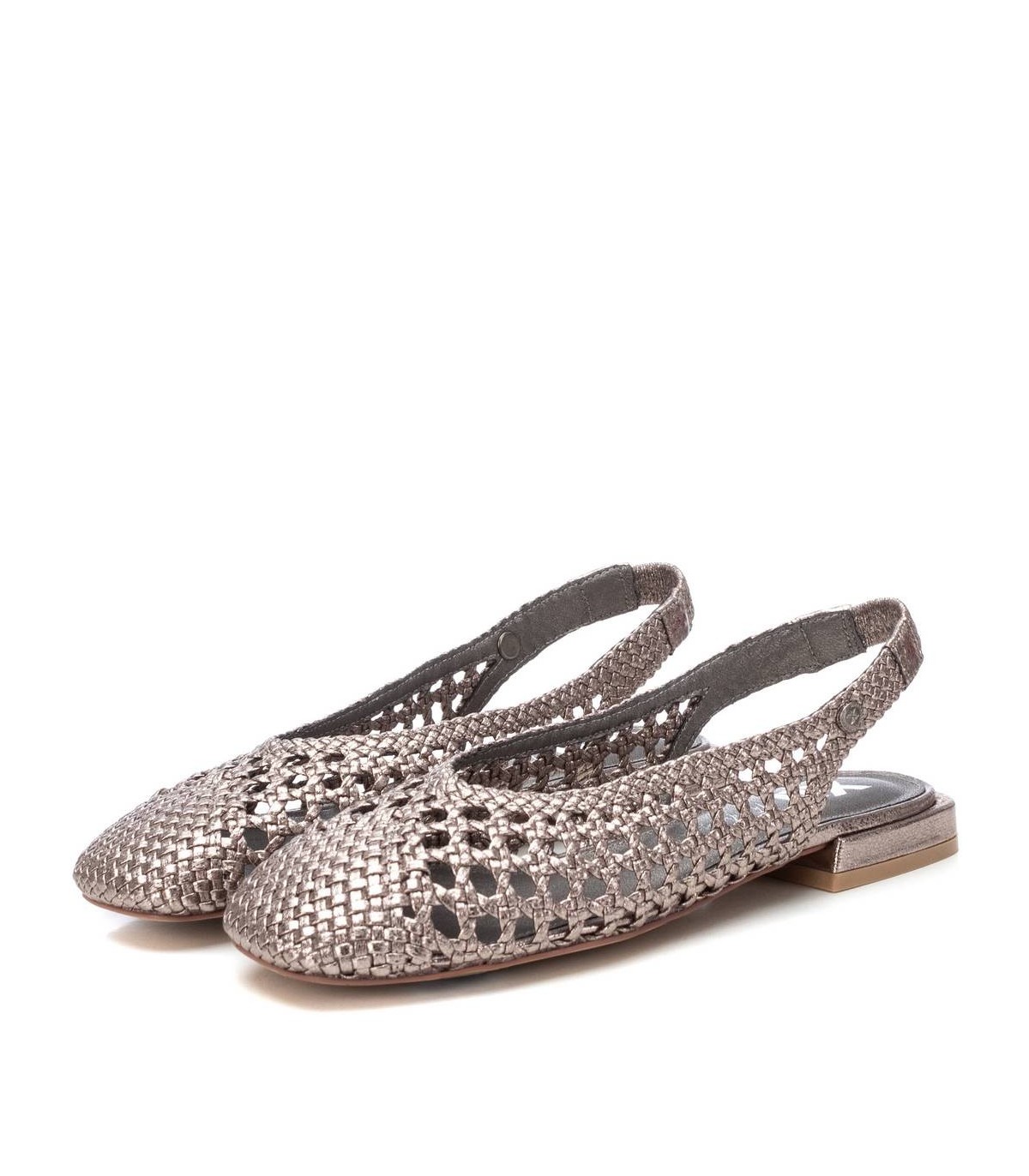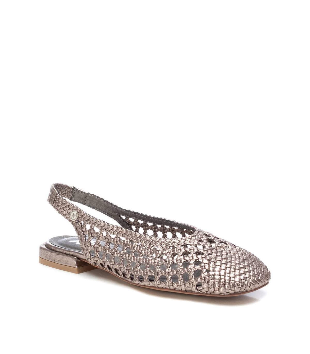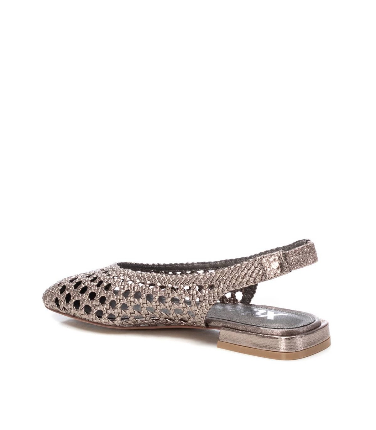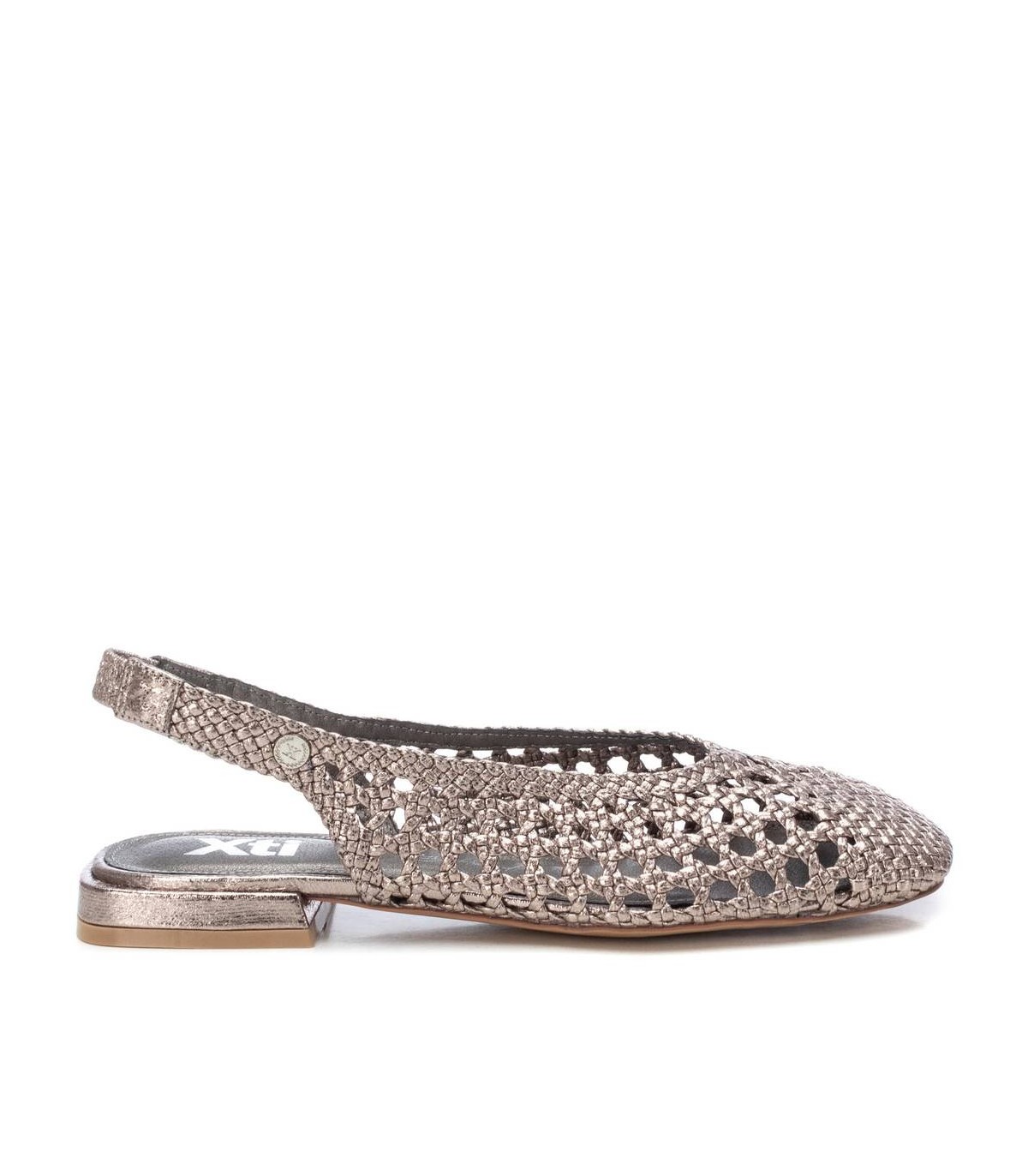 Zapato destalonado de mujer, de la marca Xti. Fabricado en material textil con acabado metalizado. Modelo trenzado con pulsera elástica en el tobillo con muy buena sujeción. Ideal para todos tus conjuntos. Este modelo ha obtenido el certificado vegano por la organización mundial PETA (Organización de los derechos de los animales).