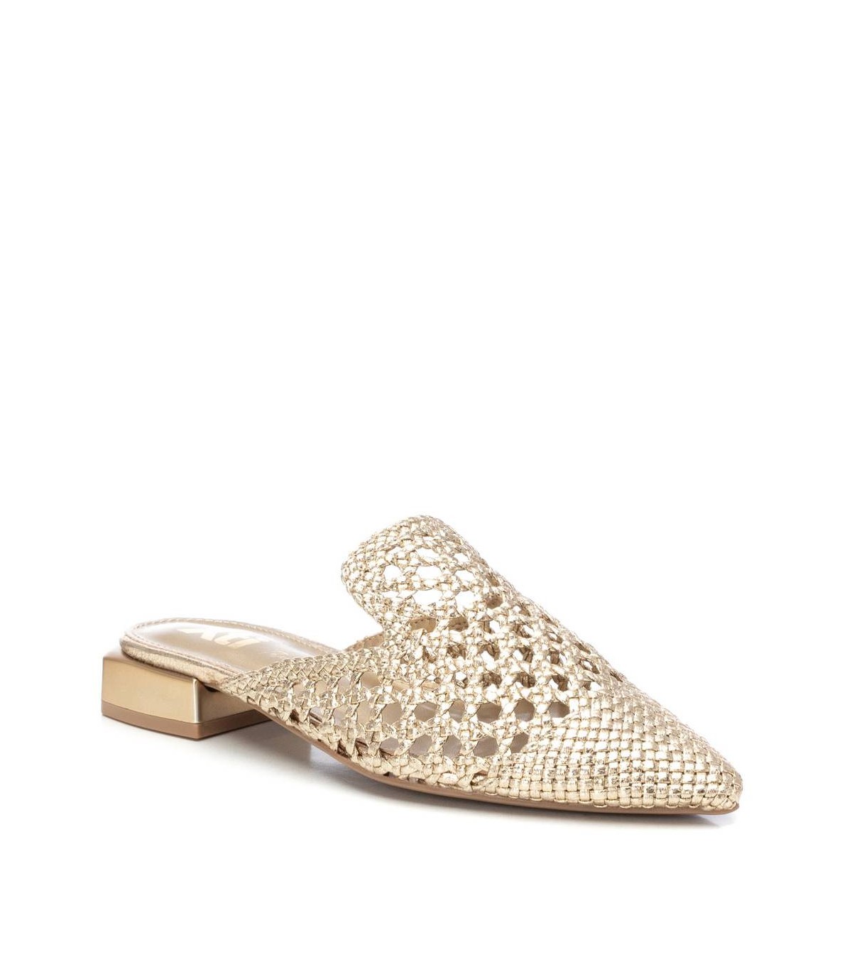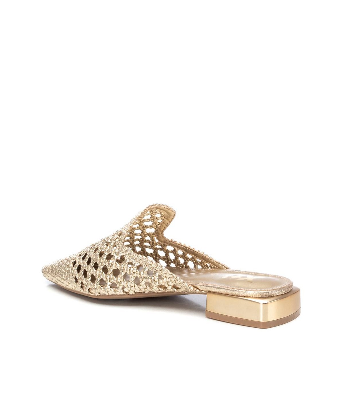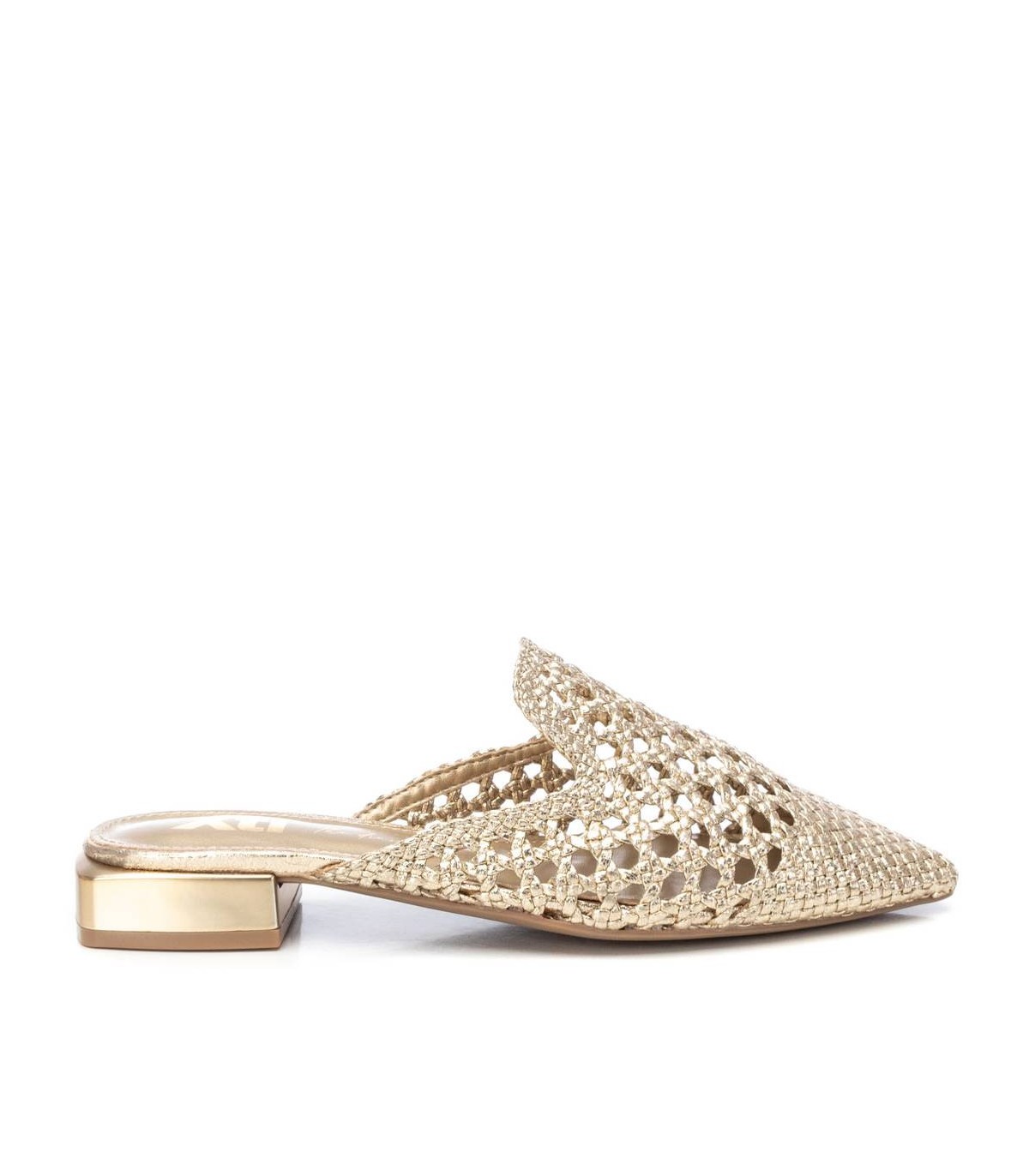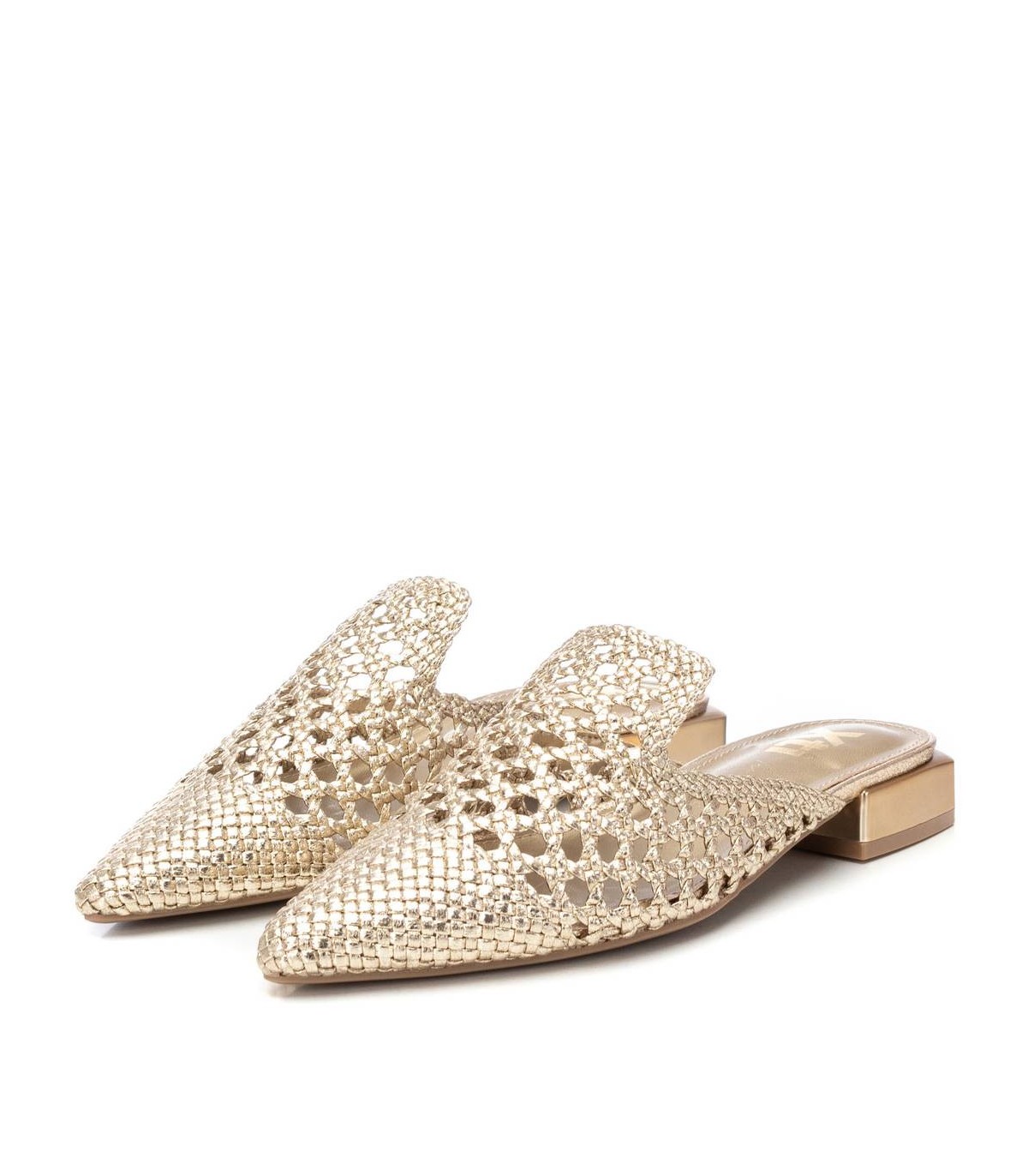 Mocasín destalonado de mujer, de la marca Xti. Fabricada en material textil con efecto metalizado. Modelo de rejilla con tacón bajo metalizado. Suela plana de goma antideslizante. Este modelo ha obtenido el certificado vegano por la organización mundial PETA (Organización de los derechos de los animales).