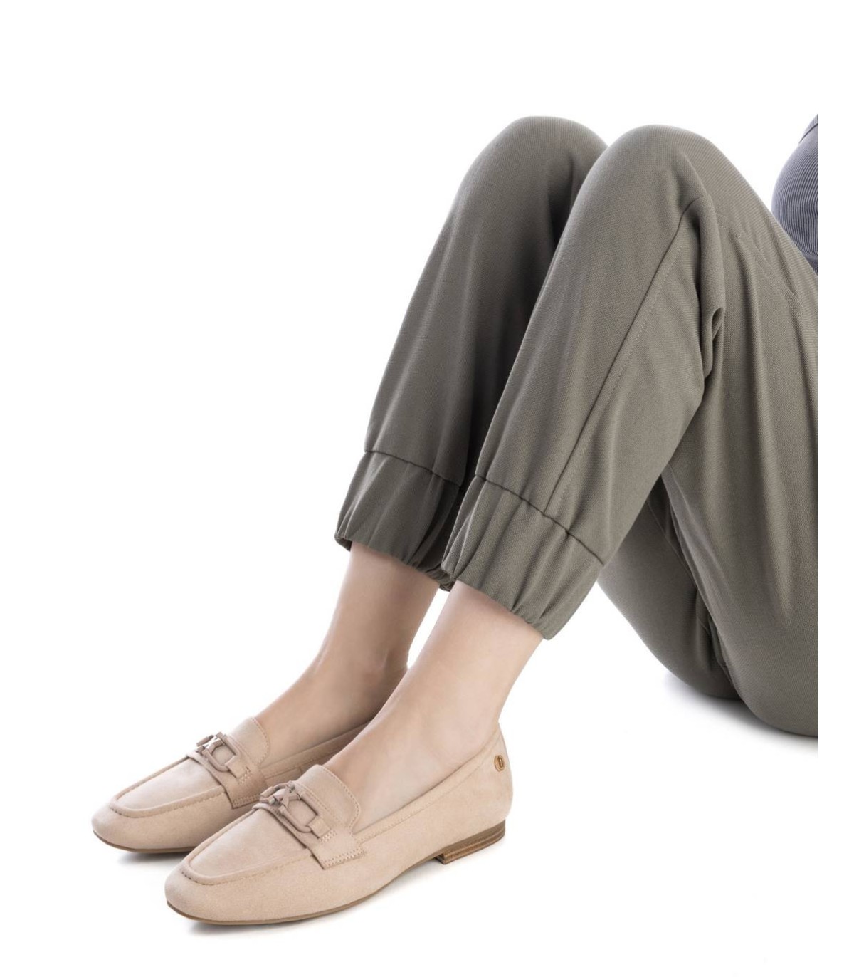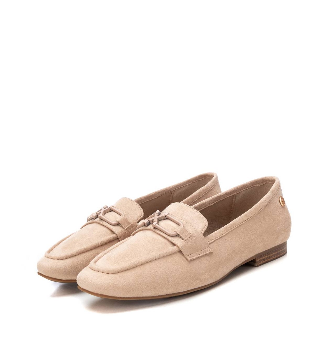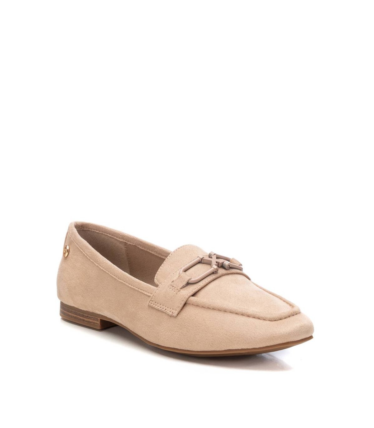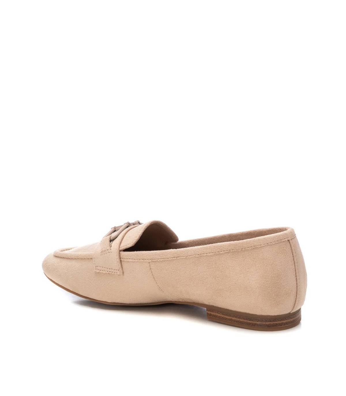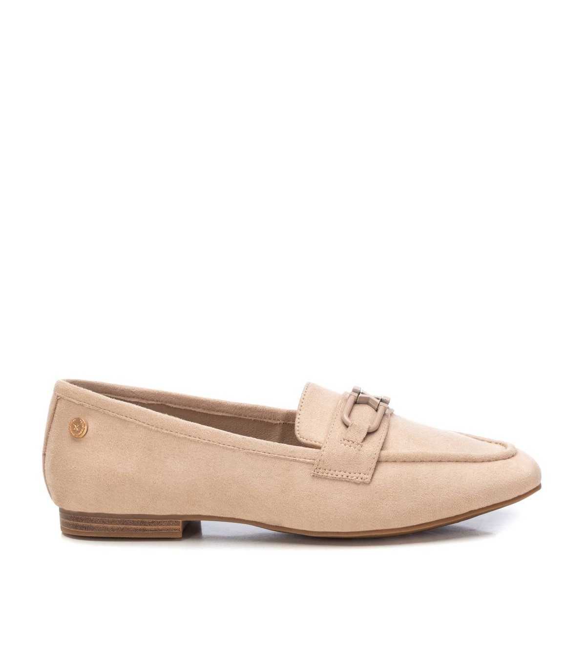 Mocasín de mujer, de la marca Xti. Fabricado en material de antelina, perfecto para tus looks de primavera/ verano pero con un toque sofisticado. Con trabilla decorativa en color oro. Suela plana y antideslizante. Este modelo ha obtenido el certificado vegano por la organización mundial PETA (Organización de los derechos de los animales).