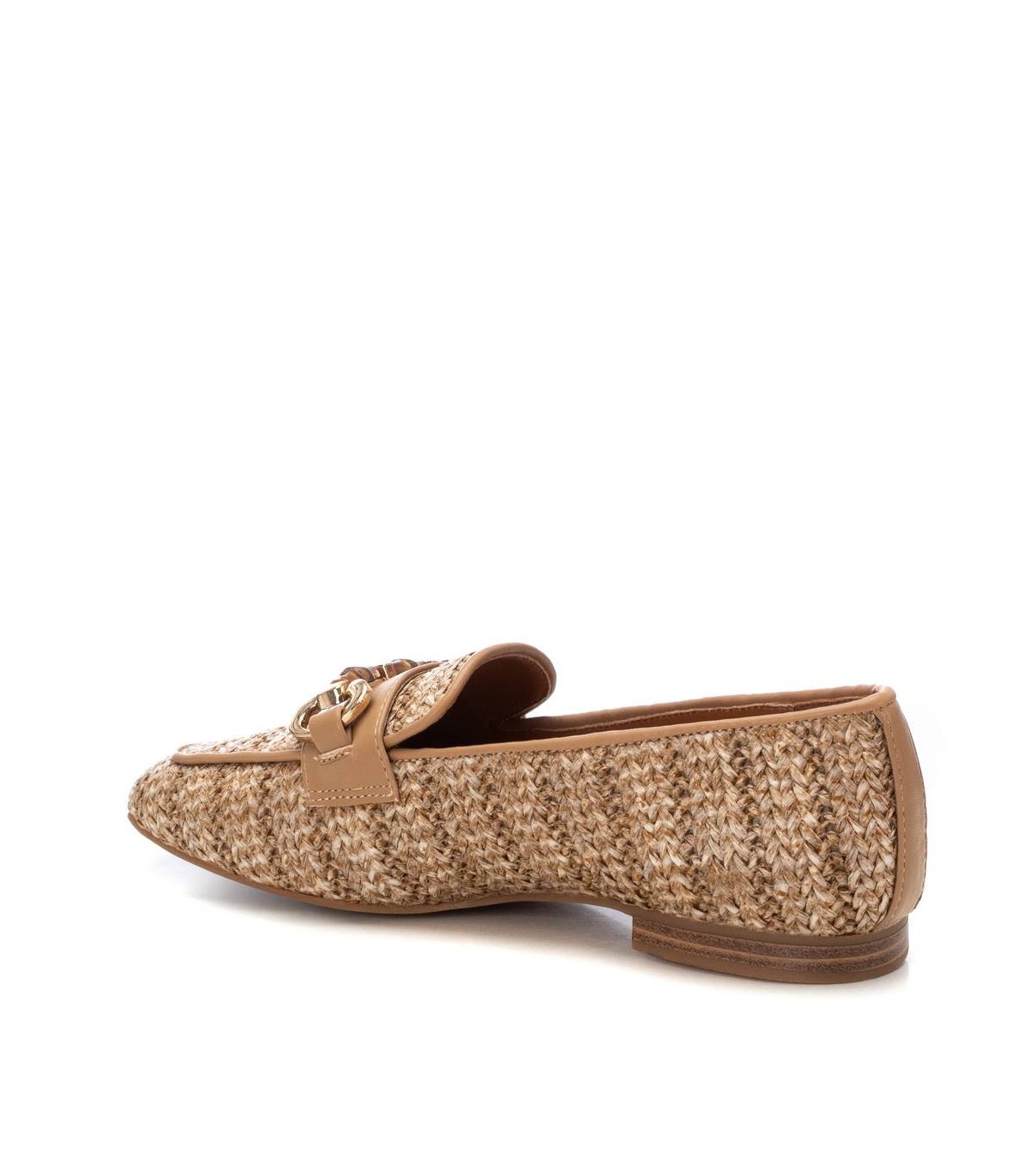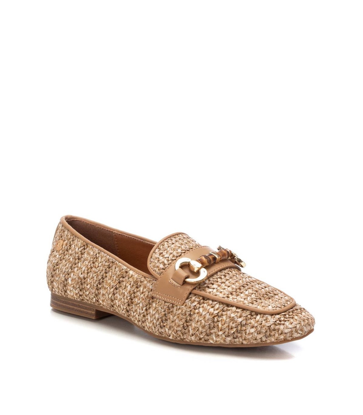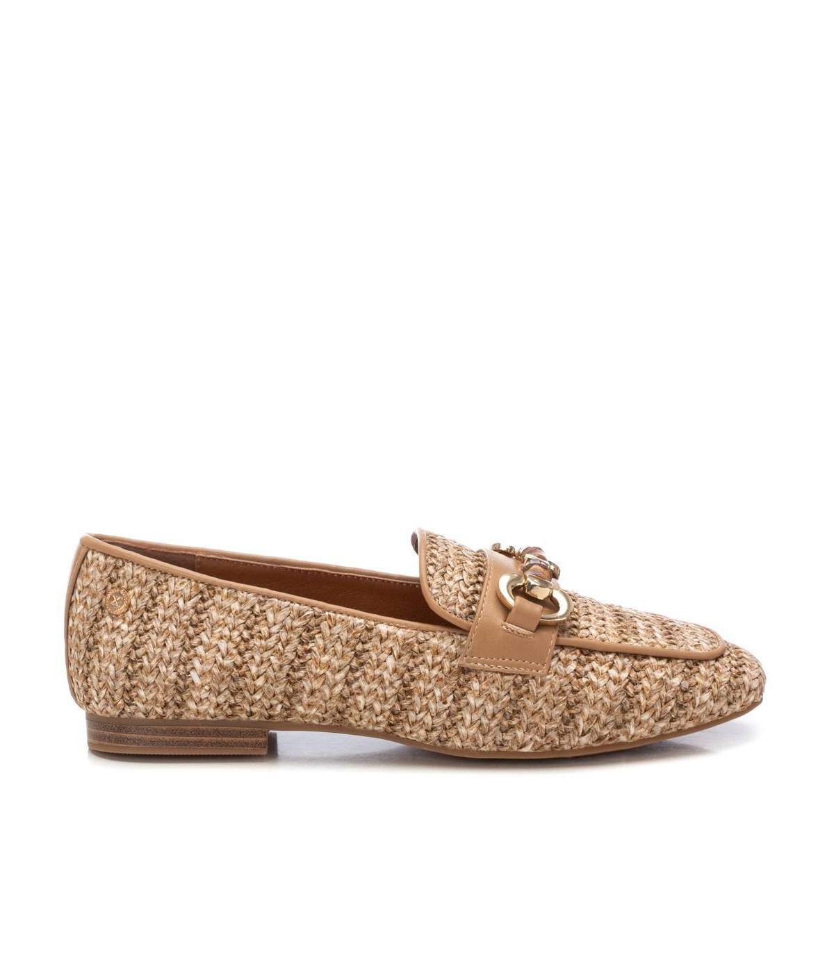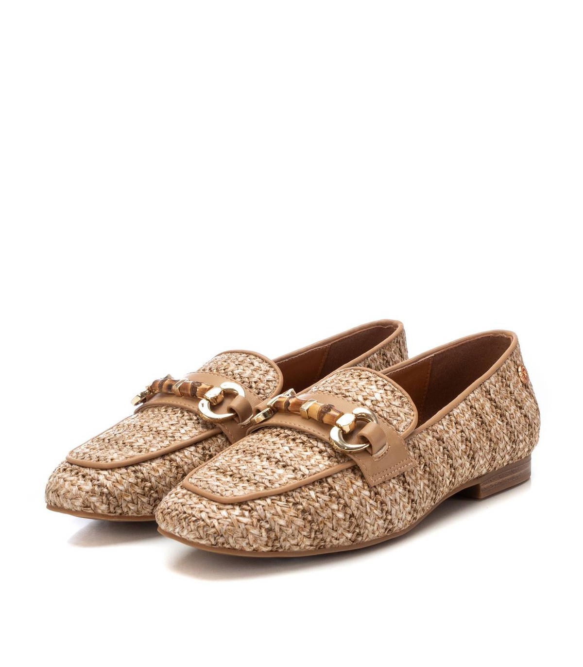 Mocasín de mujer, de la marca Xti. Fabricado en material de rafia, perfecto para dar un toque fresco pero sofisticado. Con trabilla decorativa en color oro. Suela plana y antideslizante. Este modelo ha obtenido el certificado vegano por la organización mundial PETA (Organización de los derechos de los animales).