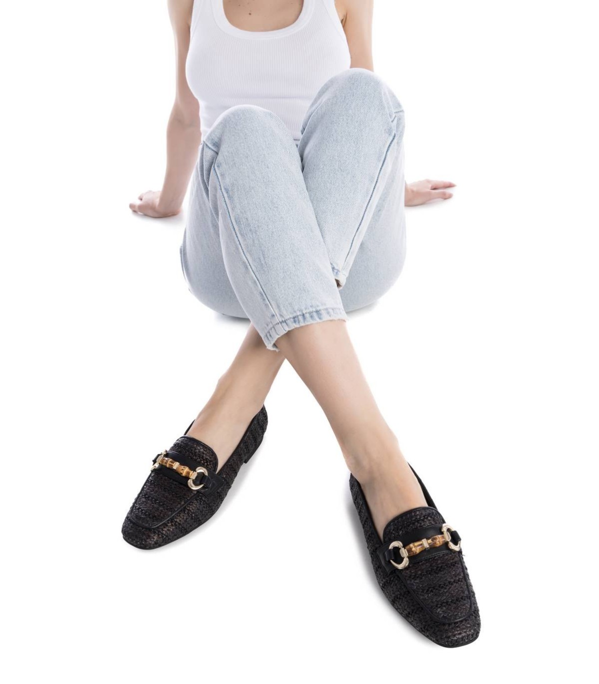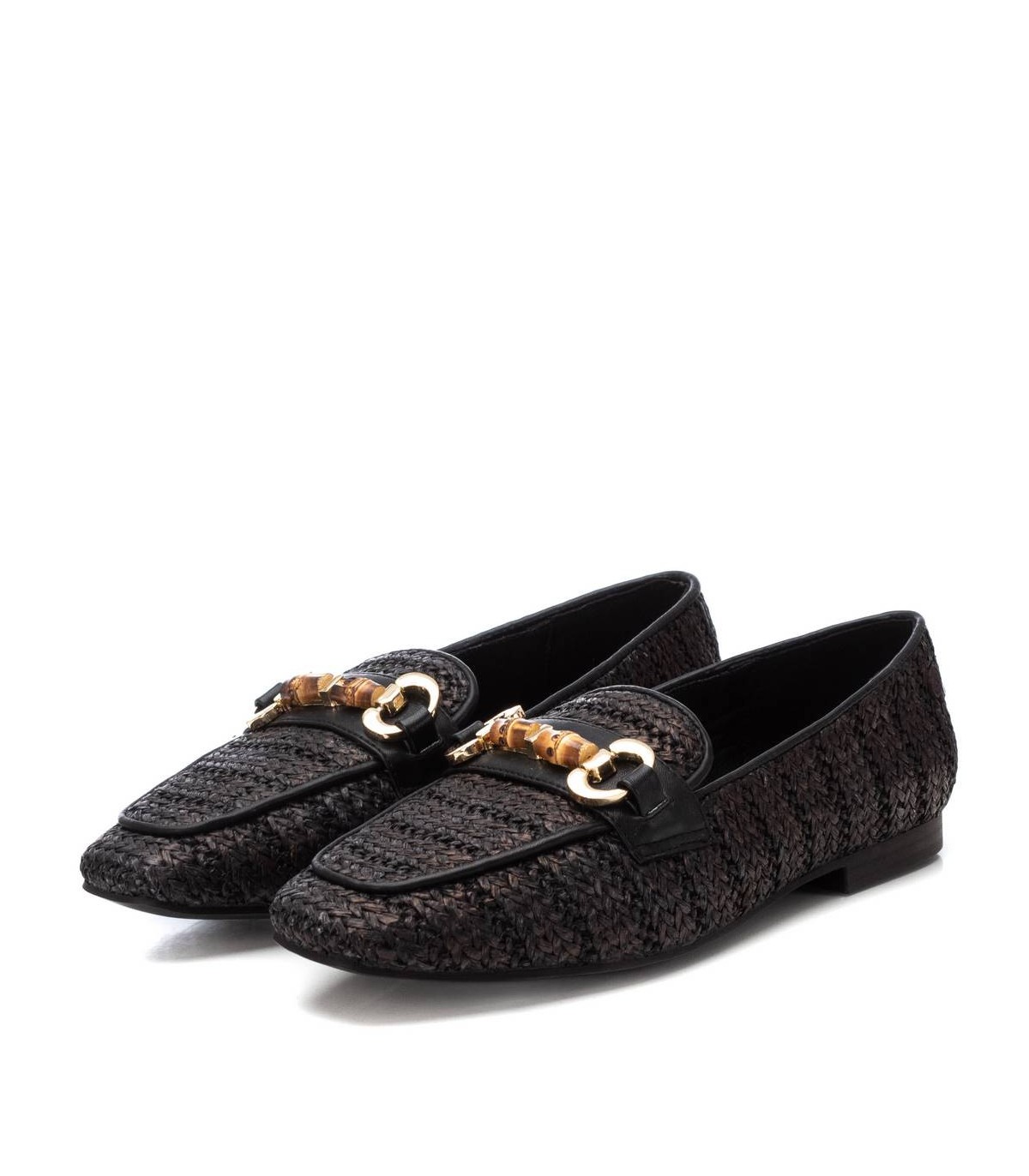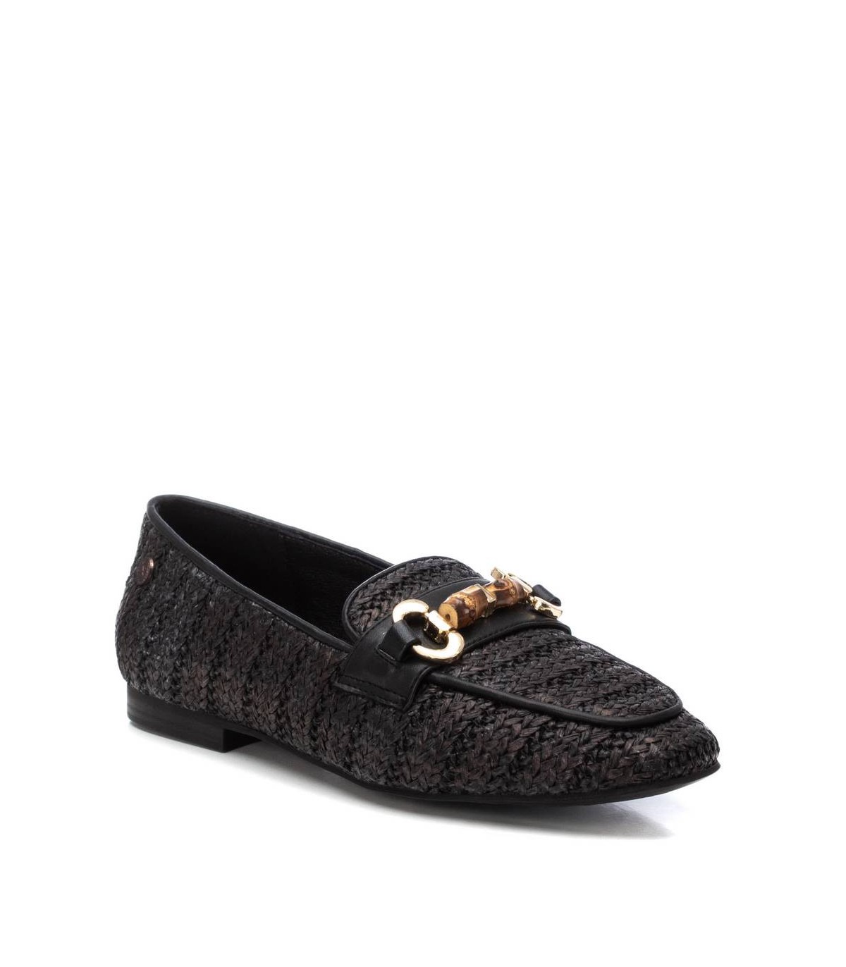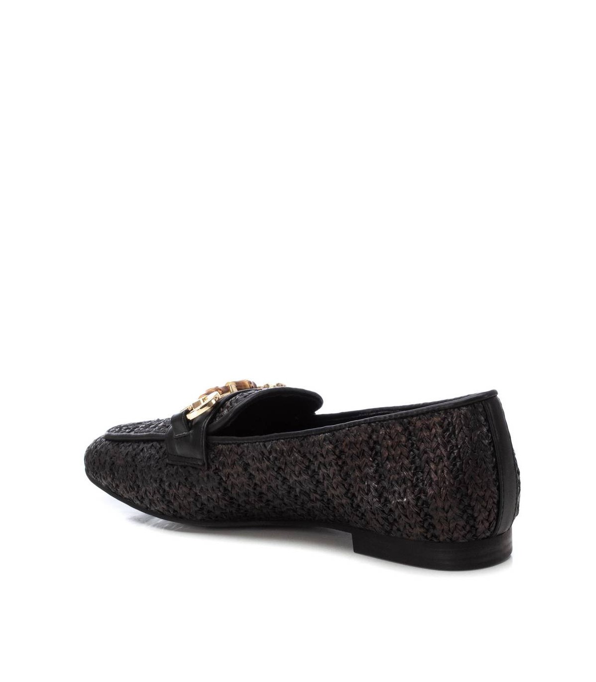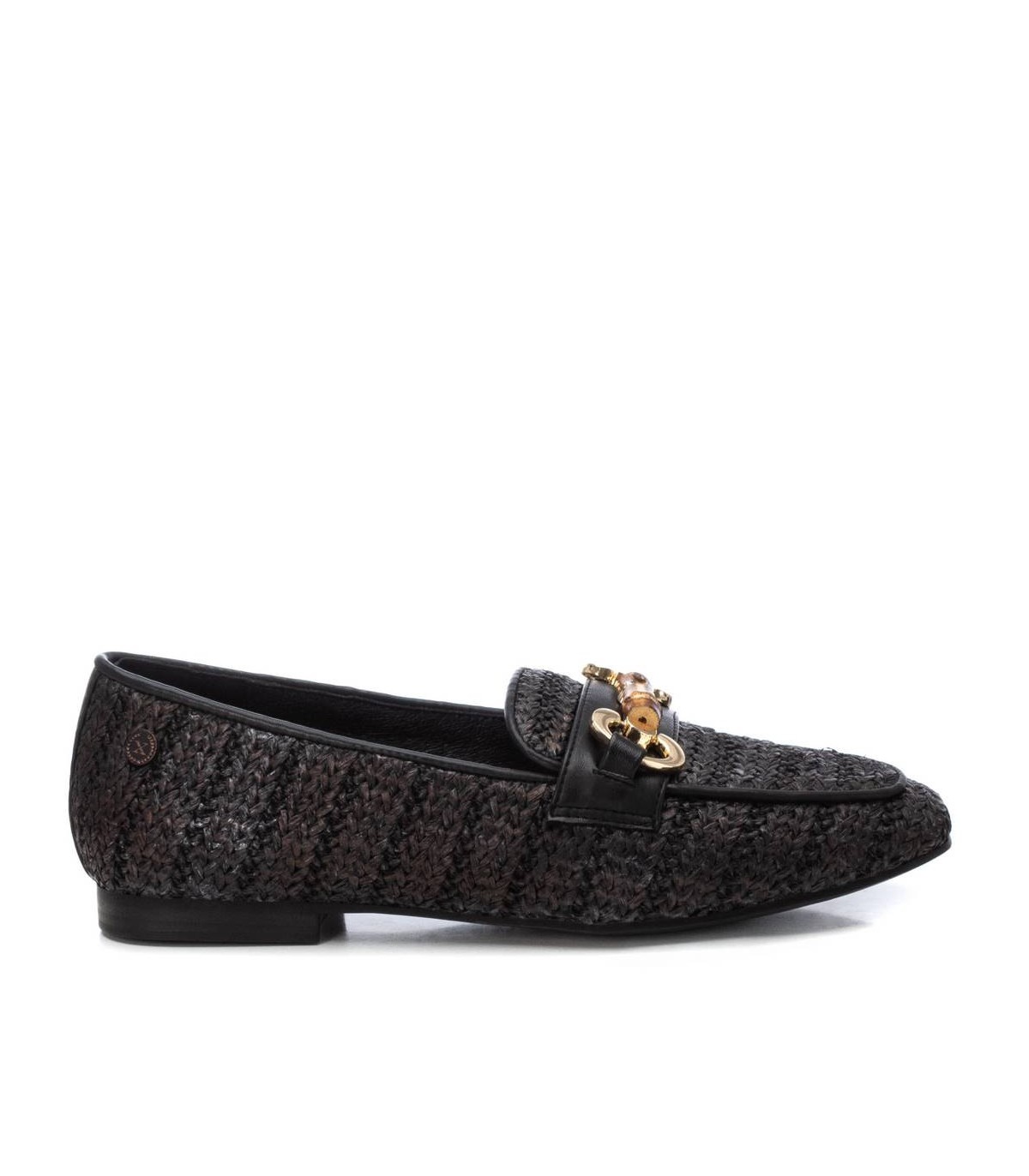 Mocasín de mujer, de la marca Xti. Fabricado en material de rafia, perfecto para dar un toque fresco pero sofisticado. Con trabilla decorativa en color oro. Suela plana y antideslizante. Este modelo ha obtenido el certificado vegano por la organización mundial PETA (Organización de los derechos de los animales).