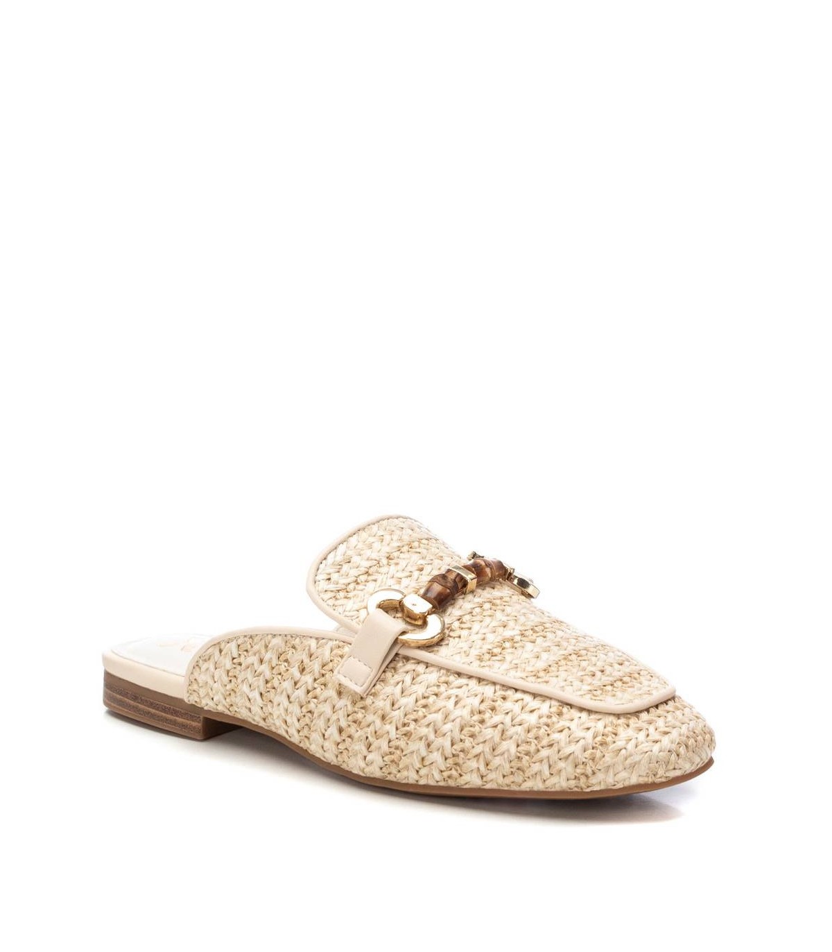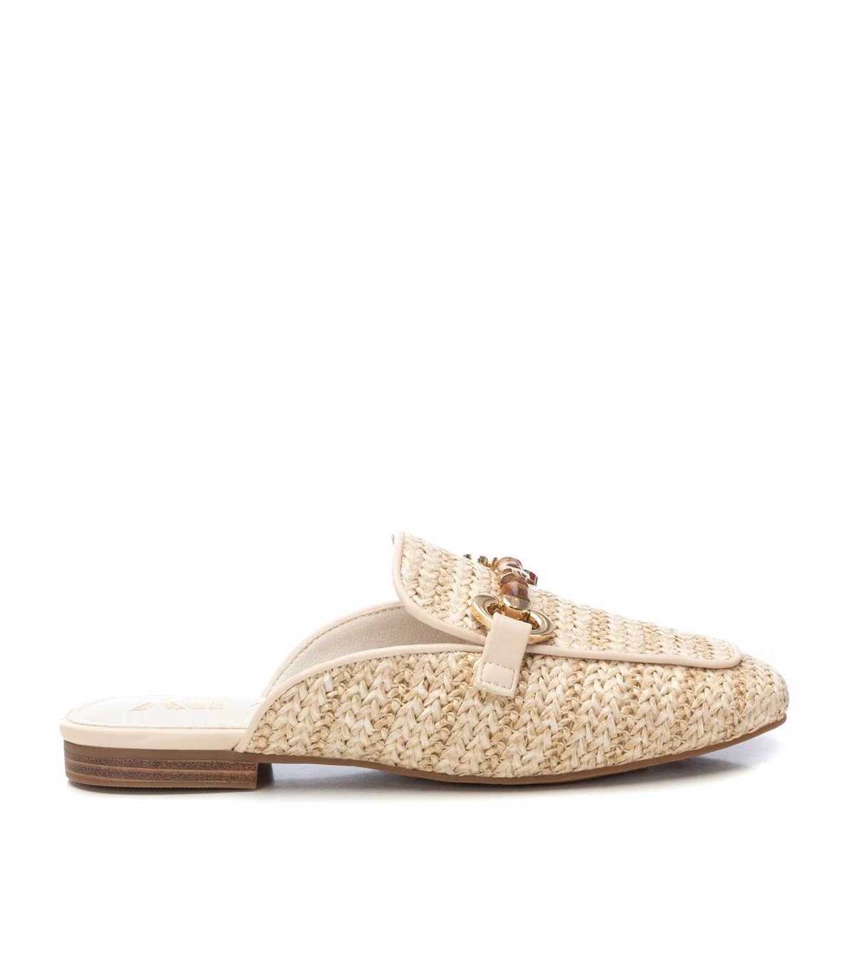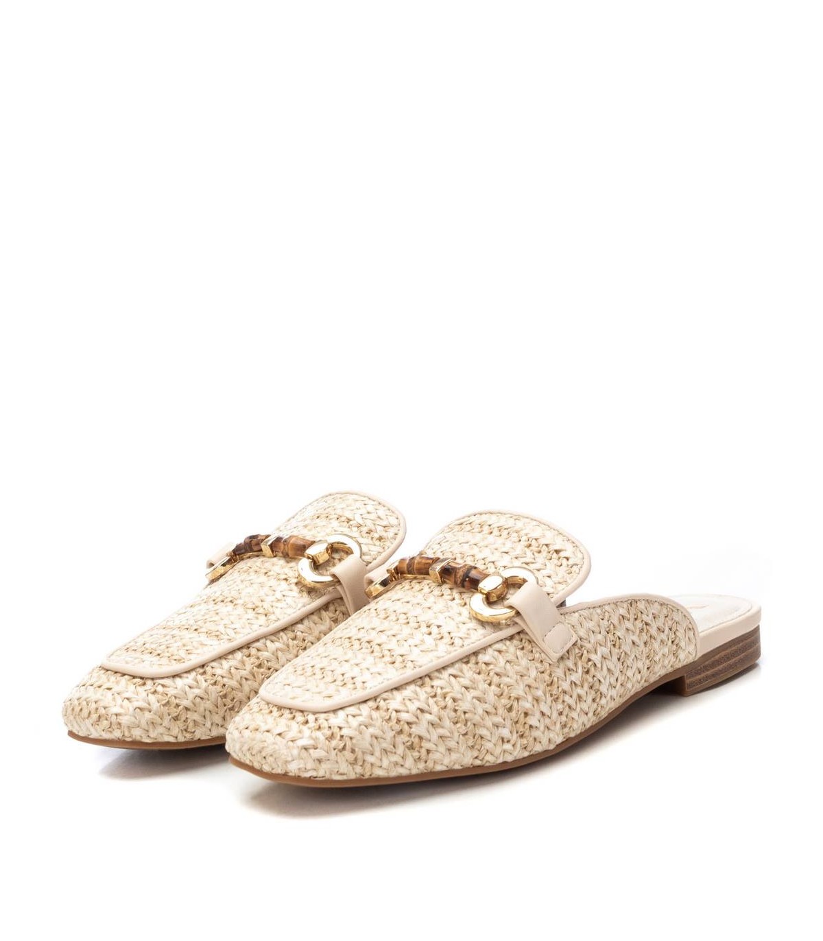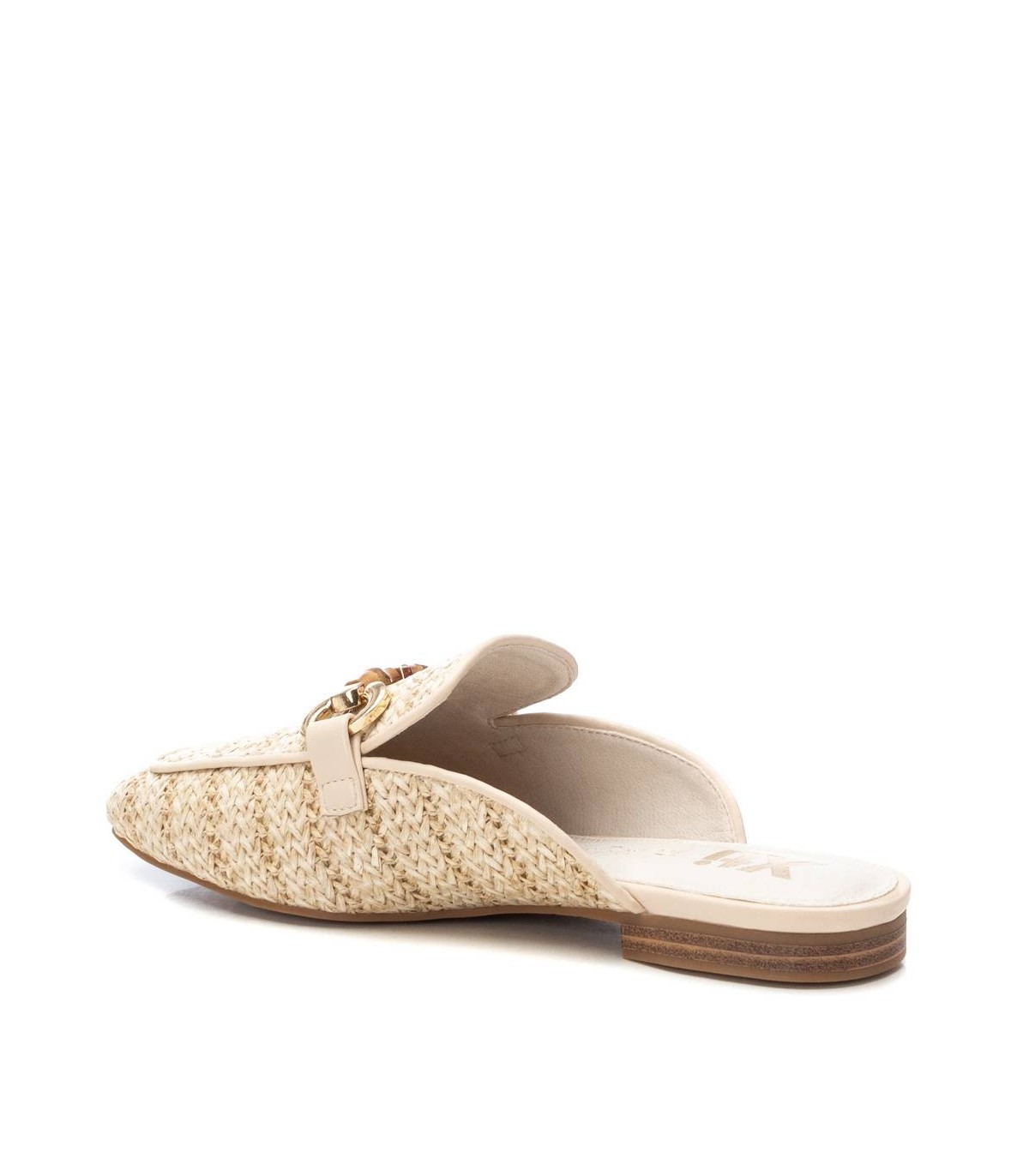 Mocasín destalonado de mujer, de la marca Xti. Fabricado en material de rafia, perfecto para tus looks de primavera/ verano pero con un toque sofisticado. Con trabilla decorativa al en color oro. Suela plana y antideslizante. Este modelo ha obtenido el certificado vegano por la organización mundial PETA (Organización de los derechos de los animales).