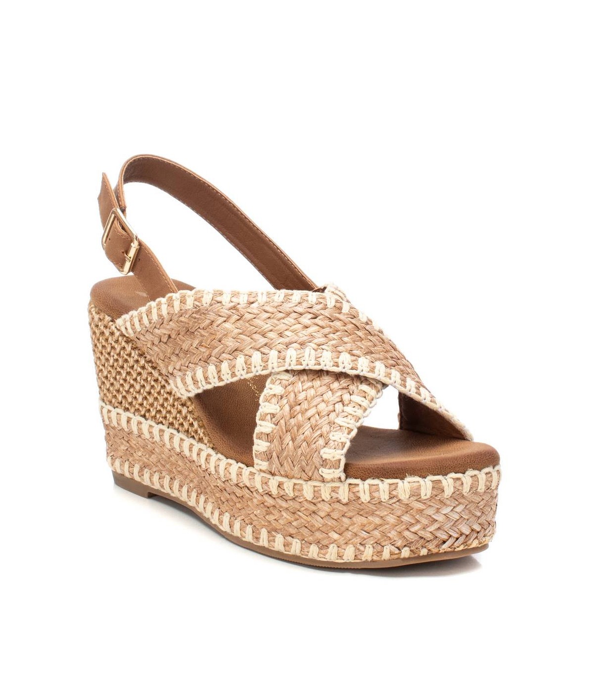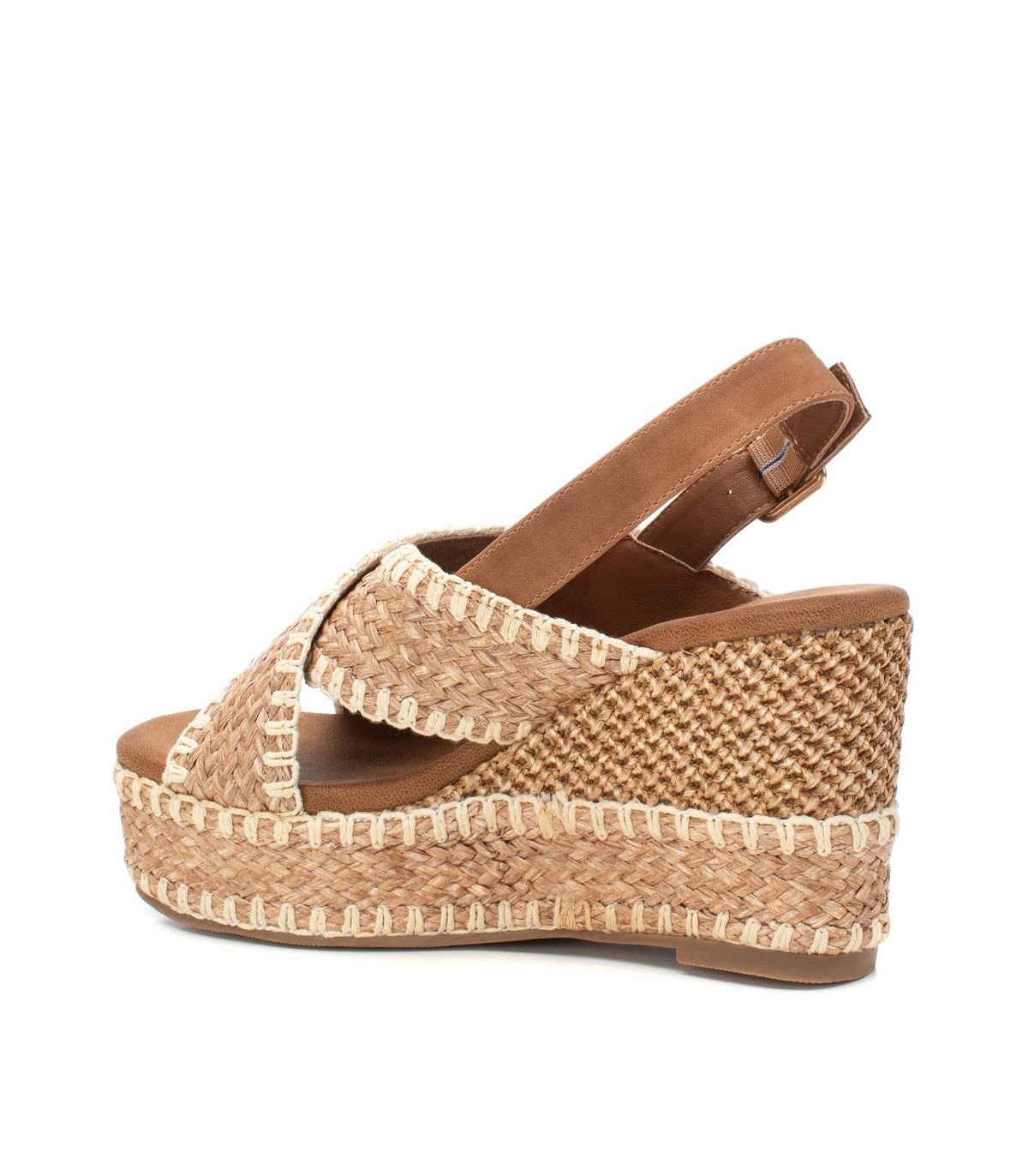 Sandalia de mujer, de la marca Xti. Fabricada en material de rafia. Modelo de pala cruzada con bonito cosido en el borde. Tira con sujeción al tobillo con hebilla metálica. Cuña con plataforma forrada con el mismo material que el modelo. Suela antideslizante. Este modelo ha obtenido el certificado vegano por la organización mundial PETA (Organización de los derechos de los animales).