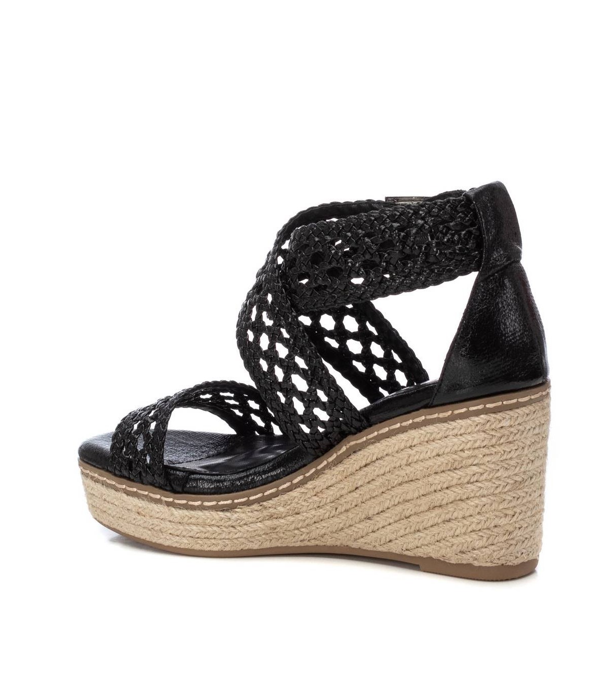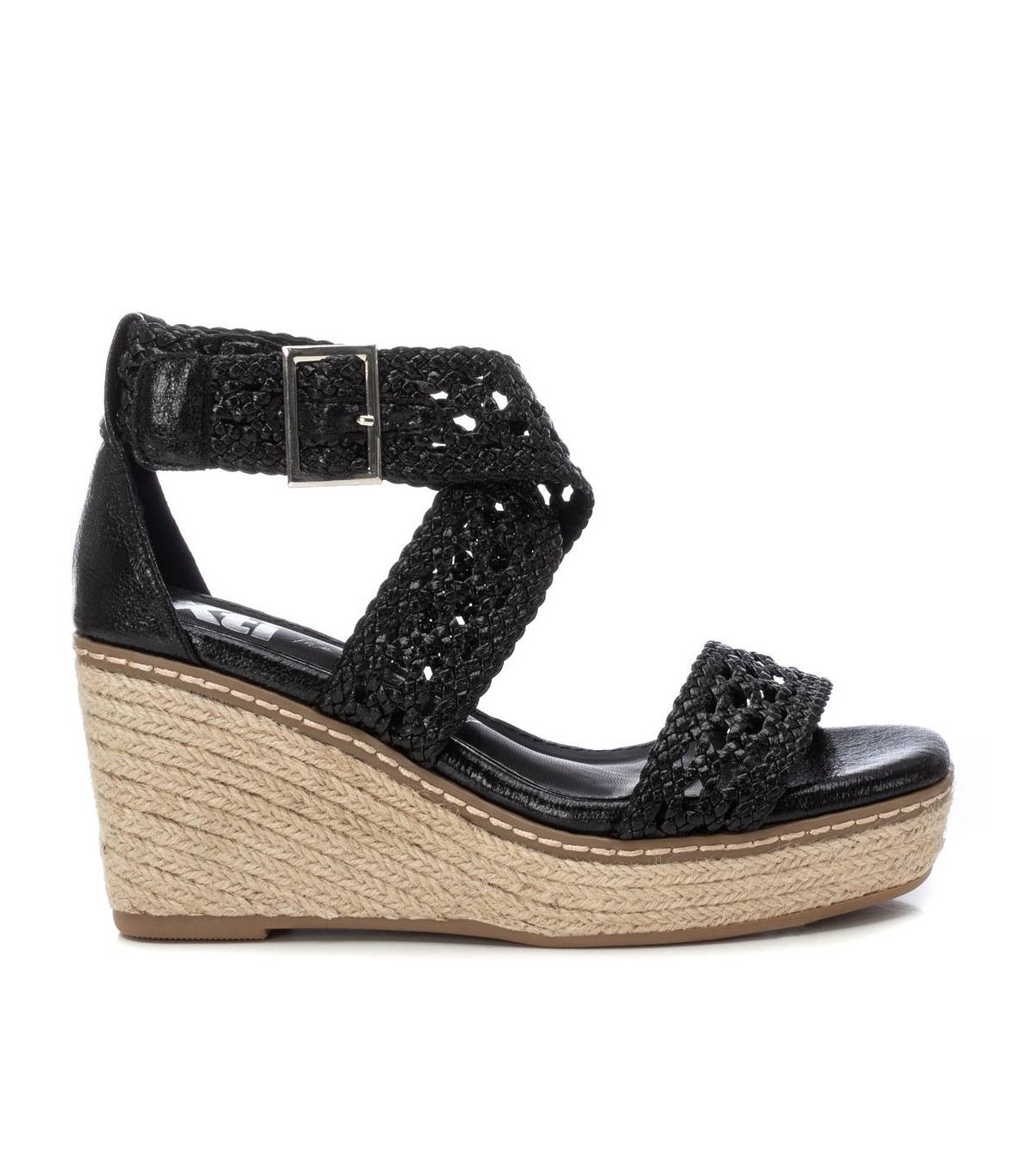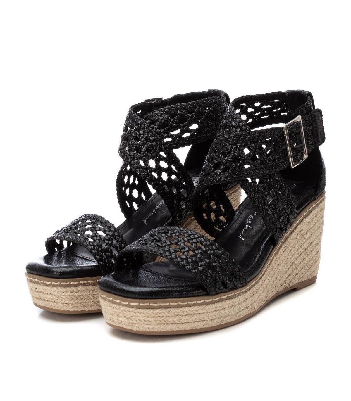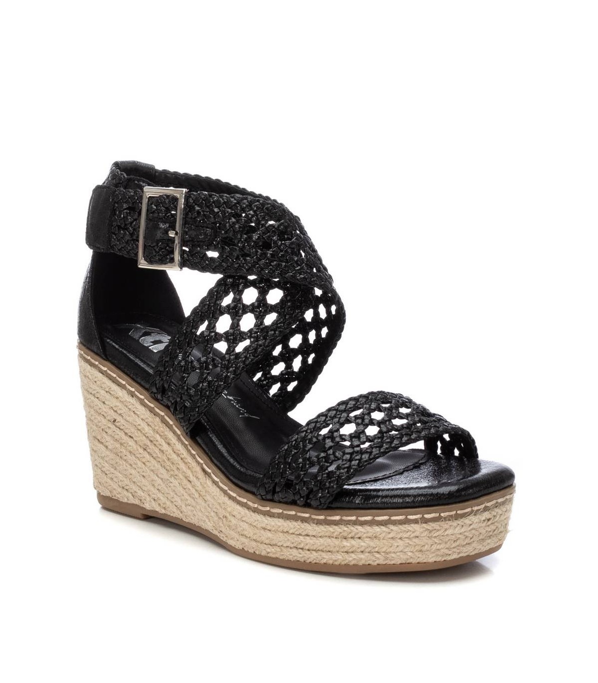 Sandalia de mujer, de la marca Xti. Fabricada en material textil metalizado. Modelo con diseño de pala y tiras cruzadas con material diseño de rejilla. Cuña con plataforma cómoda y antideslizante. Para destacar tus mejores looks este verano. Este modelo ha obtenido el certificado vegano por la organización mundial PETA (Organización de los derechos de los animales).