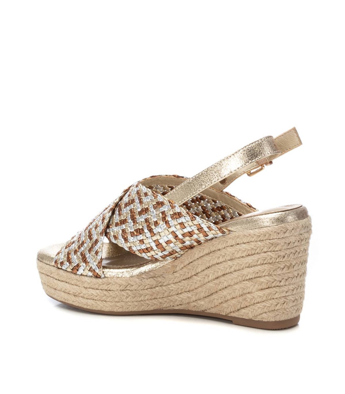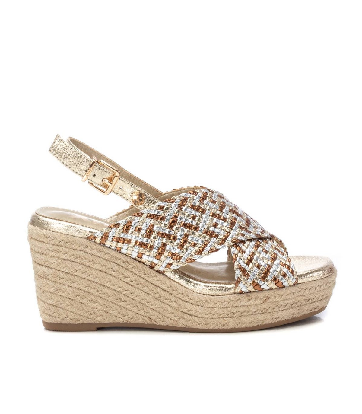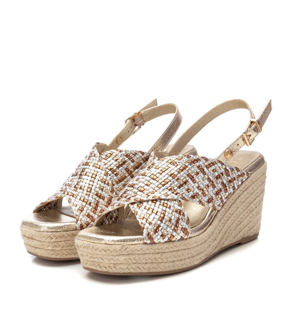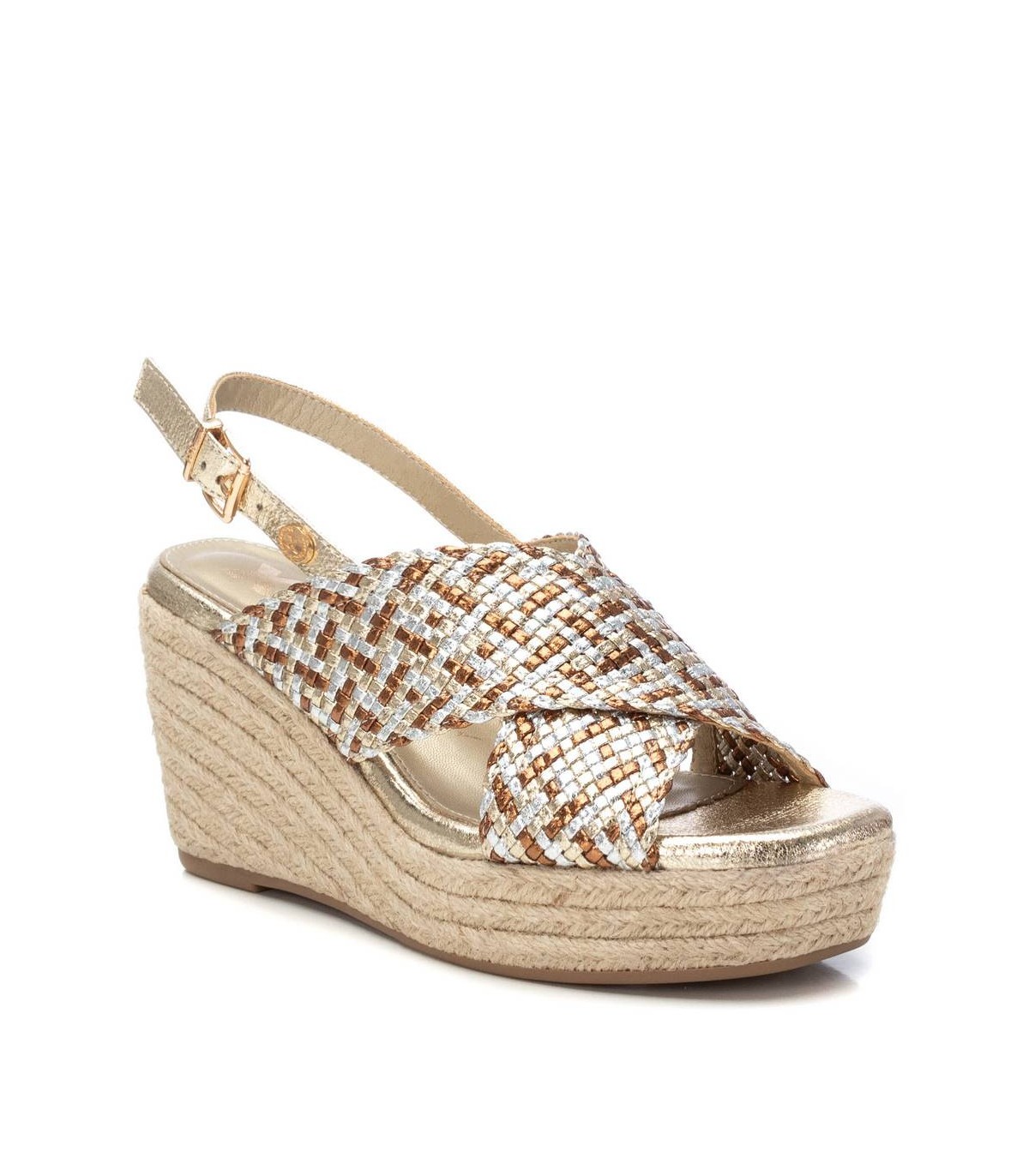 Sandalia de mujer, de la marca Xti. Fabricada en material textil metalizado. Diseño de pala cruzada y entrelazada con distintos colores para aportar diferencia y deslumbrar con tus looks. Cuña con plataforma con suela antideslizante. Este modelo ha obtenido el certificado vegano por la organización mundial PETA (Organización de los derechos de los animales).