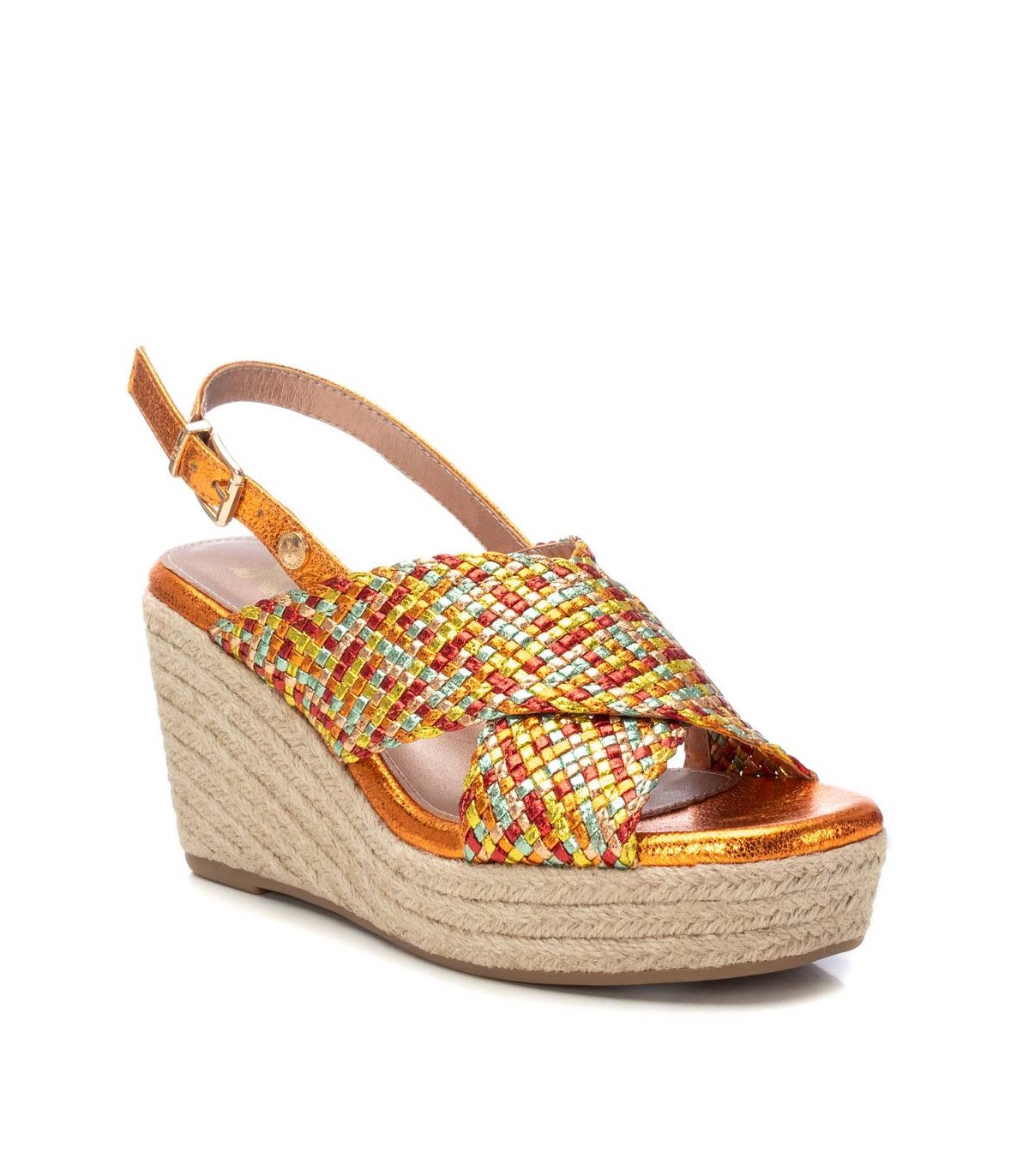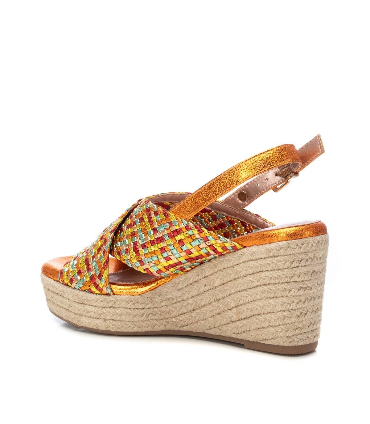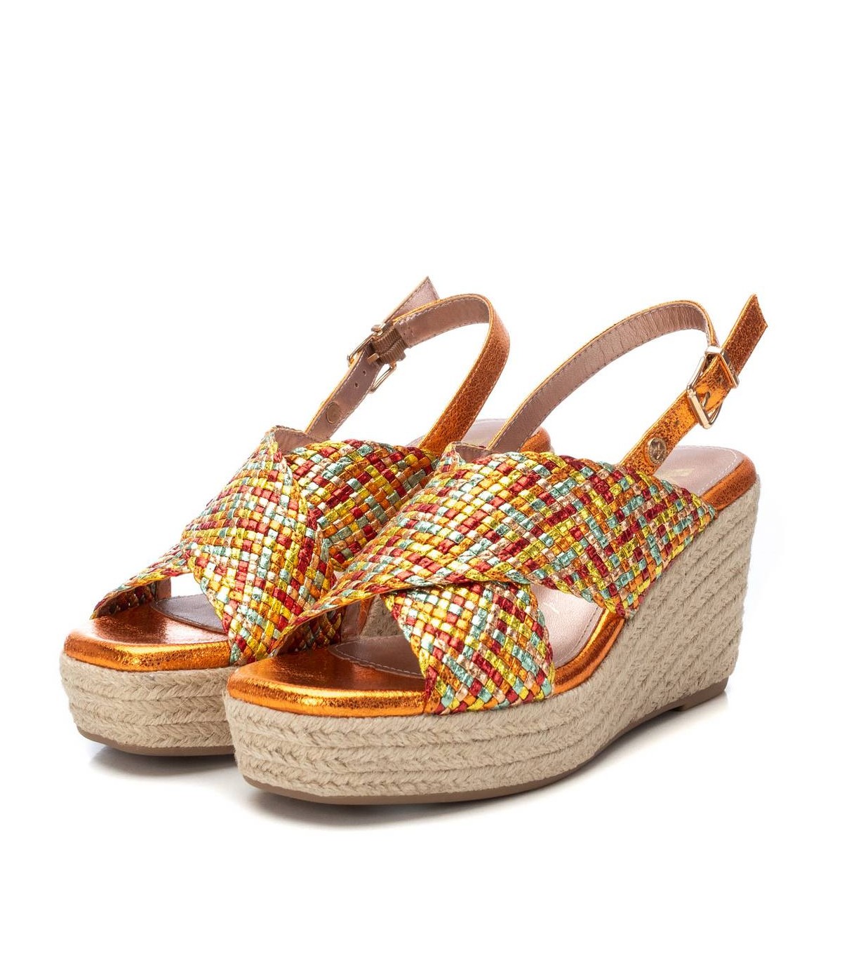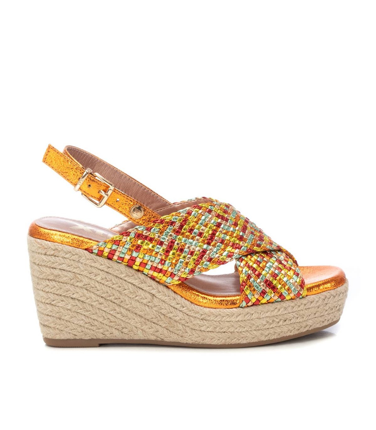 Sandalia de mujer, de la marca Xti. Fabricada en material textil metalizado. Diseño de pala cruzada y entrelazada con distintos colores para aportar diferencia y deslumbrar con tus looks. Cuña con plataforma con suela antideslizante. Este modelo ha obtenido el certificado vegano por la organización mundial PETA (Organización de los derechos de los animales).