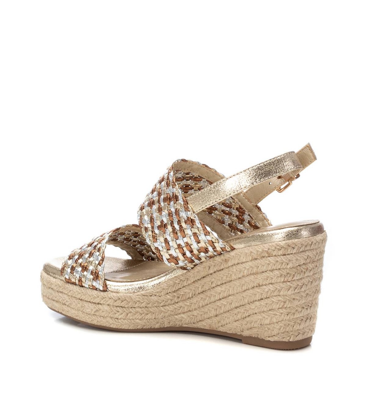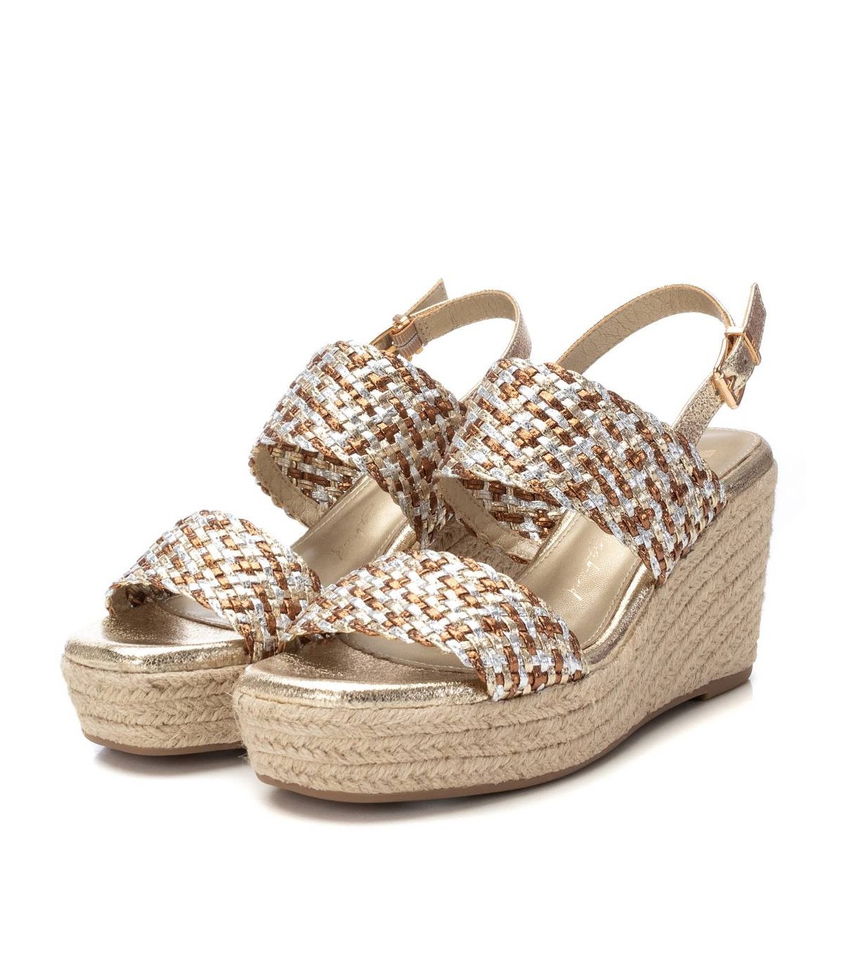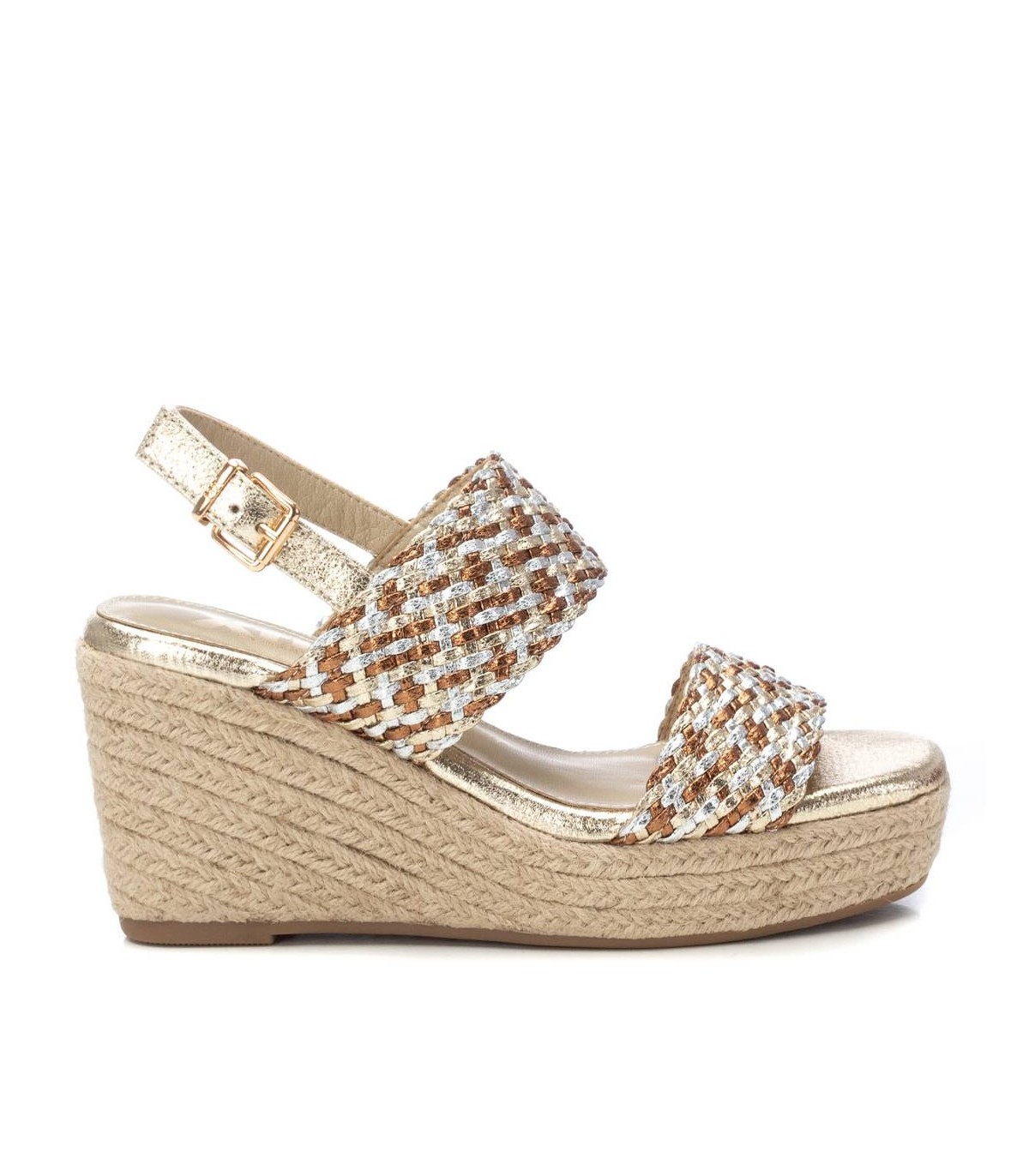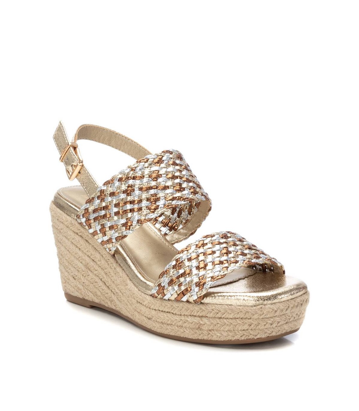 Sandalia de mujer de la marca Xti. Fabricada en material textil con efecto metalizado. Modelo de palas paralelas. Cierre mediante hebilla. Cuña de 9 cm de yute con plataforma delantera. Suela de goma antideslizante. Este modelo ha obtenido el certificado vegano por la organización mundial PETA (Organización de los derechos de los animales).