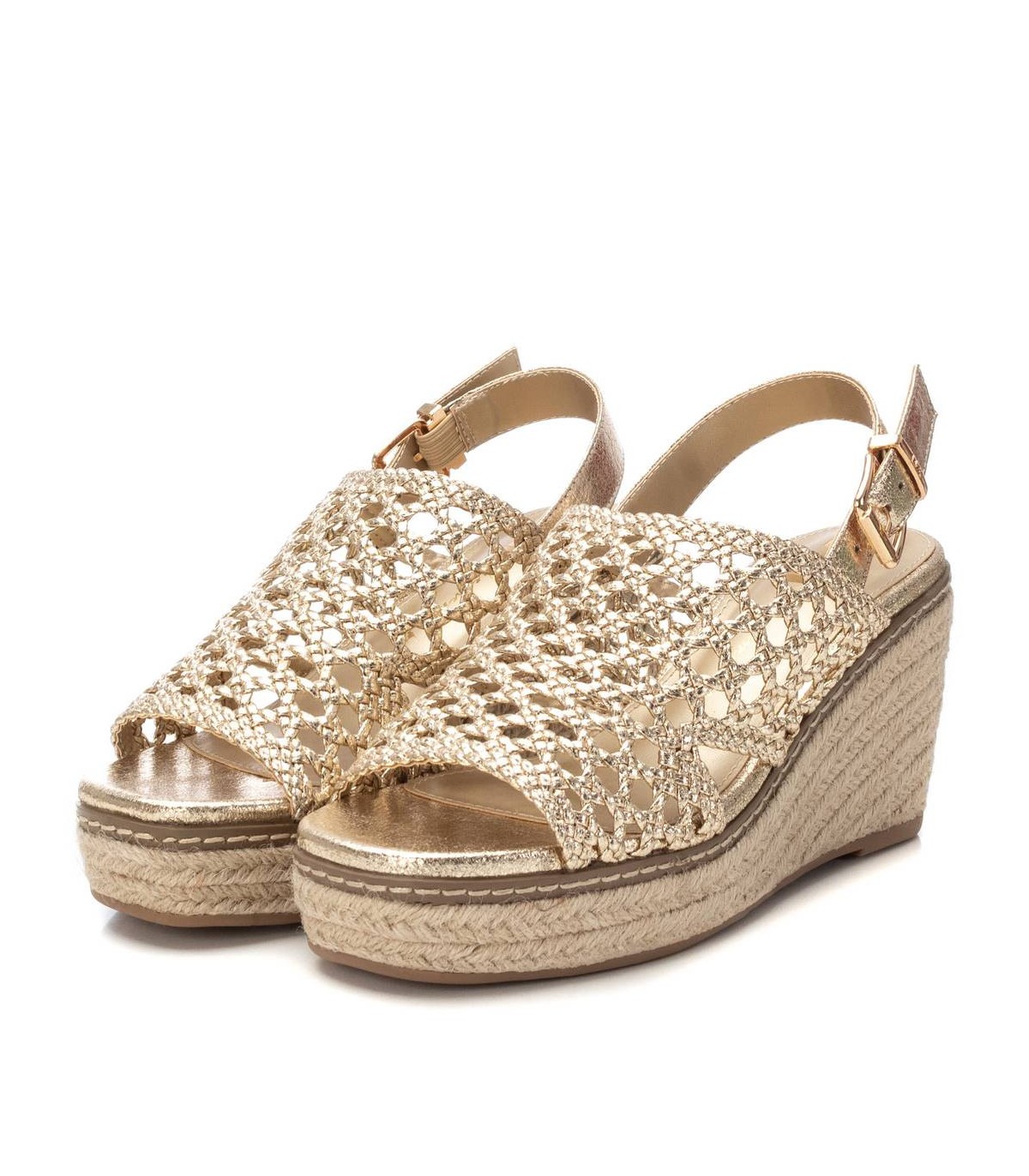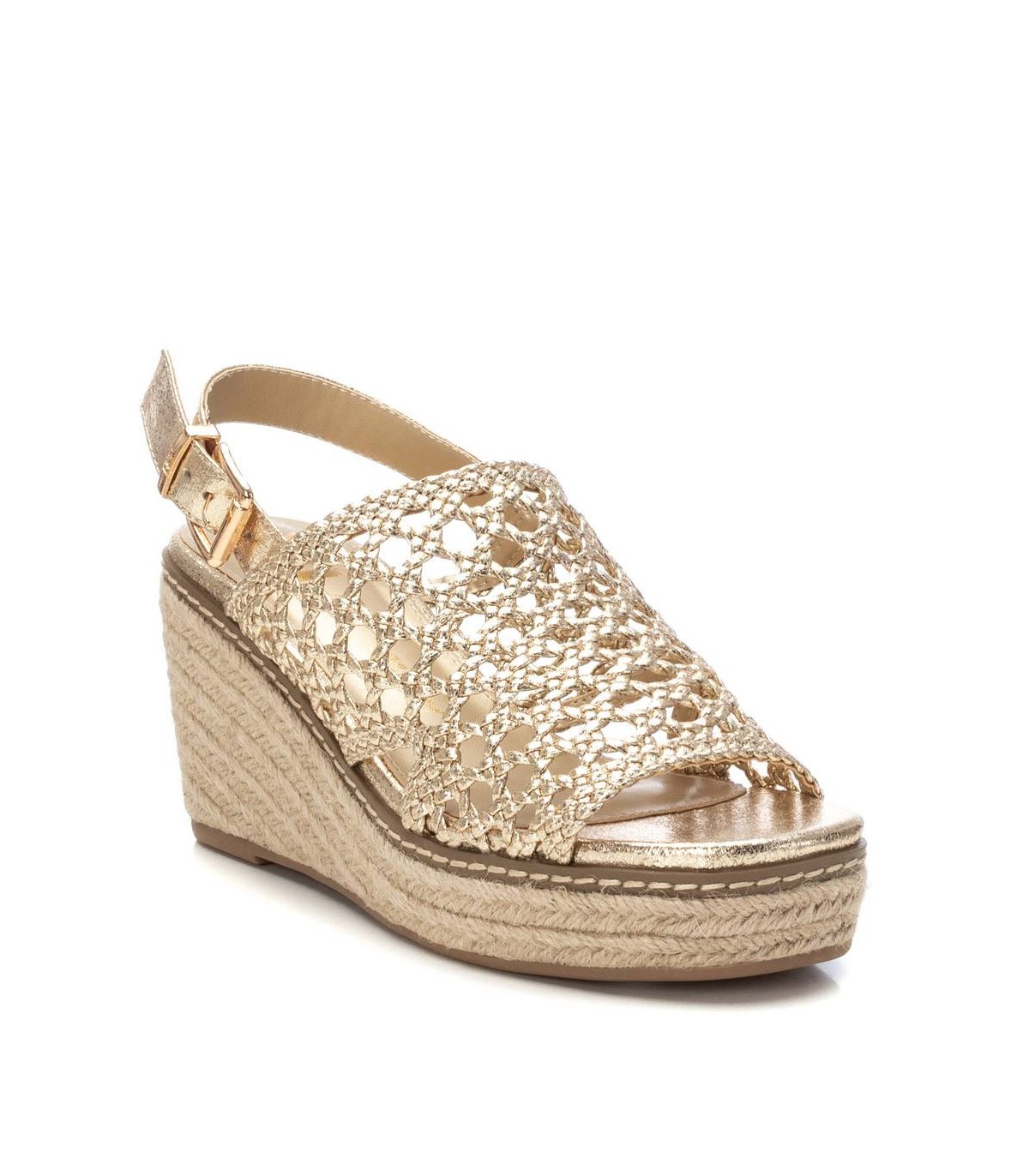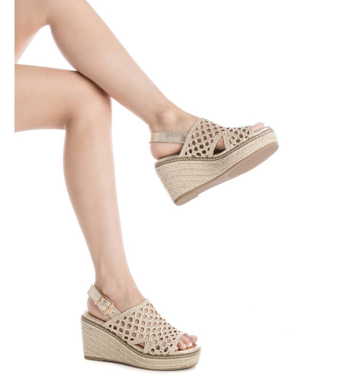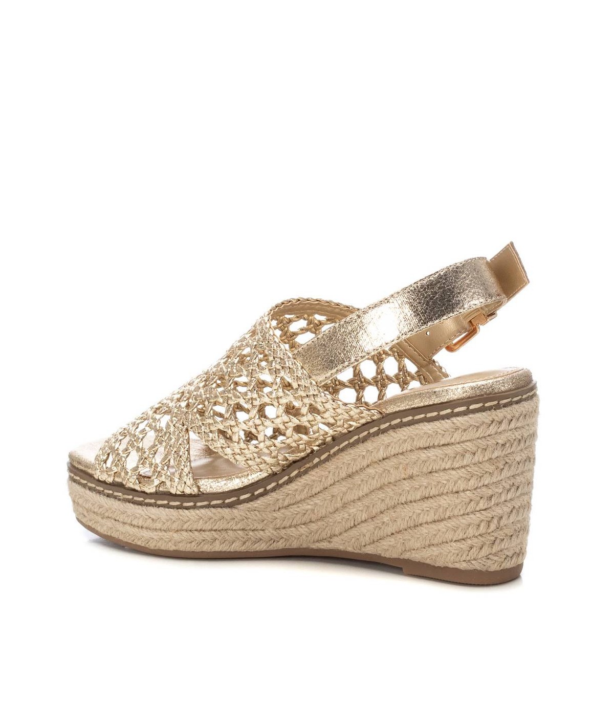 Sandalia de mujer, de la marca Xti. Fabricada en material textil con efecto metalizado. Tira con hebilla metálica para su perfecta sujeción al tobillo. Cuña con plataforma de yute. Suela de goma antideslizante. Deslumbrarás y no pasarás desapercibida. Este modelo ha obtenido el certificado vegano por la organización mundial PETA (Organización de los derechos de los animales).