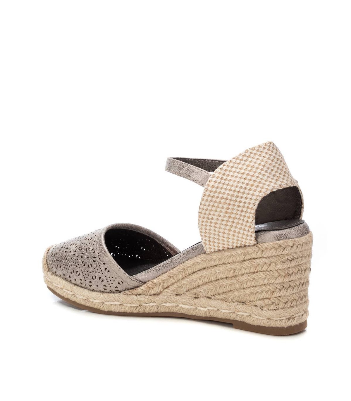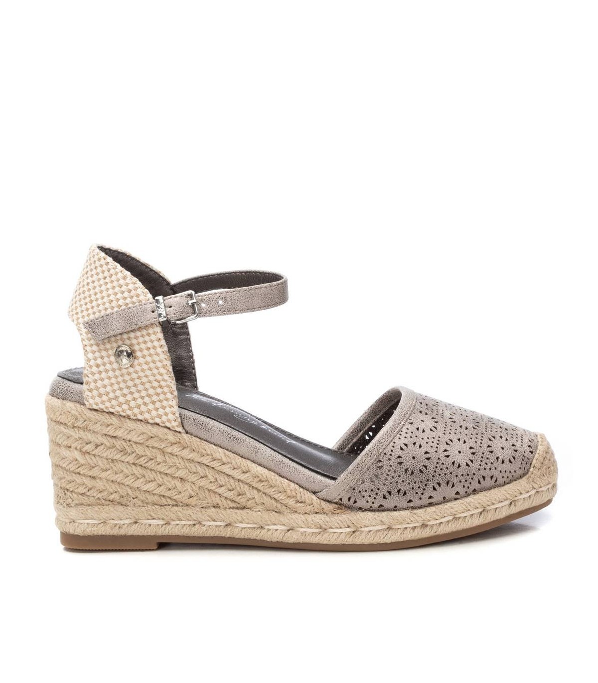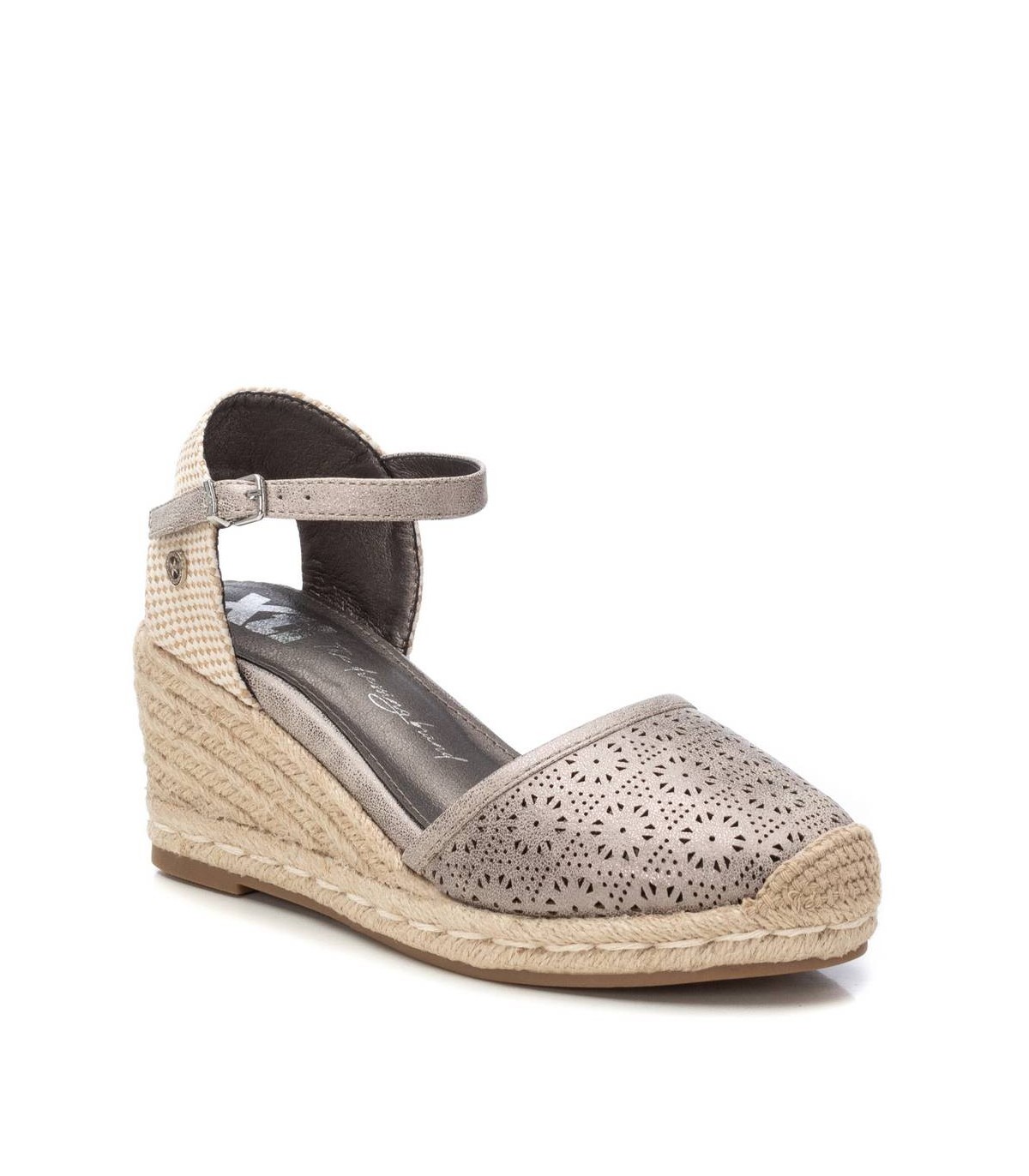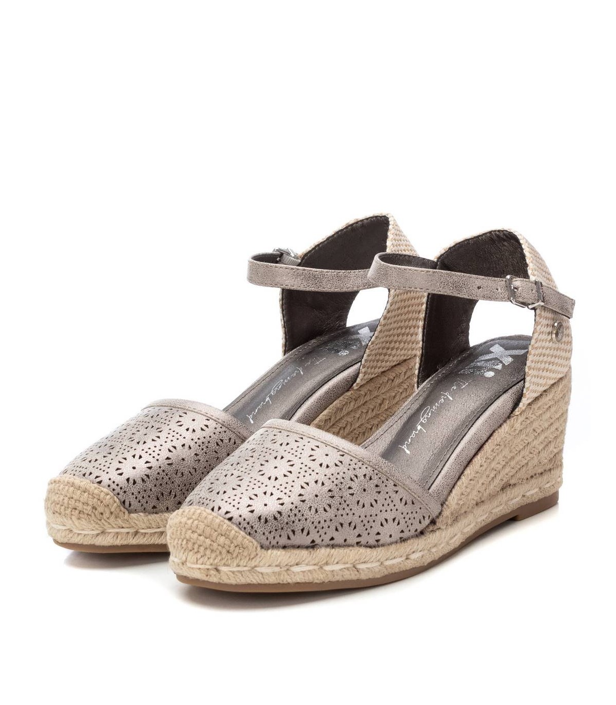 Alpargata de mujer tipo valenciana, de la marca Xti. Fabricado con material que imita la piel con efecto metalizado, combinado con una trasera de textil para mayor comodidad, será el protagonista de todos tus looks. Cierre mediante hebilla. Cuña de yute con suela de goma antideslizante. Este modelo ha obtenido el certificado vegano por la organización mundial PETA (Organización de los derechos de los animales).