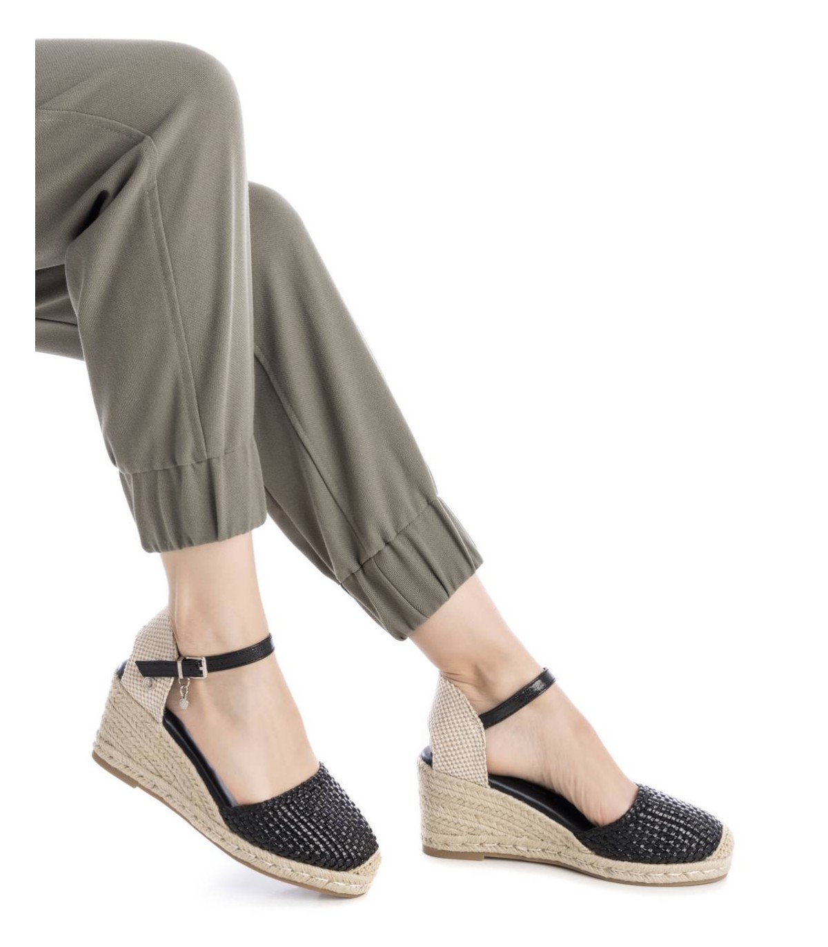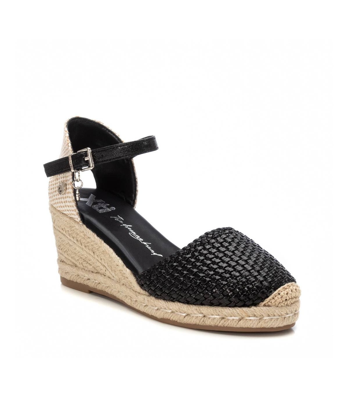 Alpargata tipo valenciana de mujer de la marca Xti. Fabricada en material textil con acabado metalizado. Cierre mediante hebilla. Cuña de yute con suela de goma antideslizante. Este modelo ha obtenido el certificado vegano por la organización mundial PETA (Organización de los derechos de los animales).
