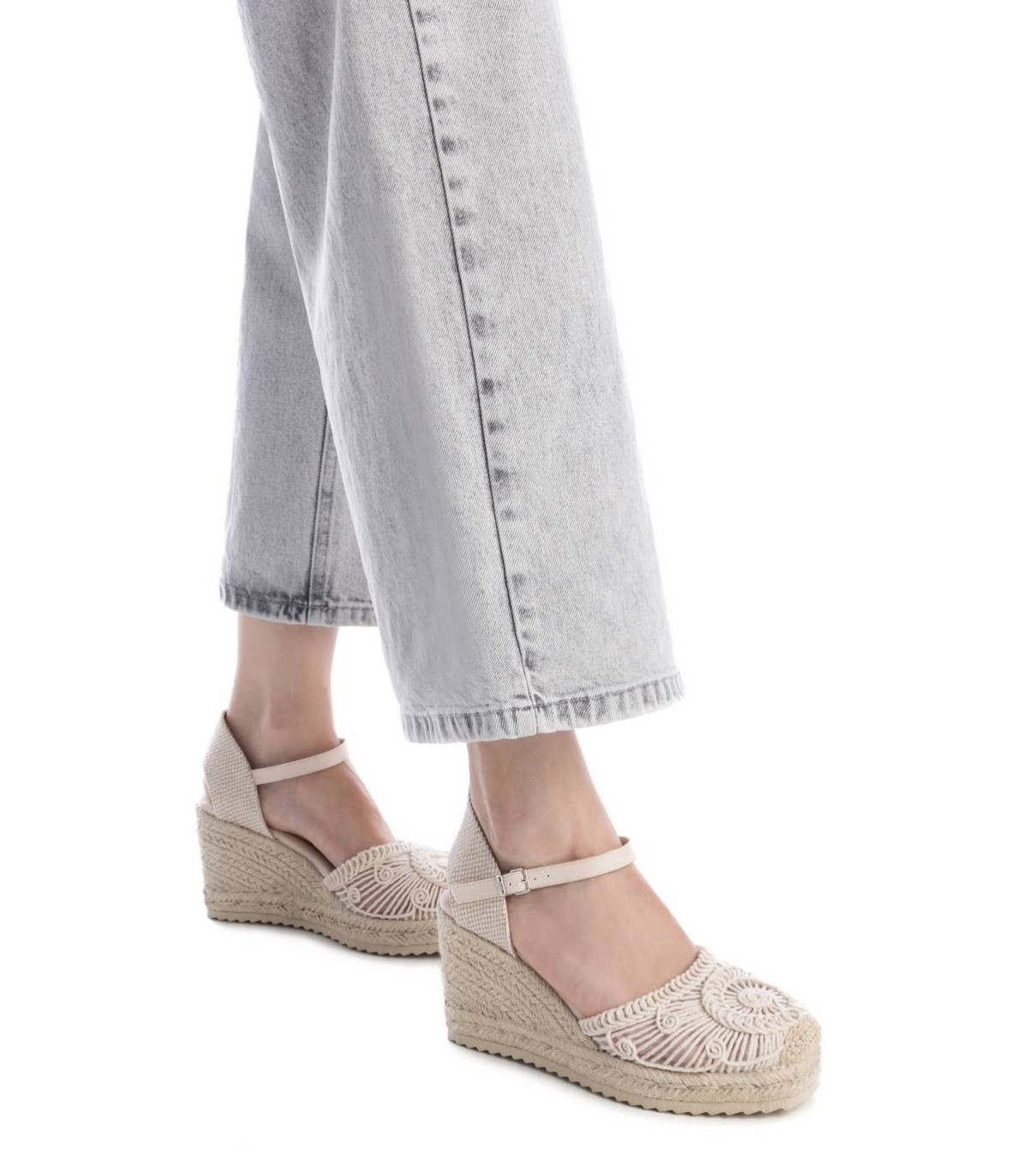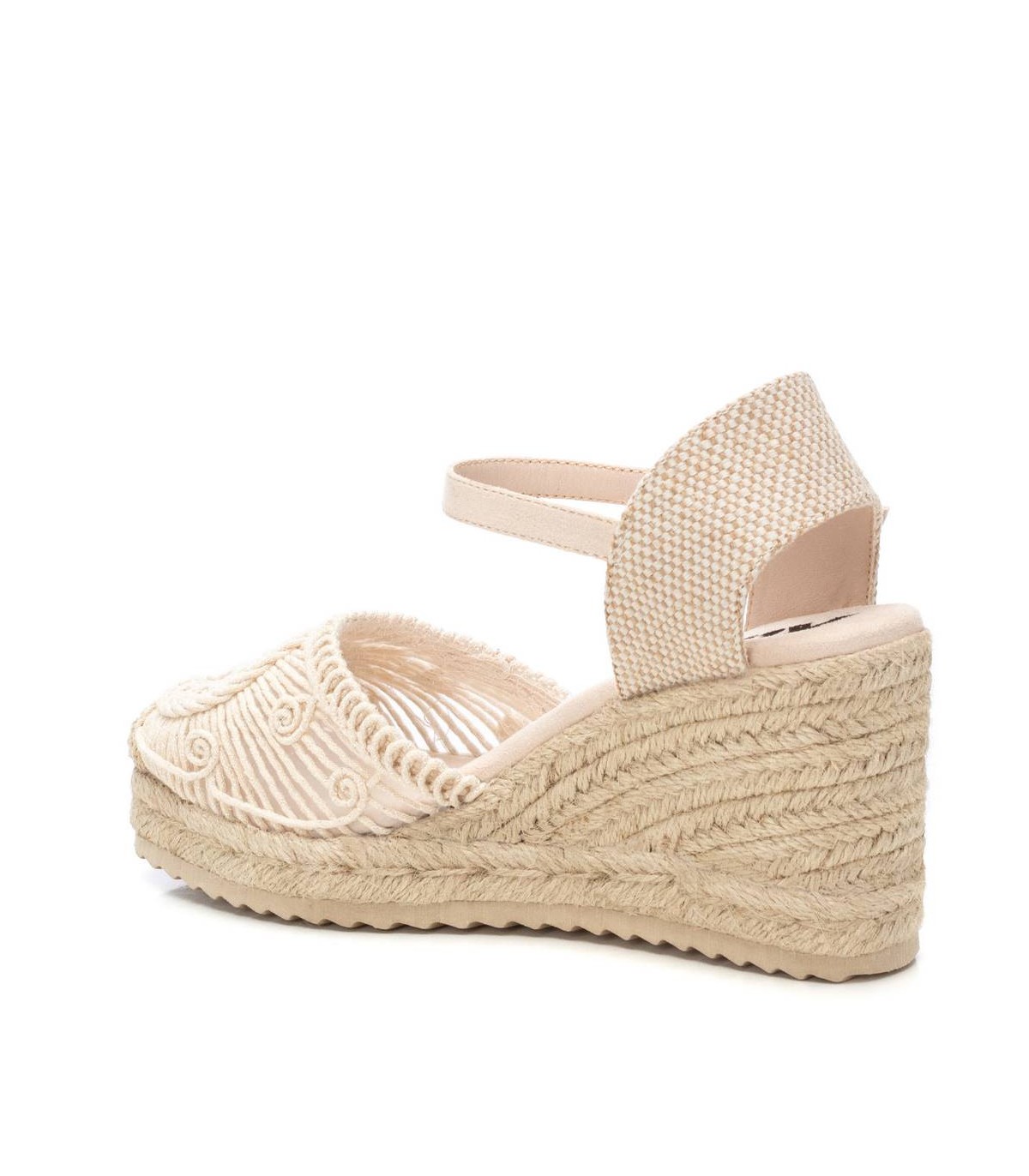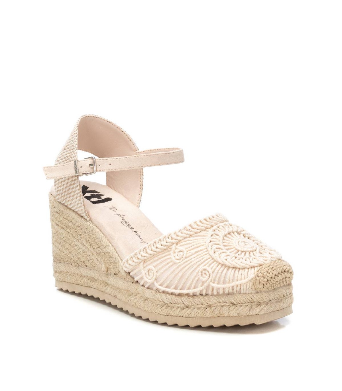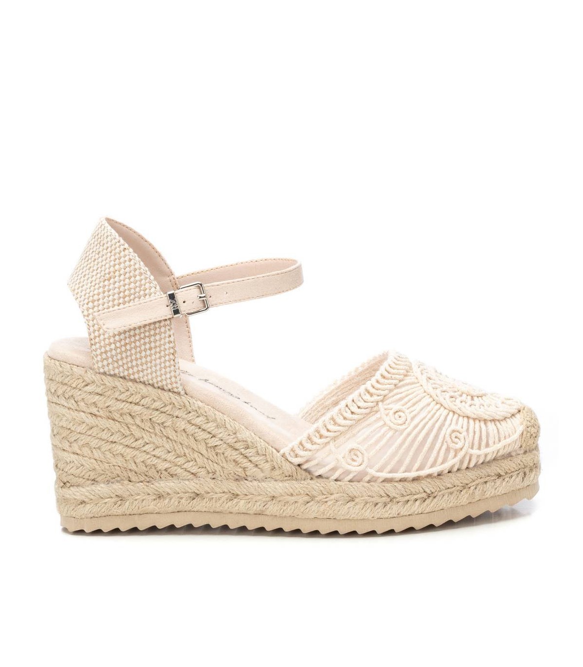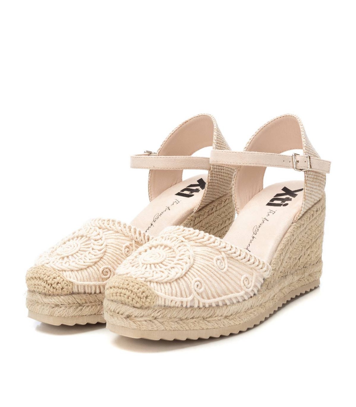 Alpargata de mujer tipo valenciana, de la marca Xti. Fabricado en un precioso motivo de crochet calado, combinado con una trasera de textil para mayor comodidad, será el protagonista de todos tus looks. Cuña de 8 cm de yute con suela de goma antideslizante. Cinta que sujeta al tobillo con hebilla metálica. Este modelo ha obtenido el certificado vegano por la organización mundial PETA (Organización de los derechos de los animales).
