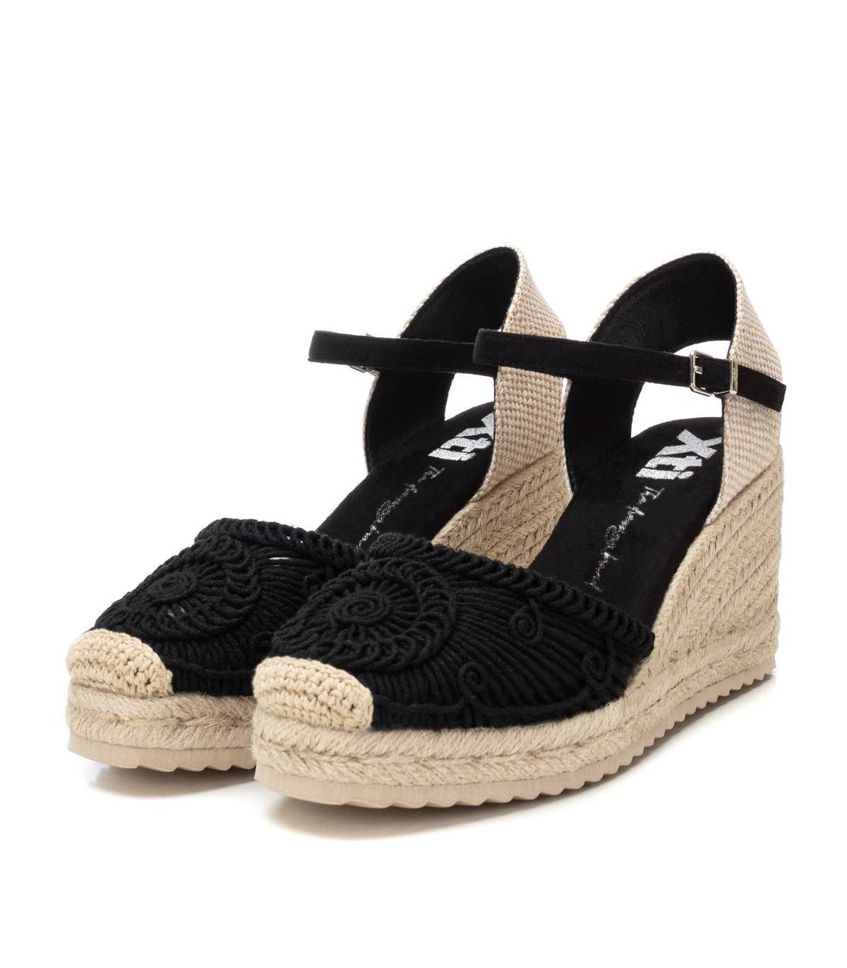 Alpargata de mujer tipo valenciana, de la marca Xti. Fabricado en un precioso motivo de crochet calado, combinado con una trasera de textil para mayor comodidad, será el protagonista de todos tus looks. Cuña de 8 cm de yute con suela de goma antideslizante. Cinta que sujeta al tobillo con hebilla metálica. Este modelo ha obtenido el certificado vegano por la organización mundial PETA (Organización de los derechos de los animales).