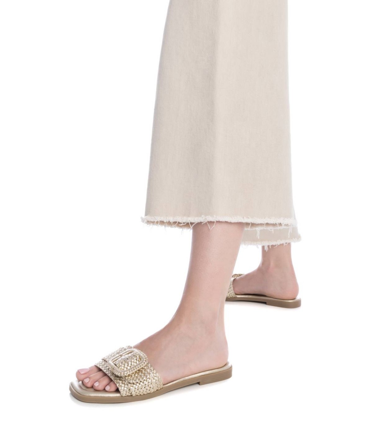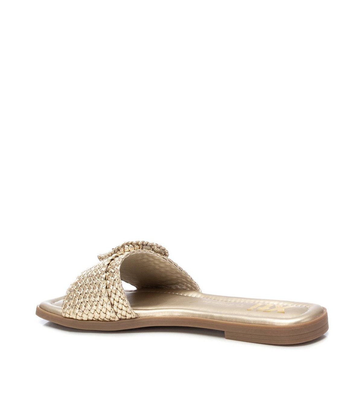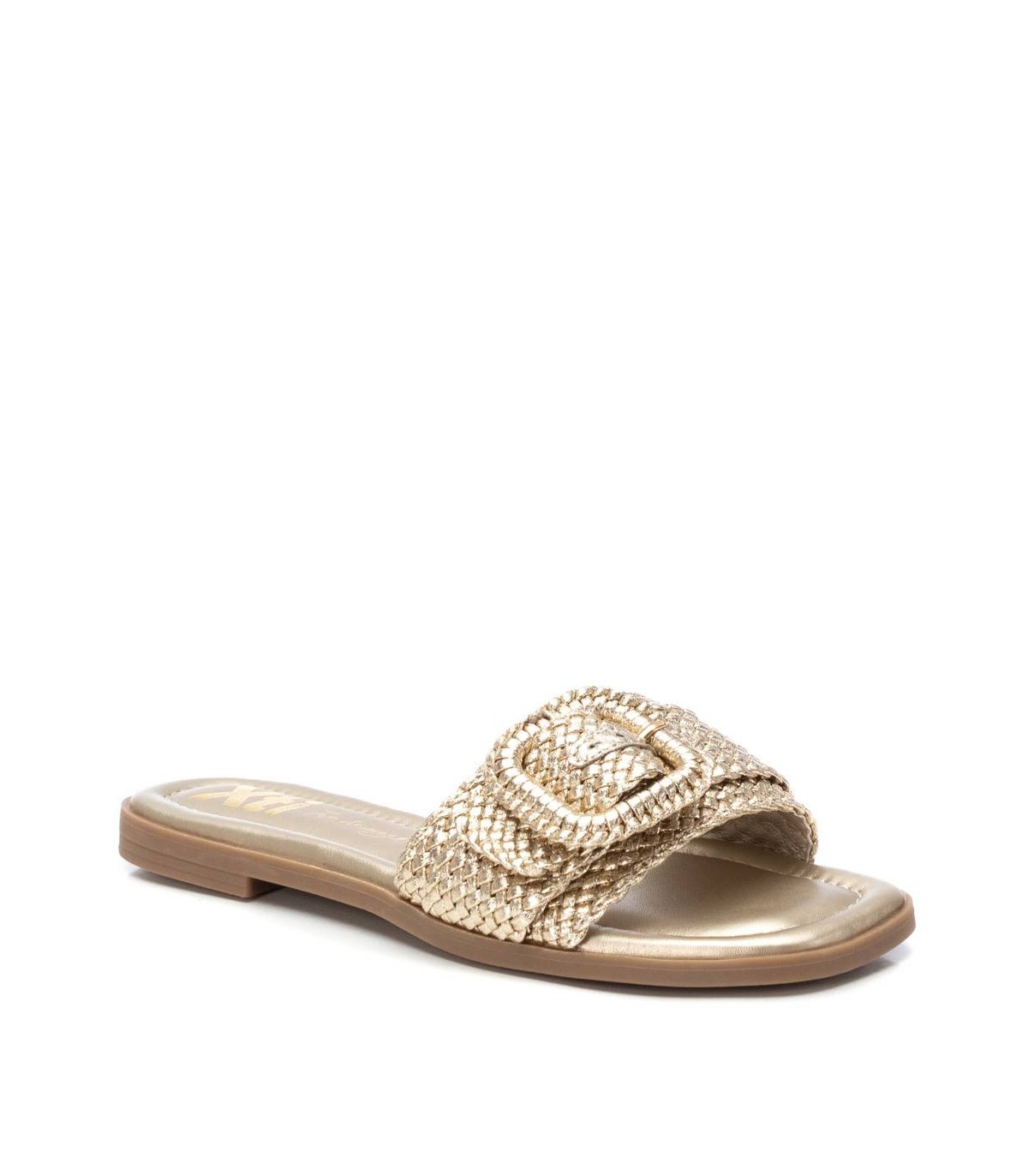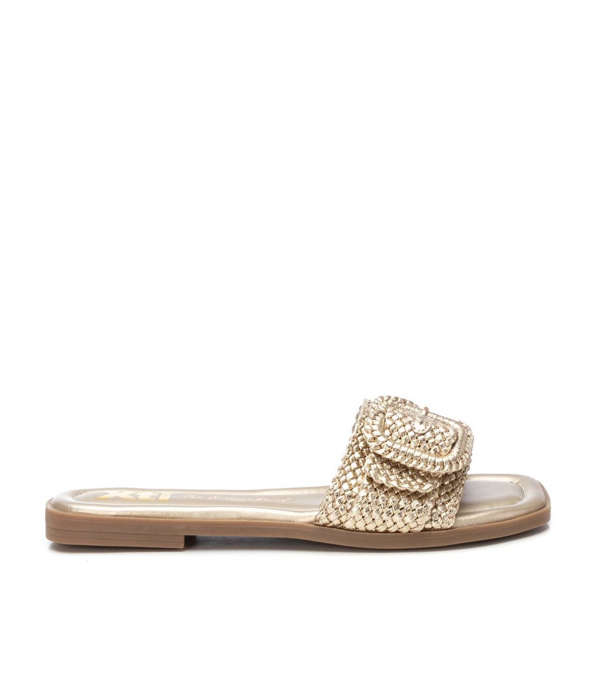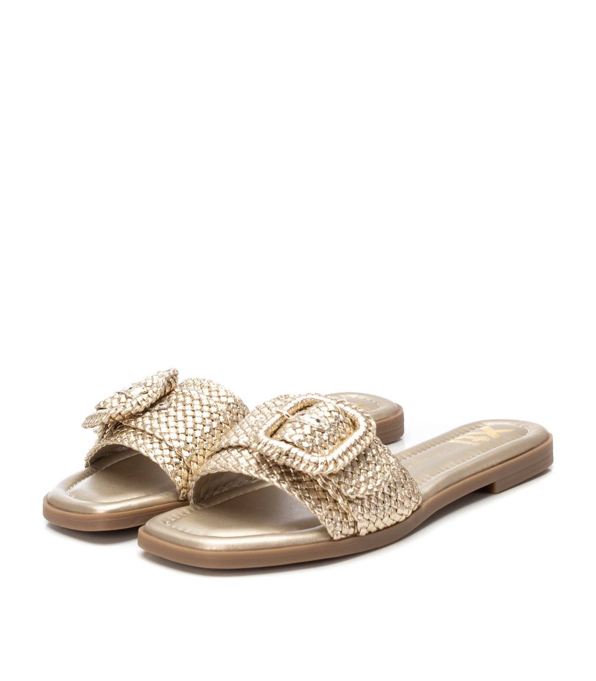Sandalia de mujer, de la marca Xti. Fabricada en material textil con efecto metalizado. Modelo de pala con hebilla decorativa. Super cómodas con suela plana y antideslizante. Este modelo ha obtenido el certificado vegano por la organización mundial PETA (Organización de los derechos de los animales).