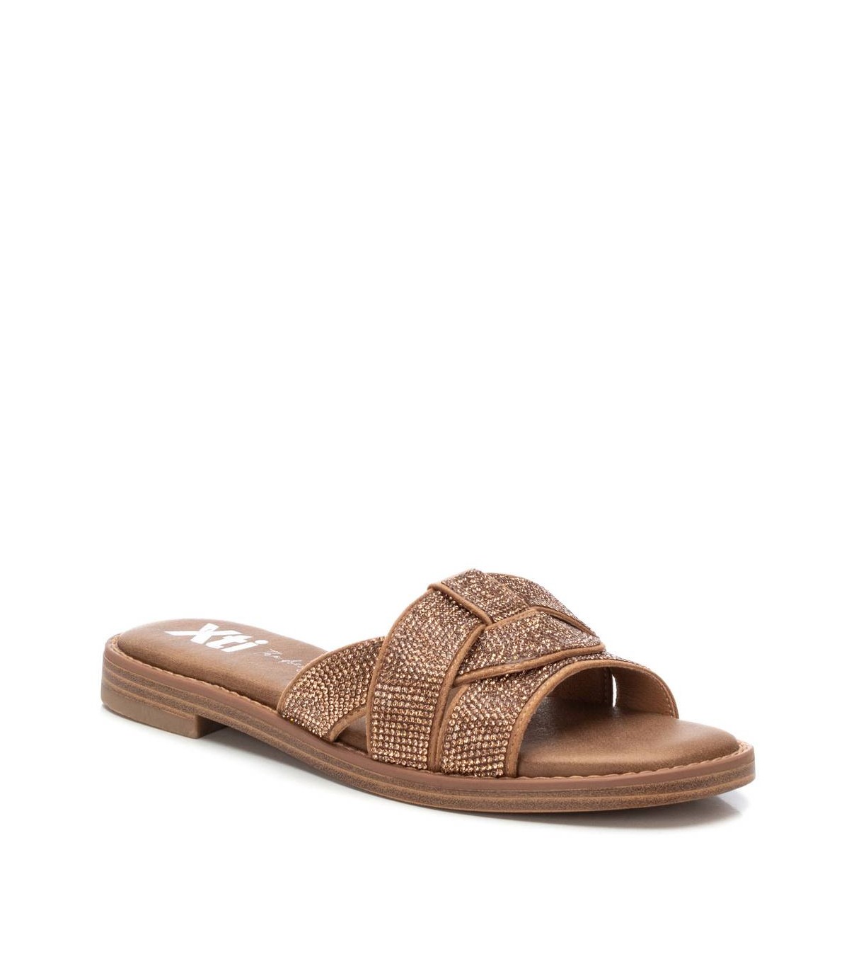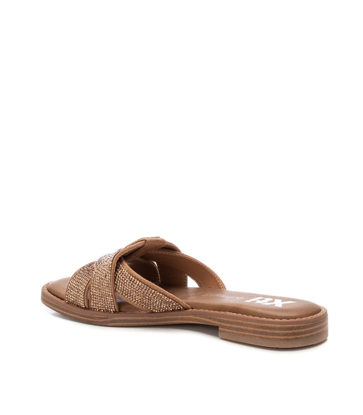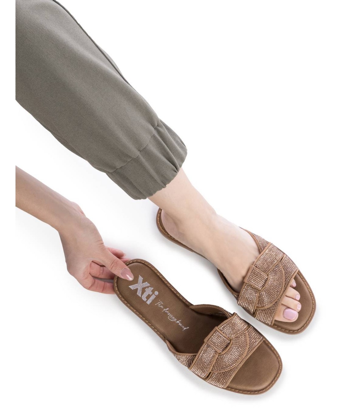 Sandalia de mujer, de la marca Xti. Fabricada en material de antelina decorada con pequeños brillantes al tono que le dan un toque super elegante. Cómoda suela plana y antideslizante. Este modelo ha obtenido el certificado vegano por la organización mundial PETA (Organización de los derechos de los animales).