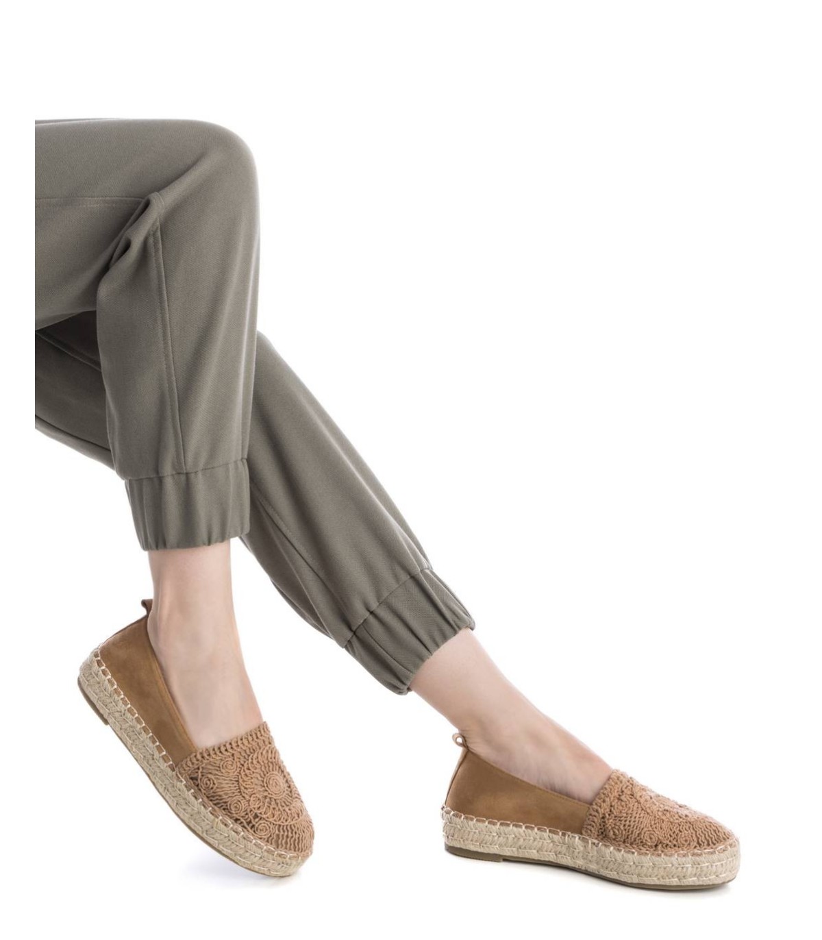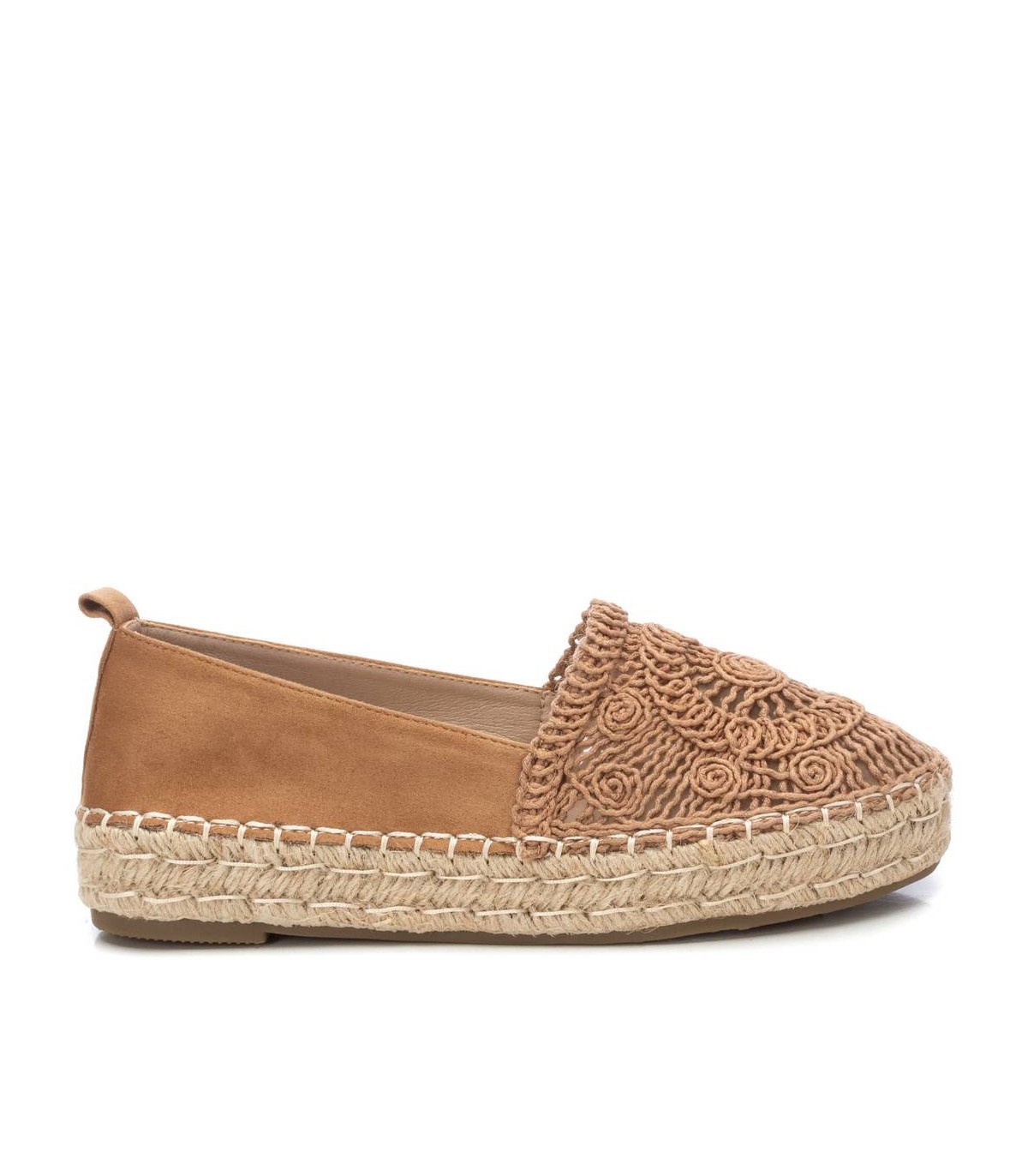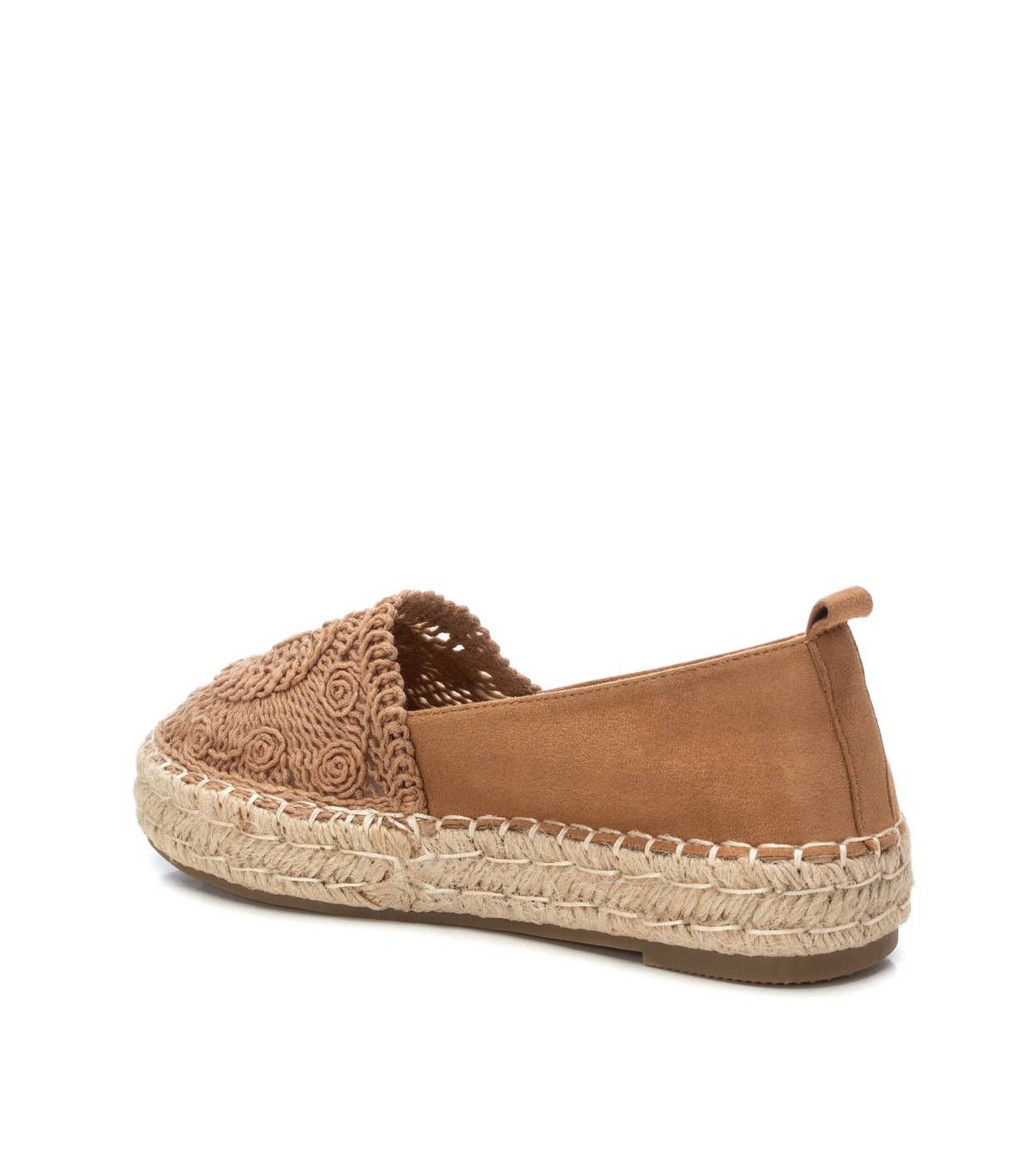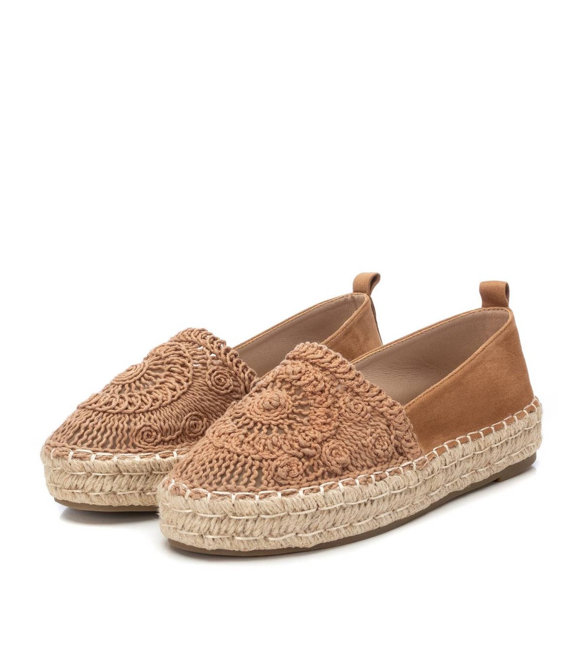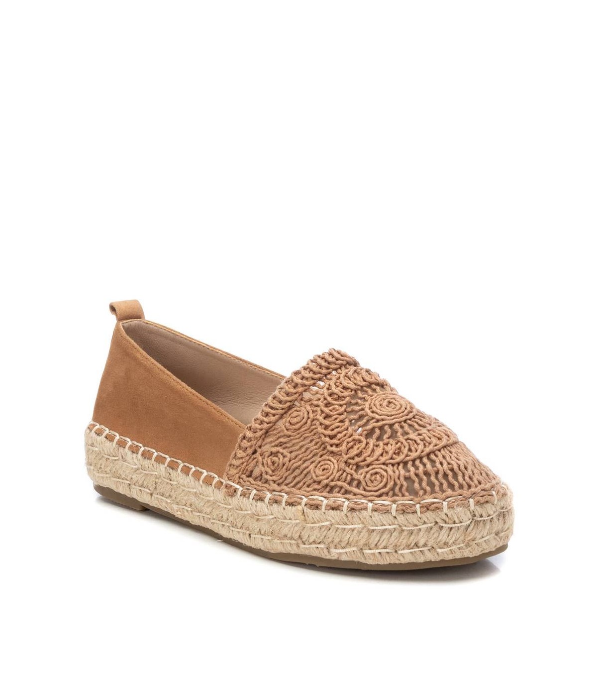 Alpargata de mujer , de la marca Xti. Fabricada en material textil combinada con bonito diseño de crochet al tono. Suela plana de yute y antideslizante. Este modelo ha obtenido el certificado vegano por la organización mundial PETA (Organización de los derechos de los animales).