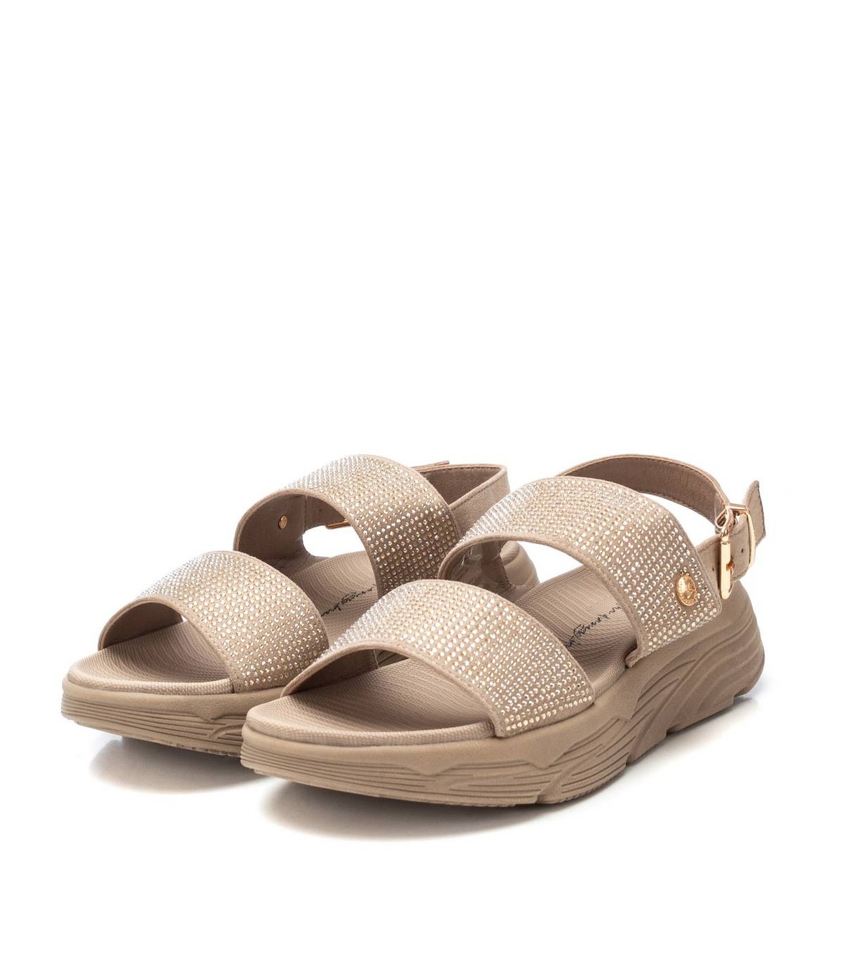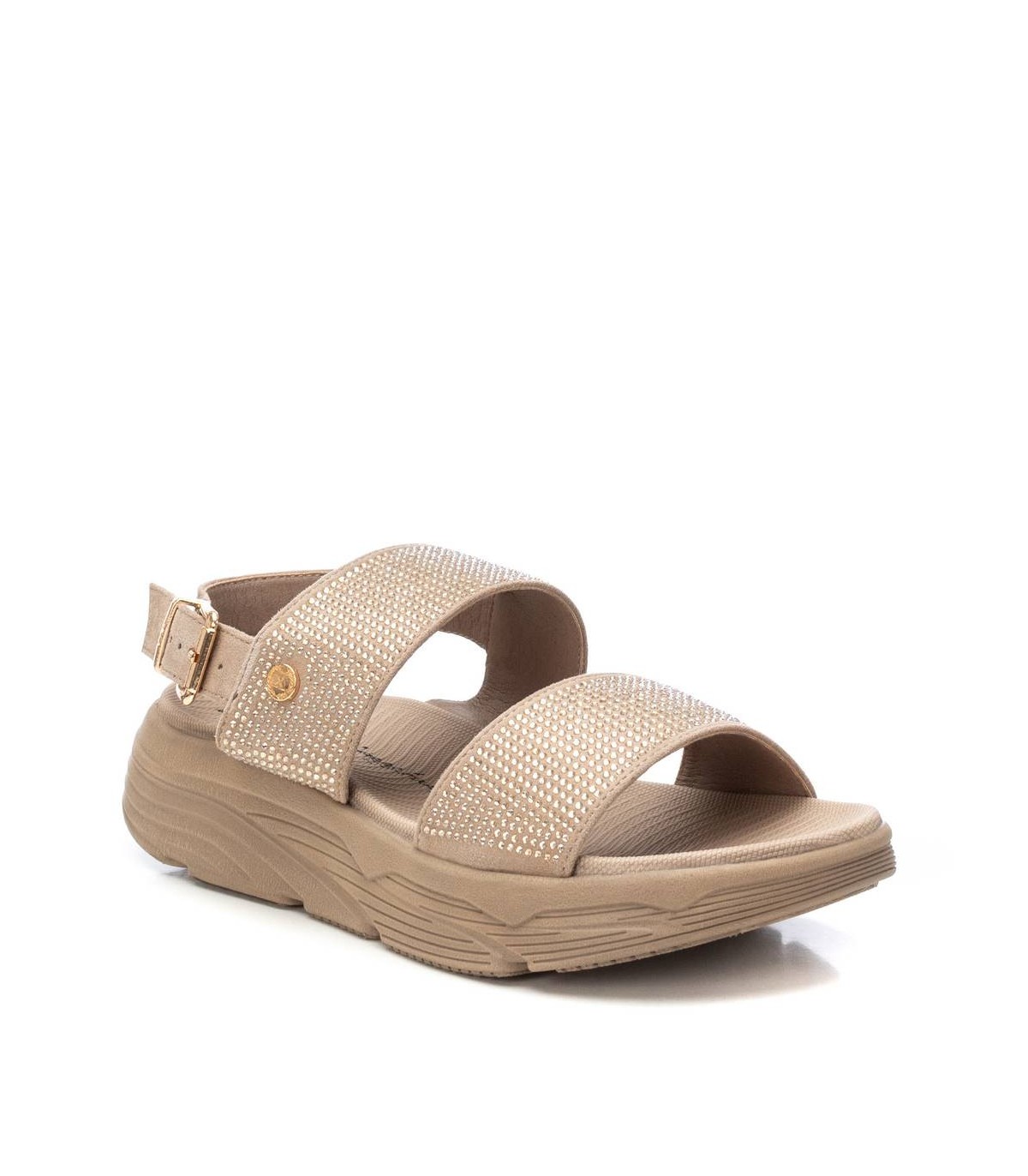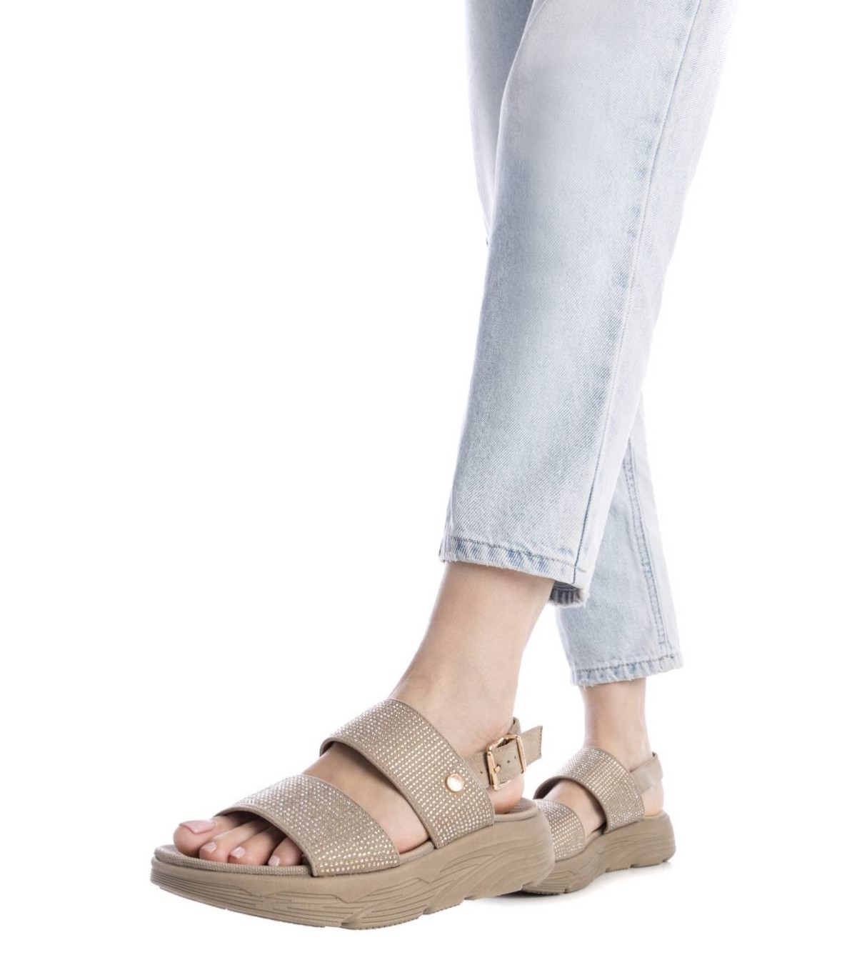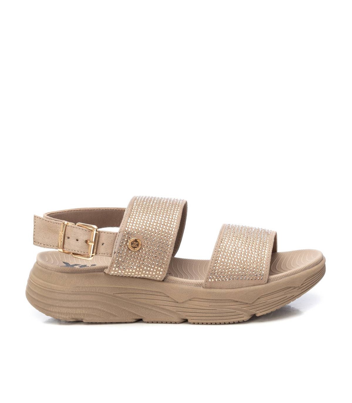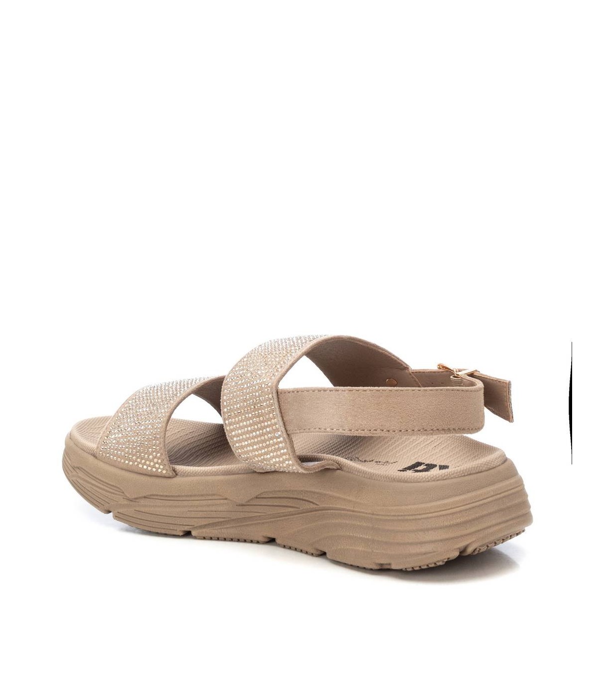 Sandalia de mujer de la marca Xti. Fabricada en material de antelina. Diseño de doble pala con brillos decorativos y cinta que sujeta al tobillo con hebilla metálica. Suela deportiva y antideslizante. Super cómodas para llevar durante todo el día. Este modelo ha obtenido el certificado vegano por la organización mundial PETA (Organización de los derechos de los animales).