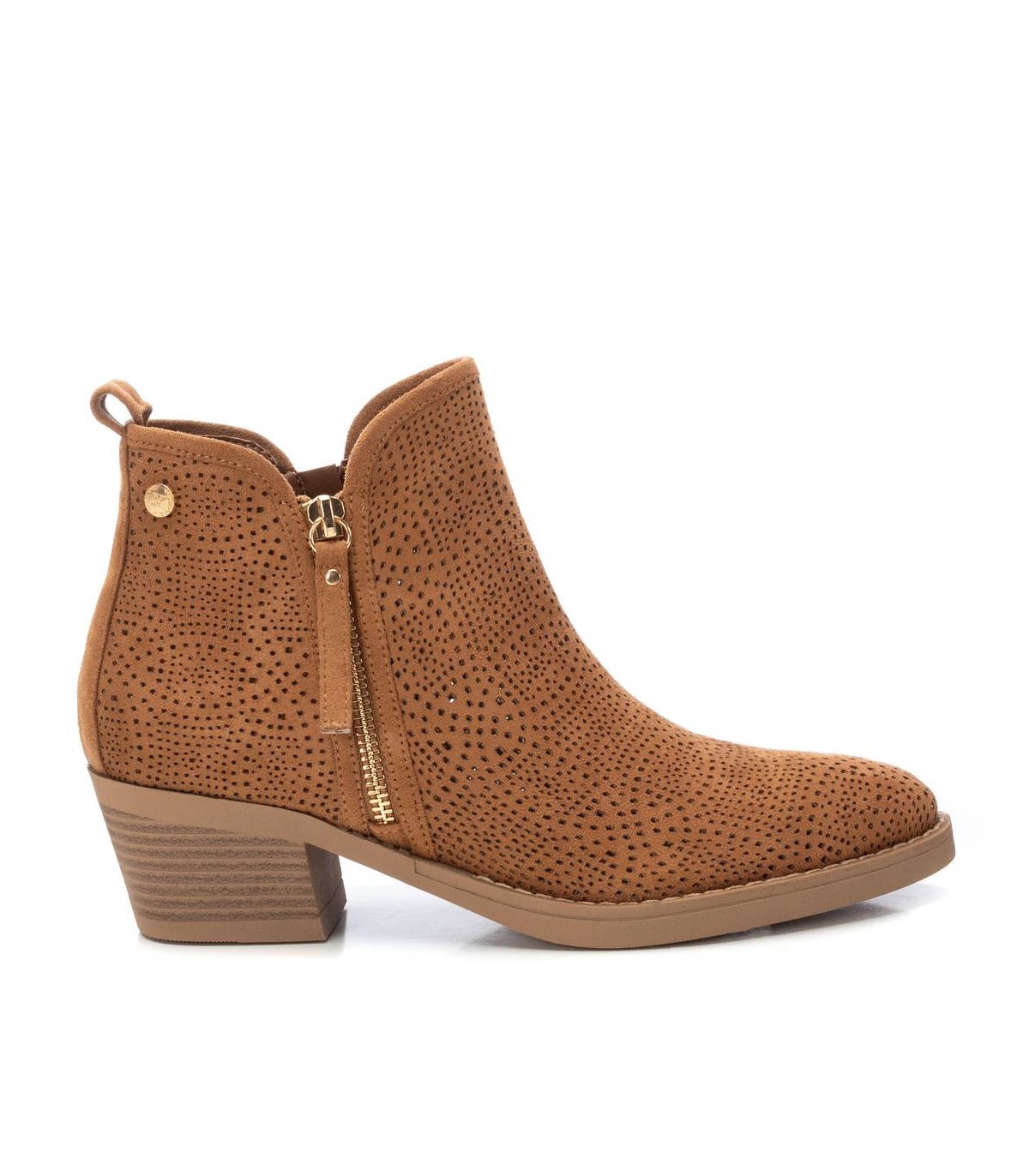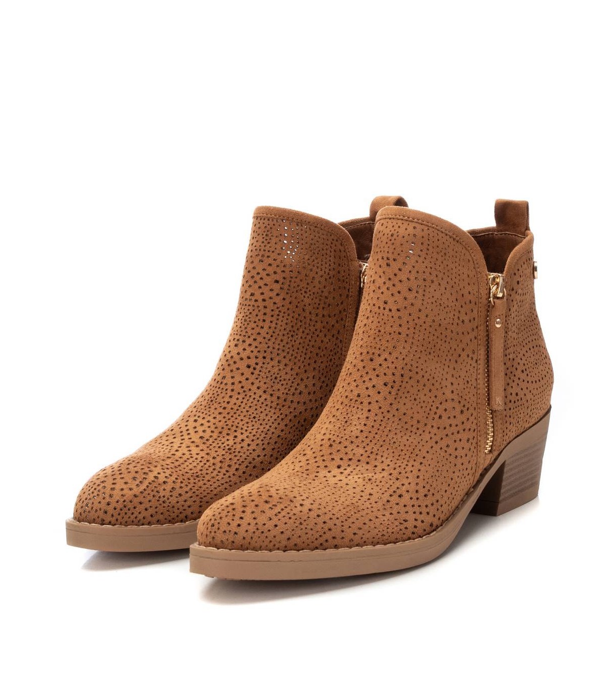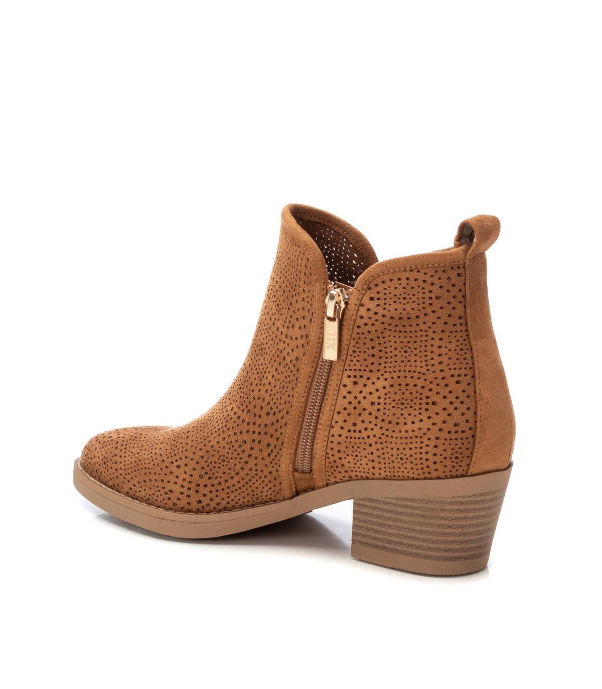Botín de tacón de mujer, de la marca Xti. Fabricado en suave antelina con diseño troquelado, ideal para esta temporada. Cierre con cremallera lateral y tirador trasero para facilitar la puesta. Cómodo tacón ancho de 5 cm con suela antideslizante. Este modelo ha obtenido el certificado vegano por la organización mundial PETA (Organización de los derechos de los animales).