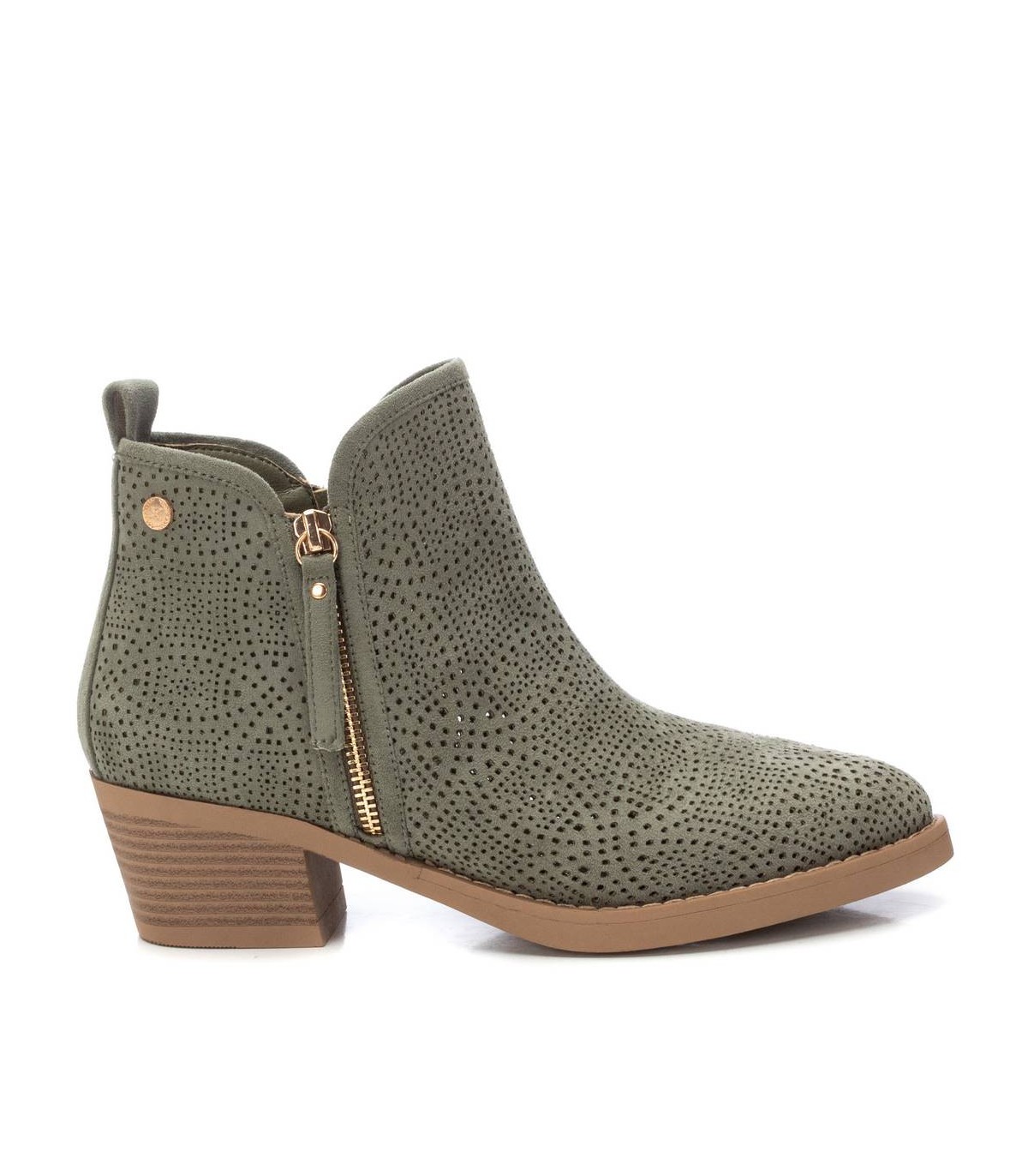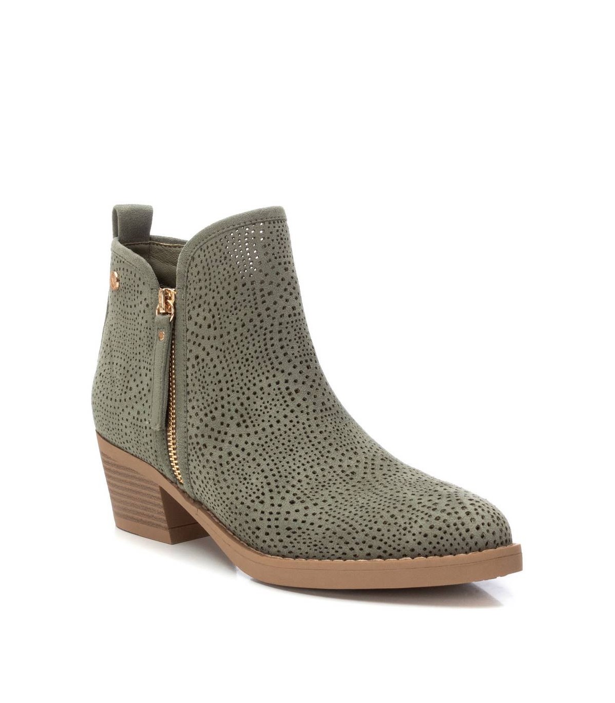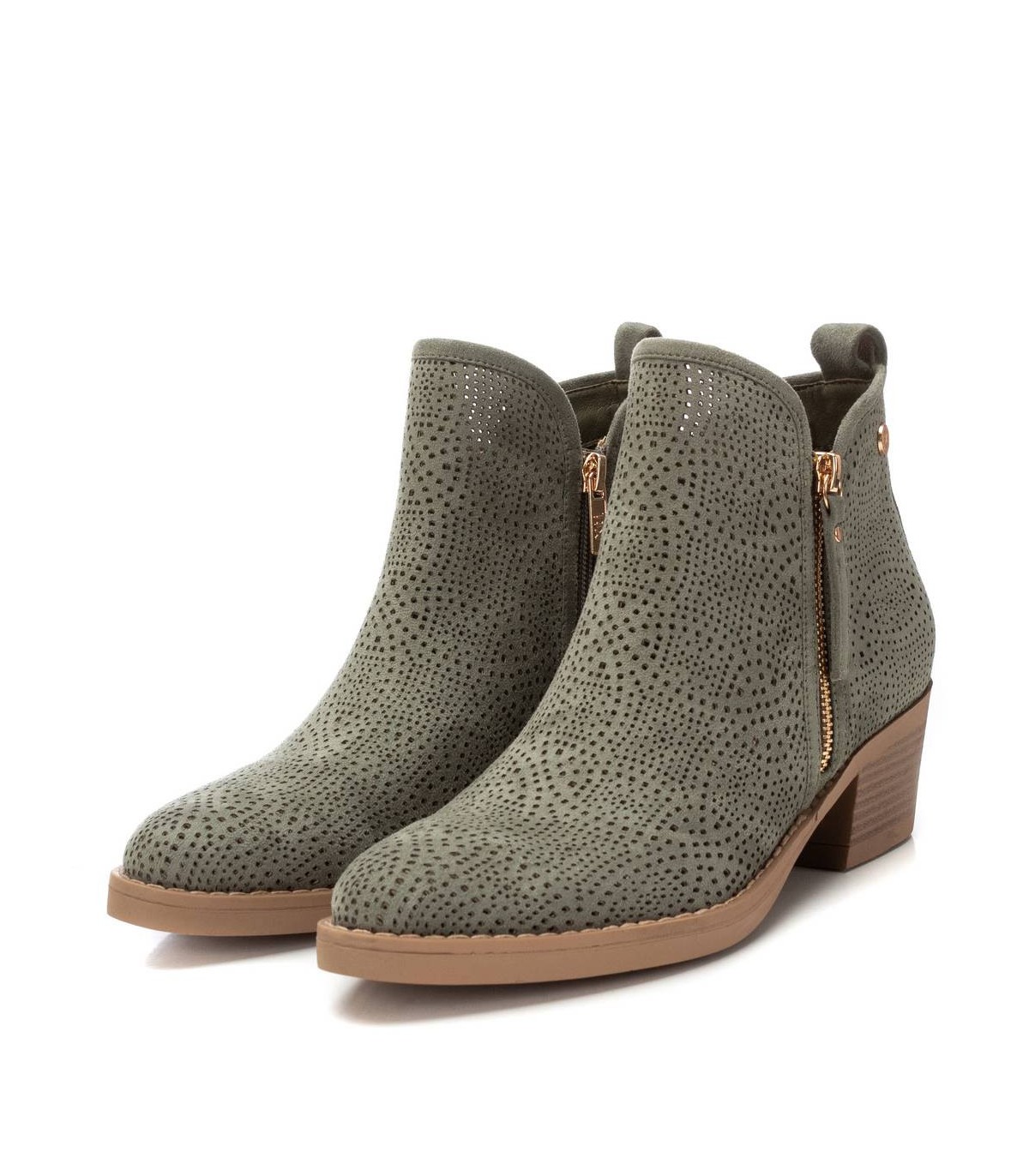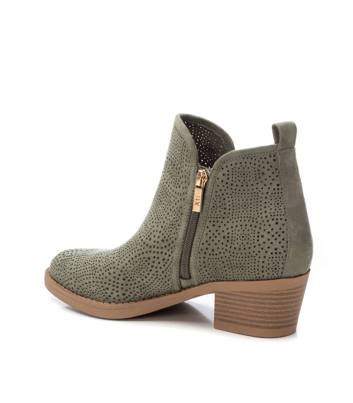 Botín de tacón de mujer, de la marca Xti. Fabricado en suave antelina con diseño troquelado, ideal para esta temporada. Cierre con cremallera lateral y tirador trasero para facilitar la puesta. Cómodo tacón ancho de 5 cm con suela antideslizante. Este modelo ha obtenido el certificado vegano por la organización mundial PETA (Organización de los derechos de los animales).