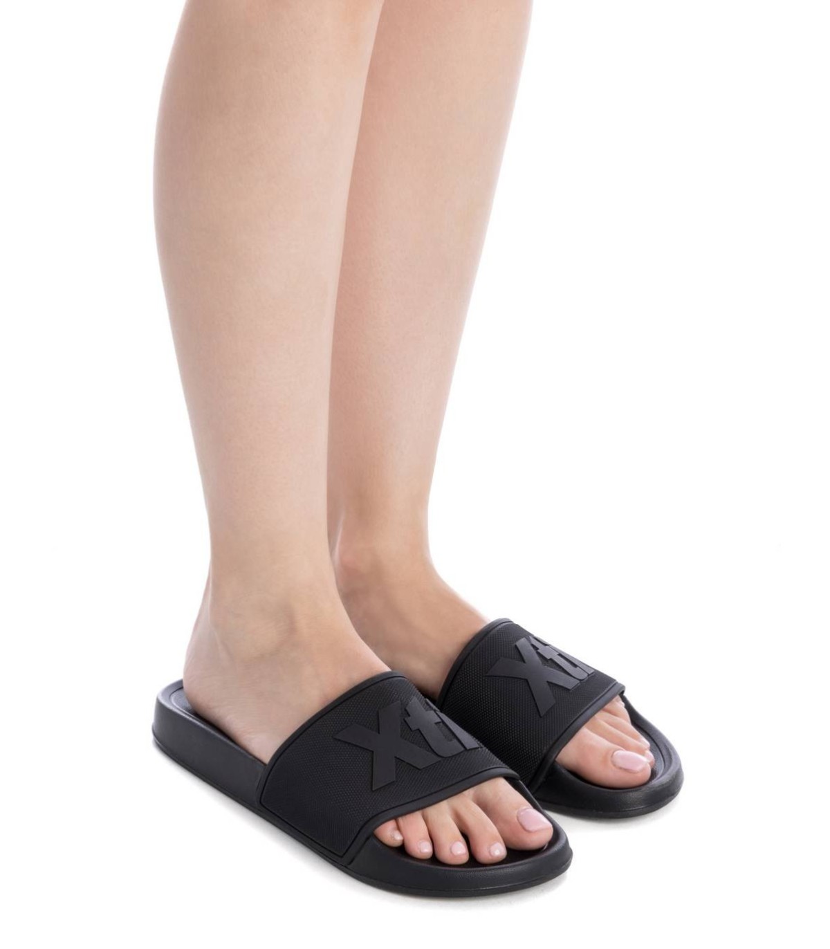Chancla de mujer, de la marca Xti. Fabricada en goma, perfecta para los días más calurosos. Suela de goma antideslizante. Este modelo ha obtenido el certificado vegano por la organización mundial PETA (Organización de los derechos de los animales).