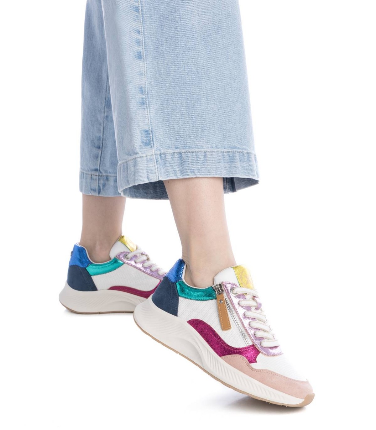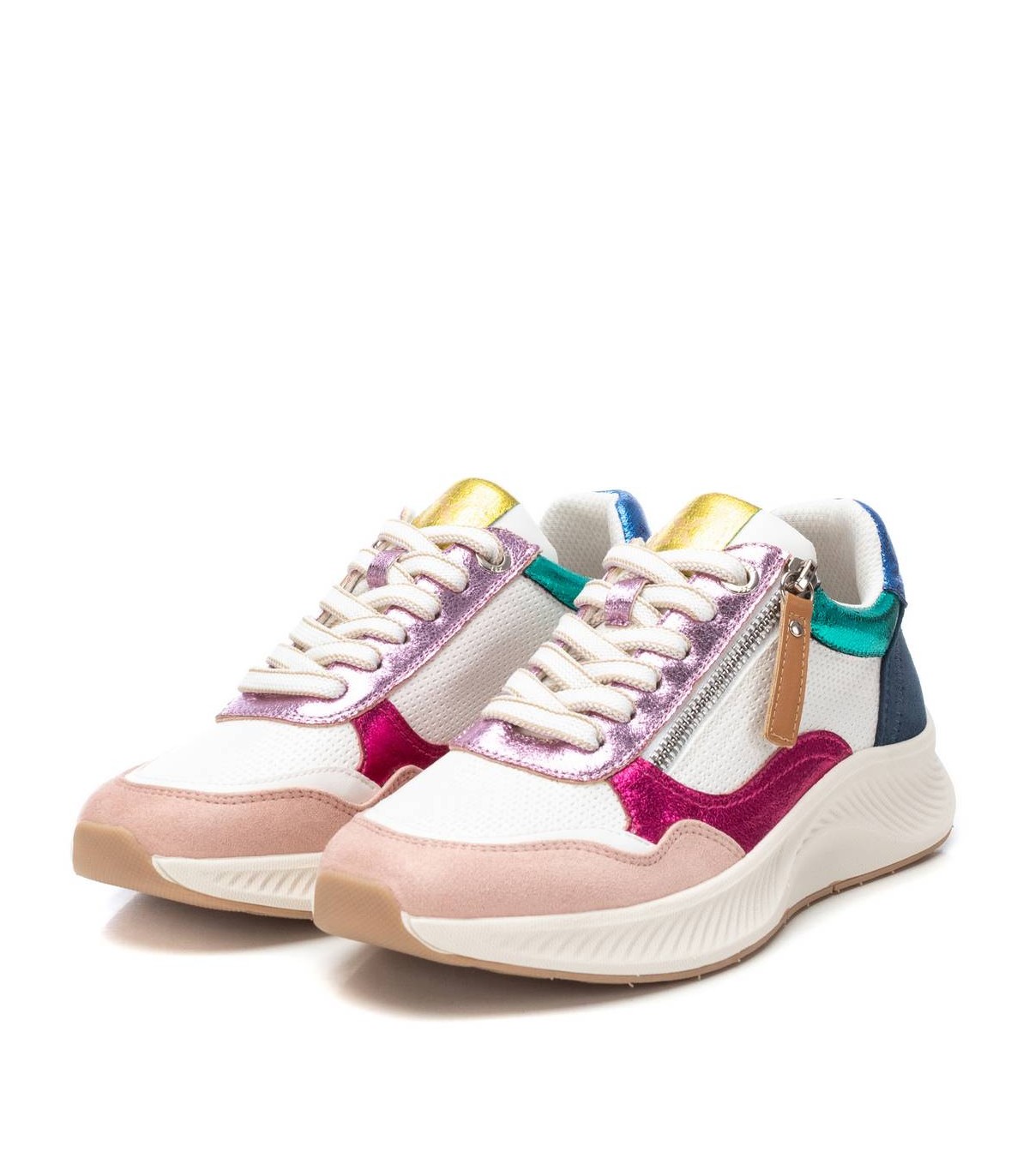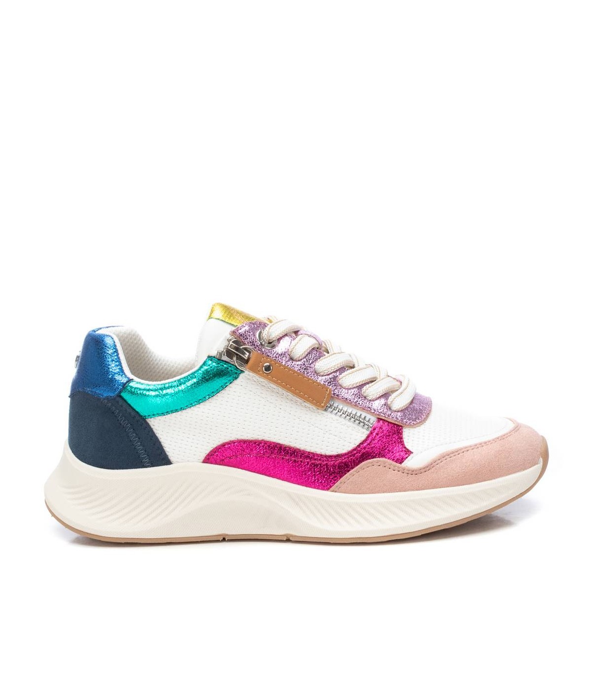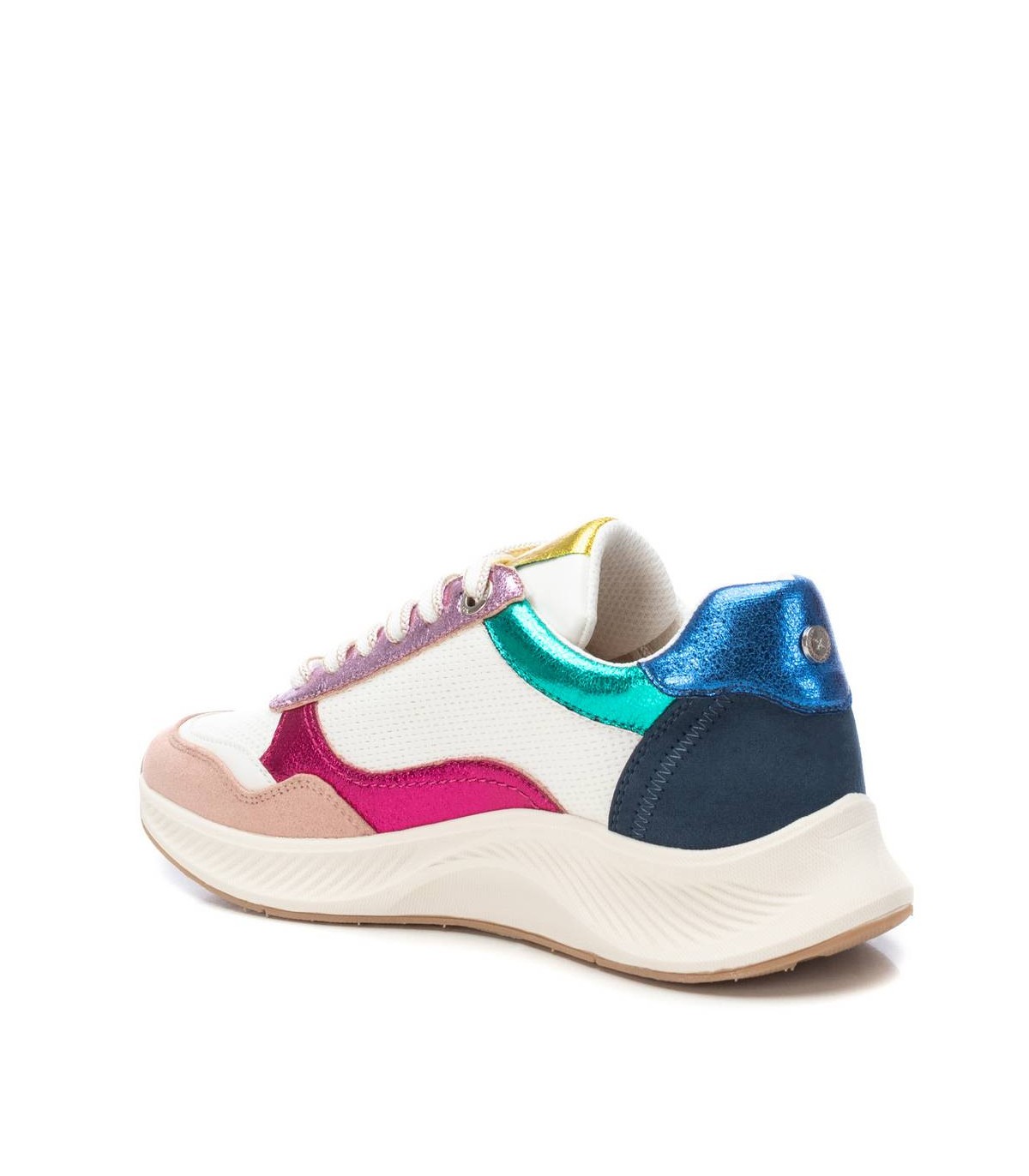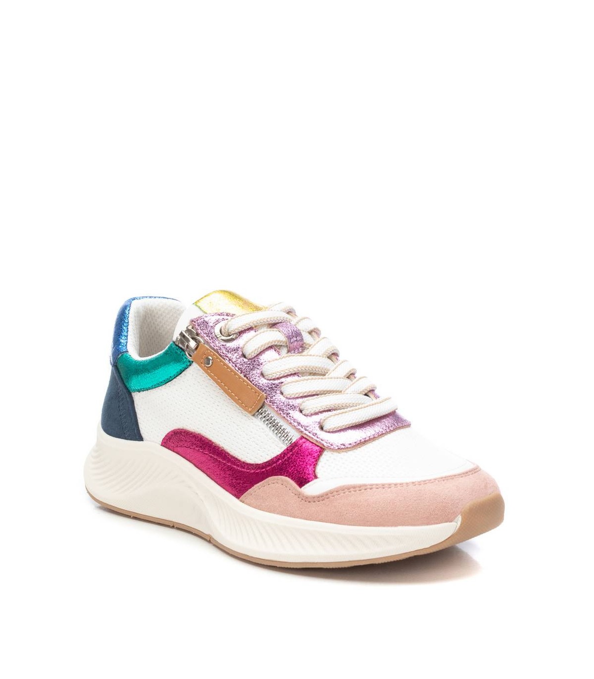 Zapatilla de mujer, de la marca Xti. Fabricada en combinación de textil y material que imita la piel con efecto metalizado. Cierre mediante cremallera. Con plantilla extraíble. Este modelo ha obtenido el certificado vegano por la organización mundial PETA (Organización de los derechos de los animales).