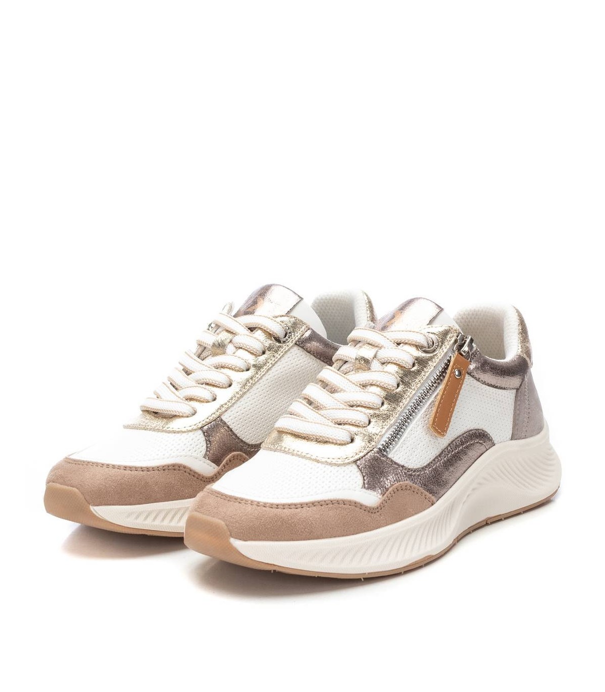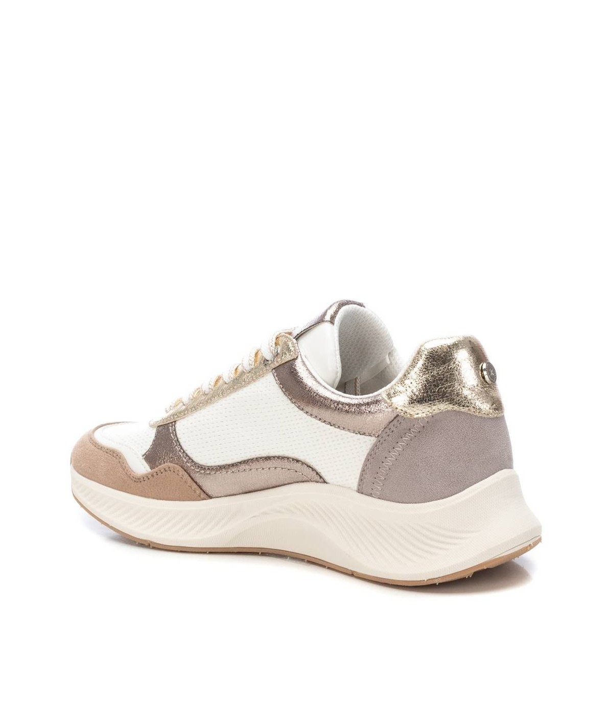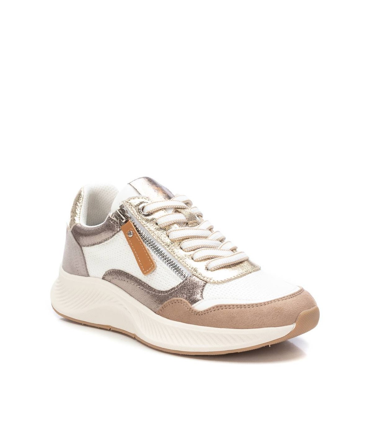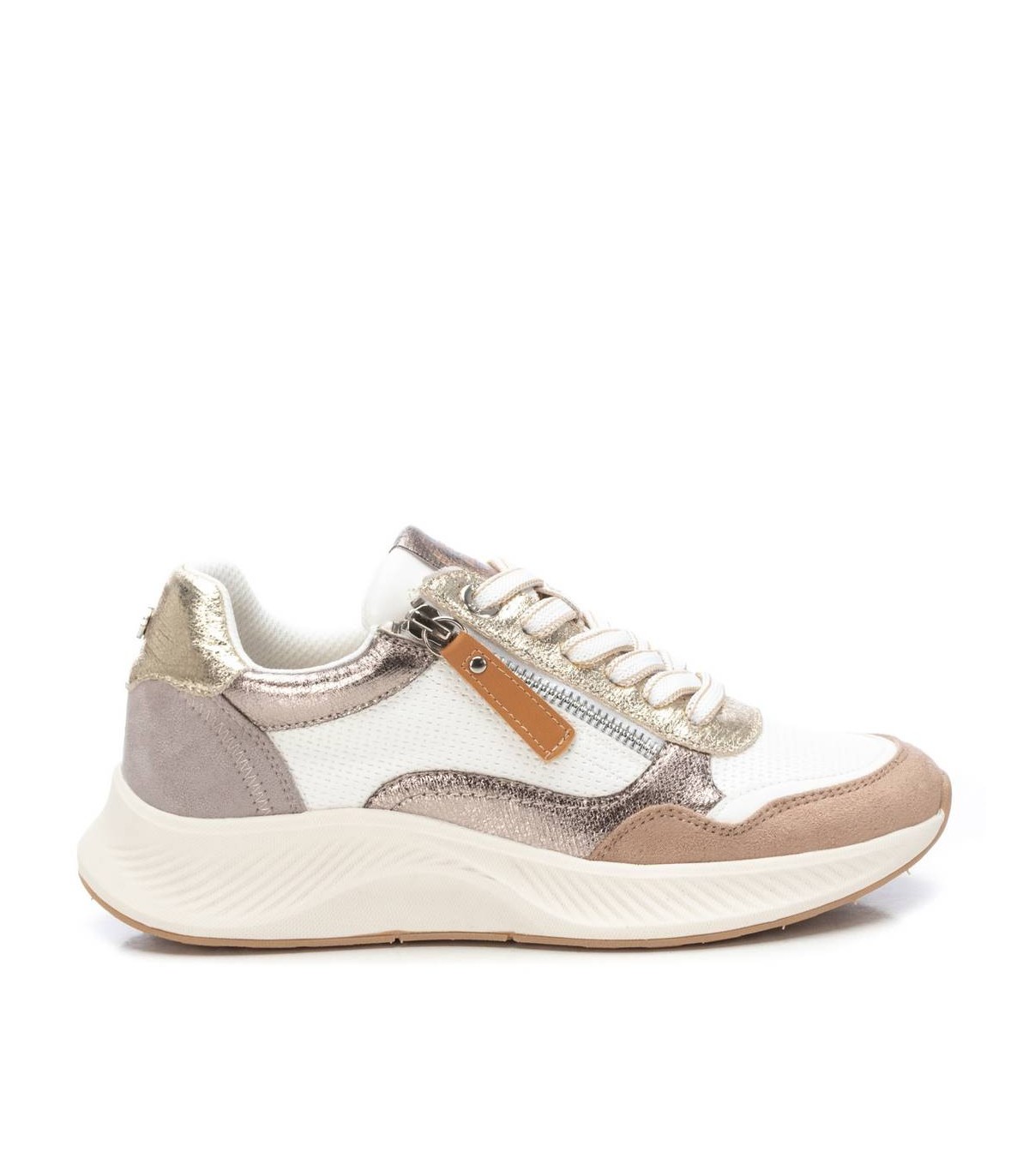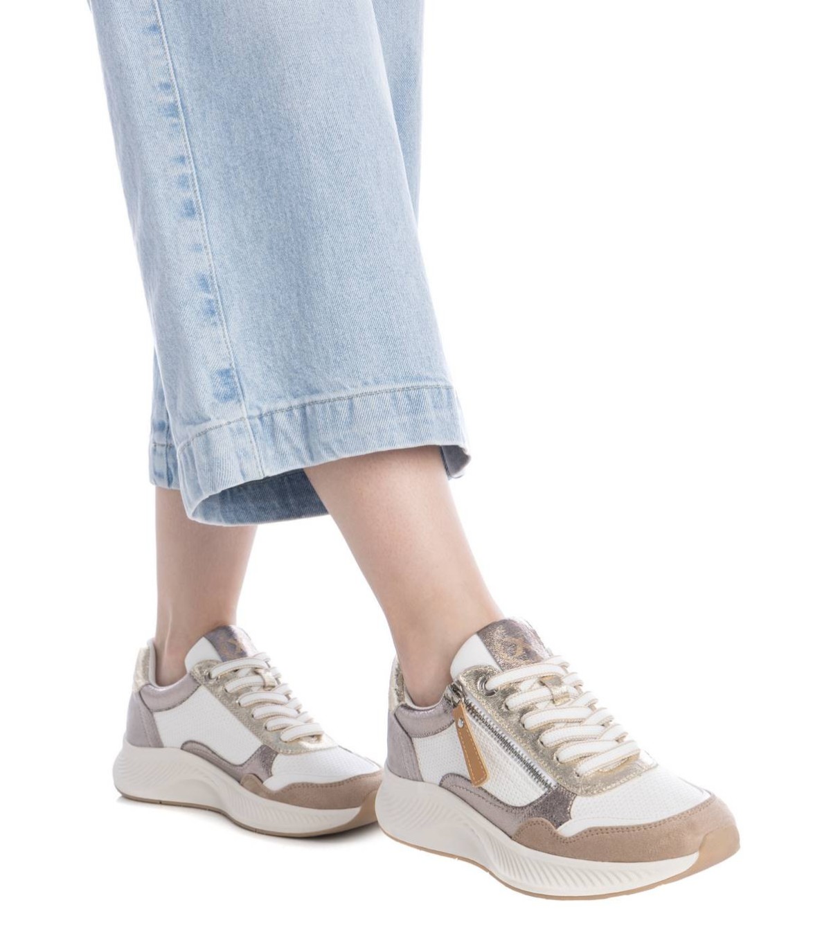 Zapatilla de mujer, de la marca Xti. Fabricada en combinación de textil y material que imita la piel con efecto metalizado. Cierre mediante cremallera. Con plantilla extraíble. Este modelo ha obtenido el certificado vegano por la organización mundial PETA (Organización de los derechos de los animales).