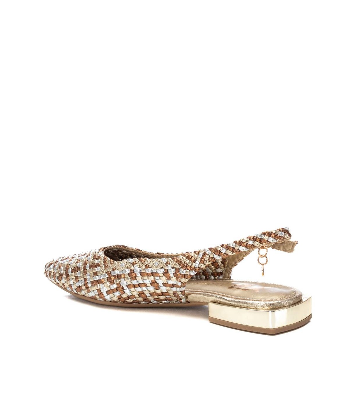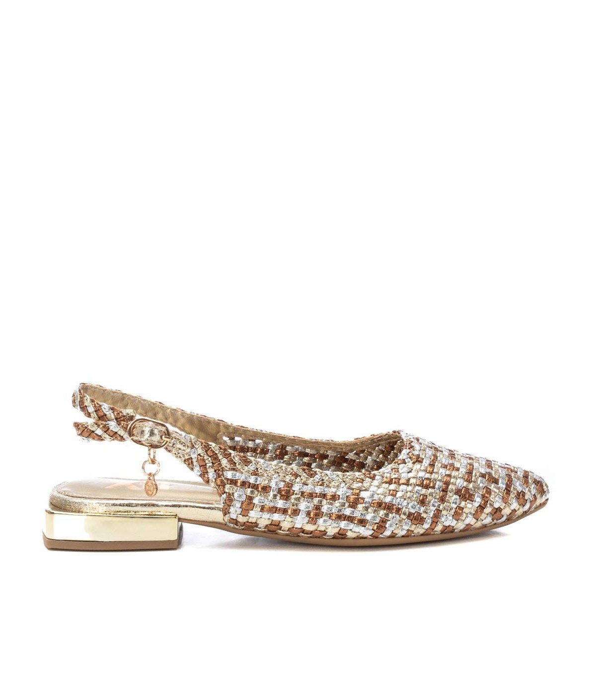 Zapato destalonado de mujer, de la marca Xti. Fabricado en material textil con acabado metalizado. Modelo trenzado con pulsera con hebilla en el tobillo con muy buena sujeción. Ideal para todos tus conjuntos. Este modelo ha obtenido el certificado vegano por la organización mundial PETA (Organización de los derechos de los animales).