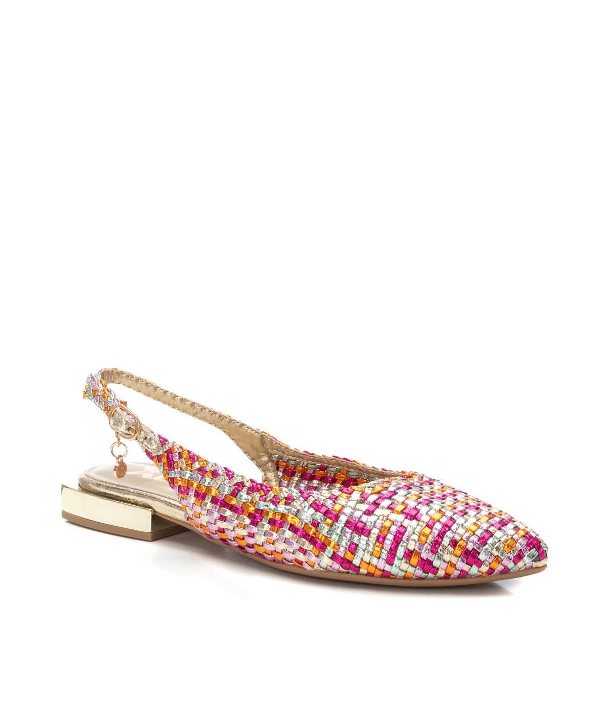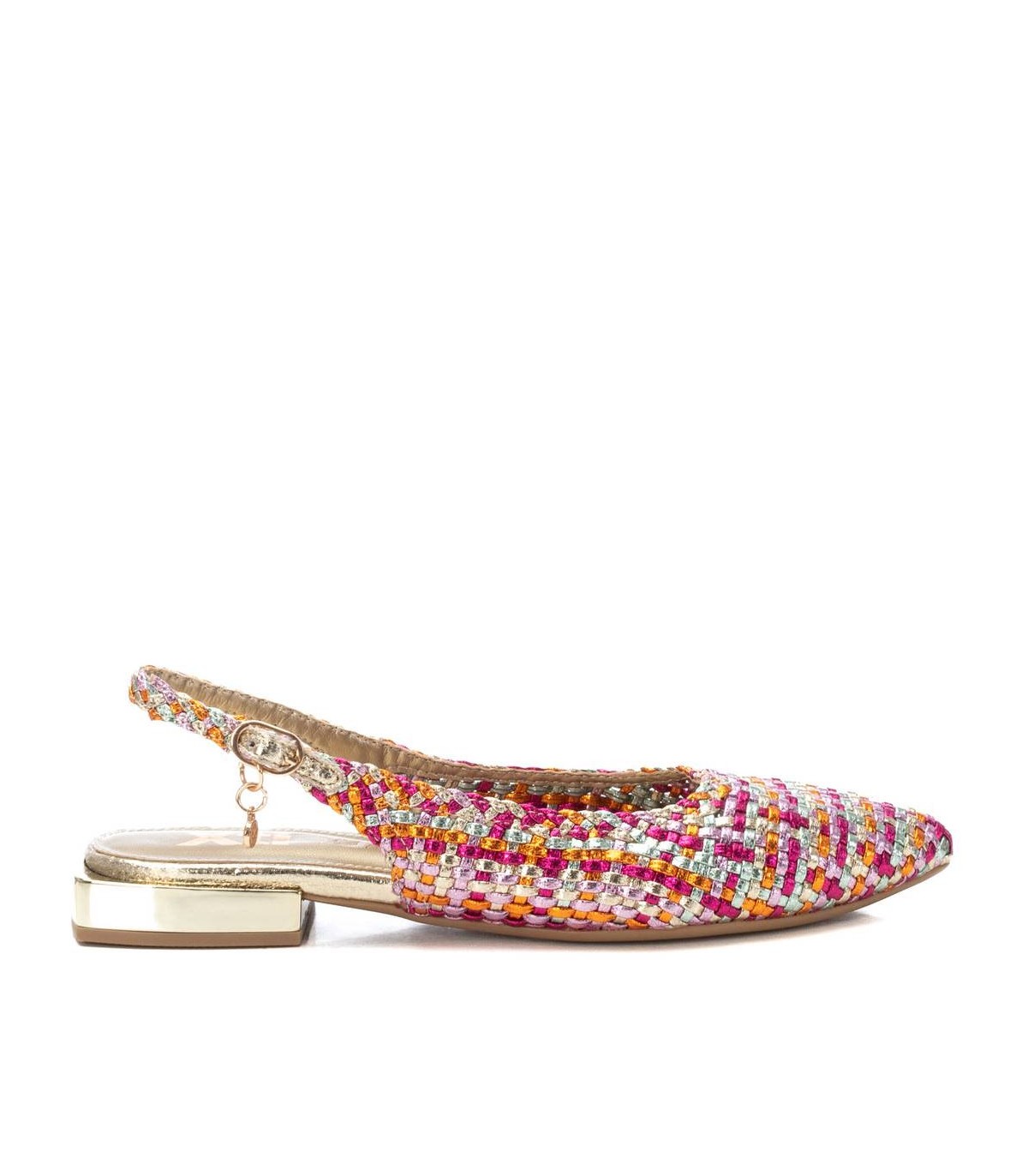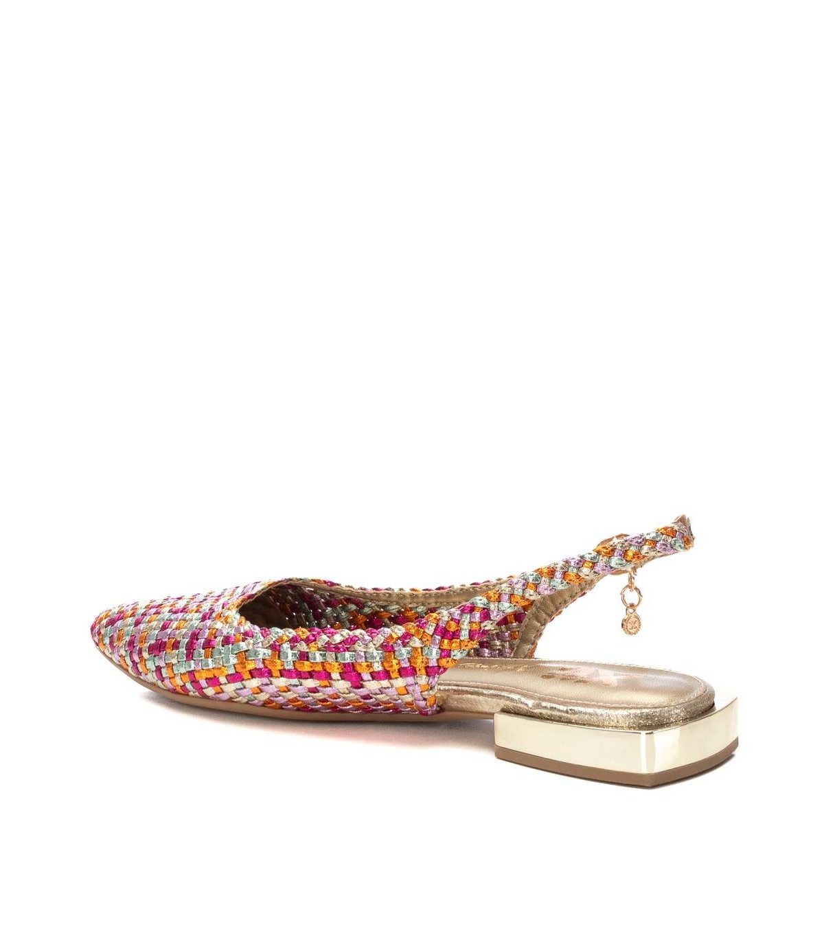 Zapato destalonado de mujer, de la marca Xti. Fabricado en material textil con acabado metalizado. Modelo trenzado con pulsera con hebilla en el tobillo con muy buena sujeción. Ideal para todos tus conjuntos. Este modelo ha obtenido el certificado vegano por la organización mundial PETA (Organización de los derechos de los animales).