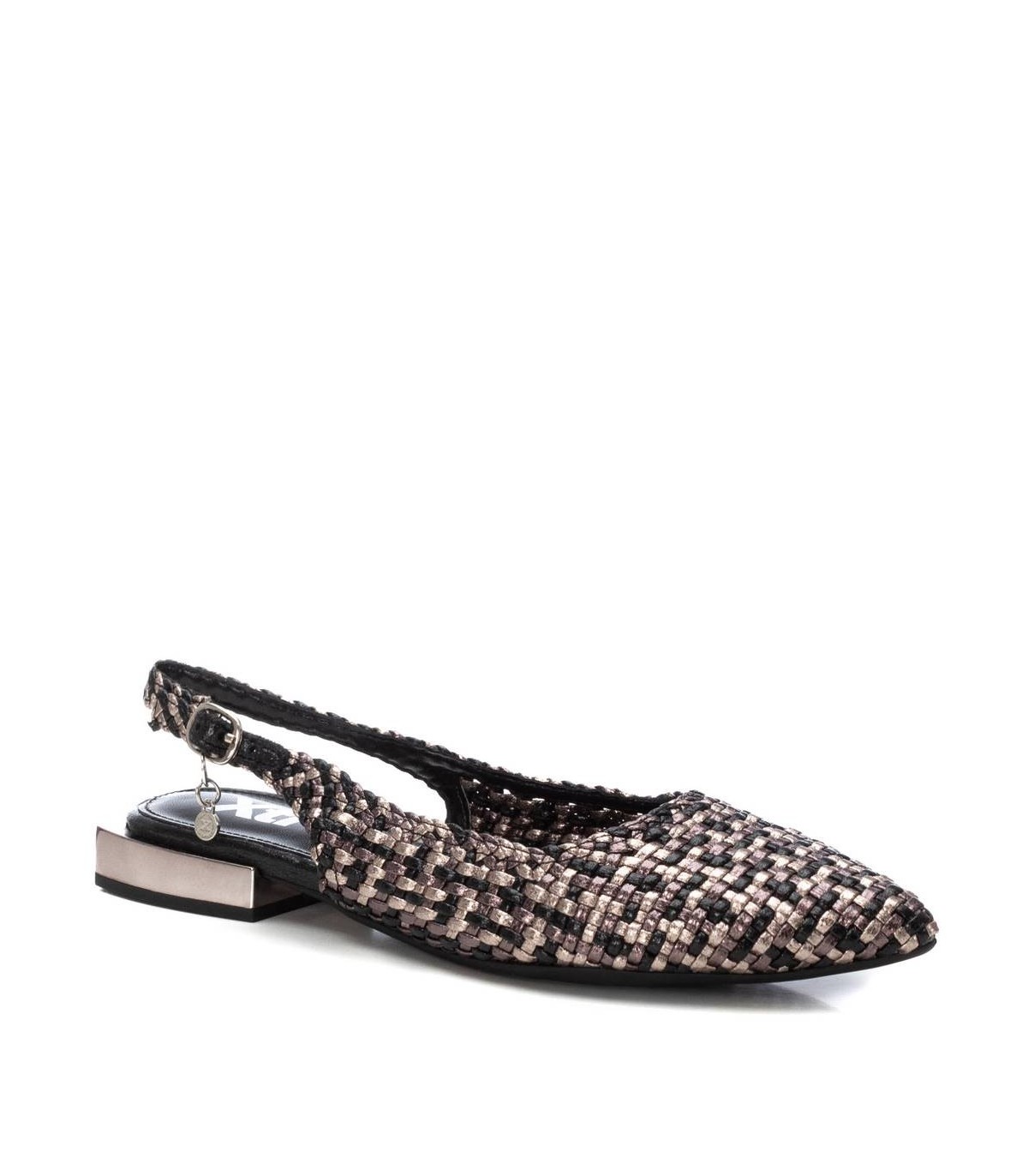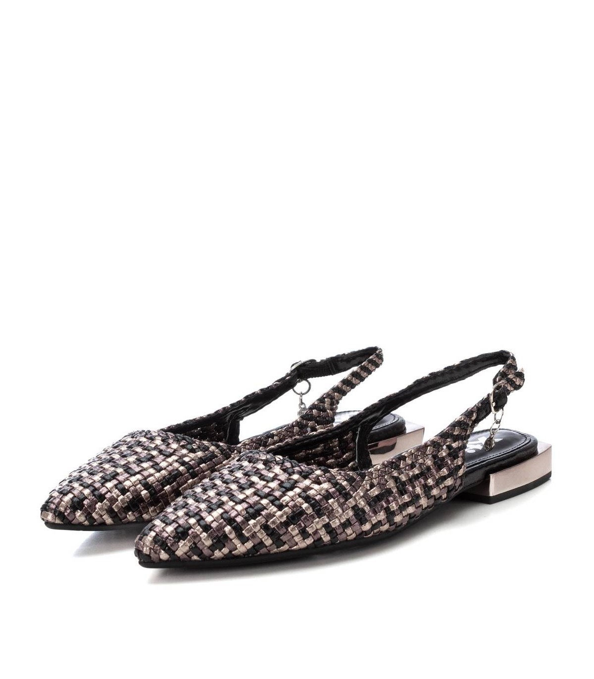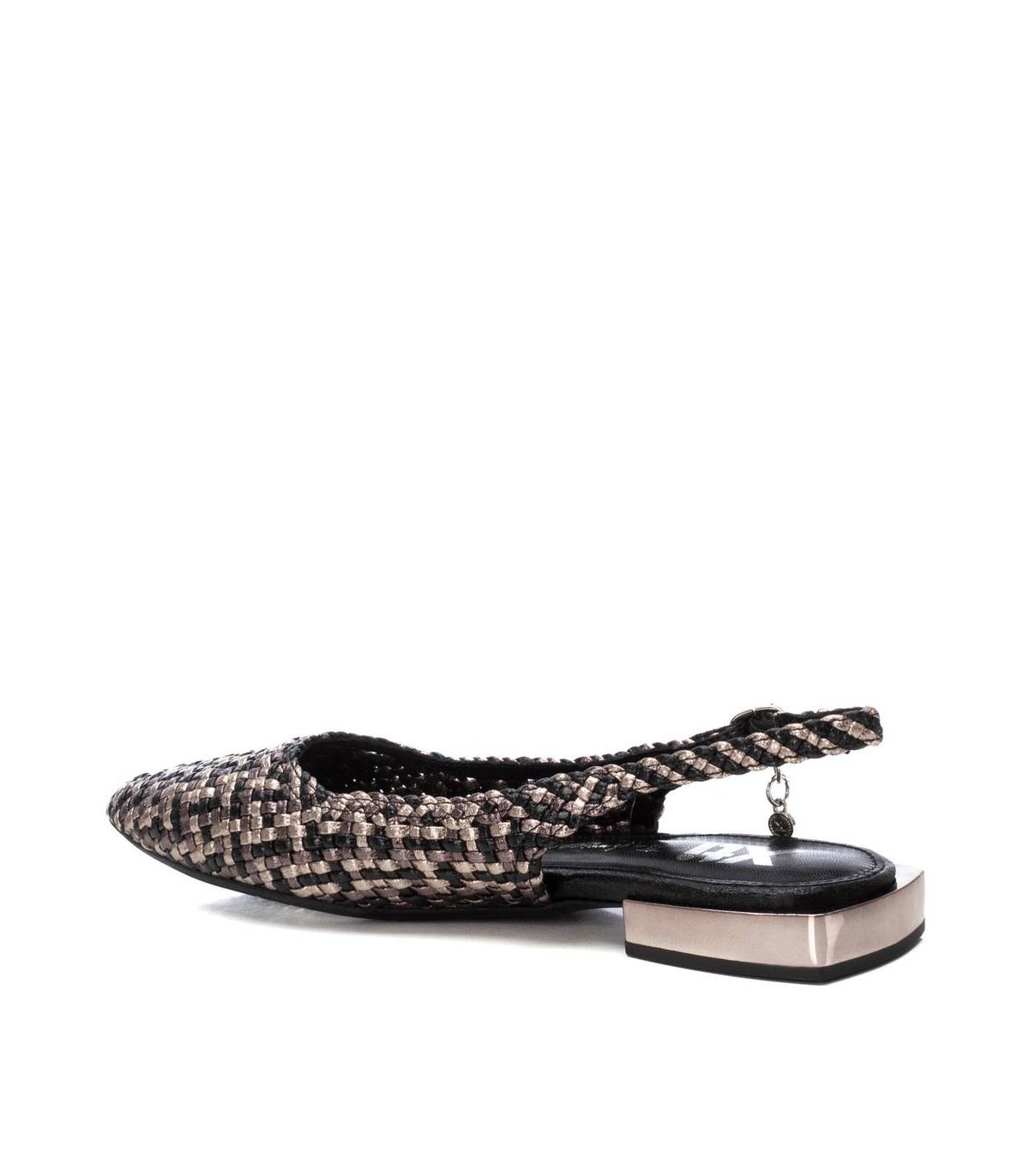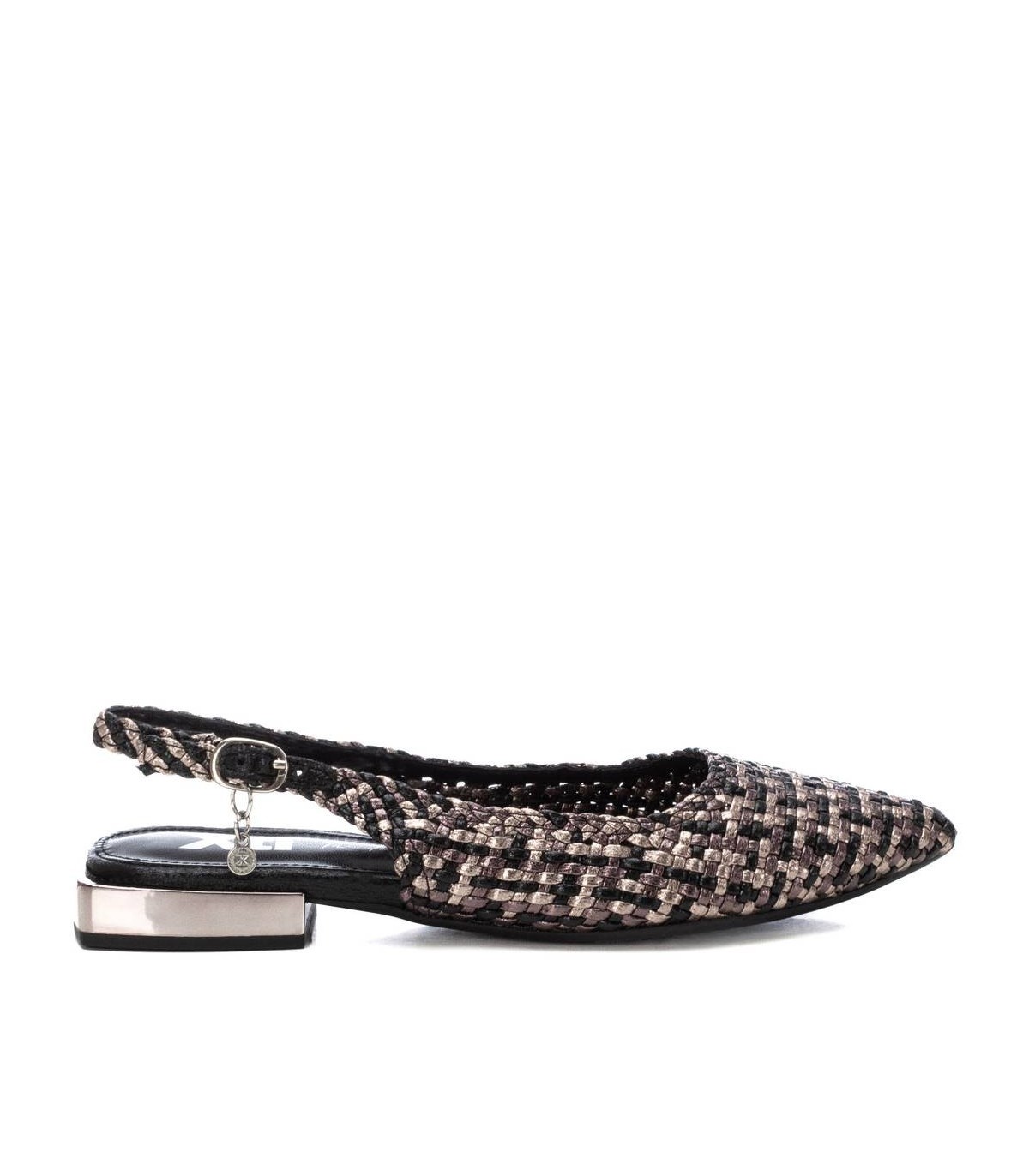 Zapato destalonado de mujer, de la marca Xti. Fabricado en material textil con acabado metalizado. Modelo trenzado con pulsera con hebilla en el tobillo con muy buena sujeción. Ideal para todos tus conjuntos. Este modelo ha obtenido el certificado vegano por la organización mundial PETA (Organización de los derechos de los animales).