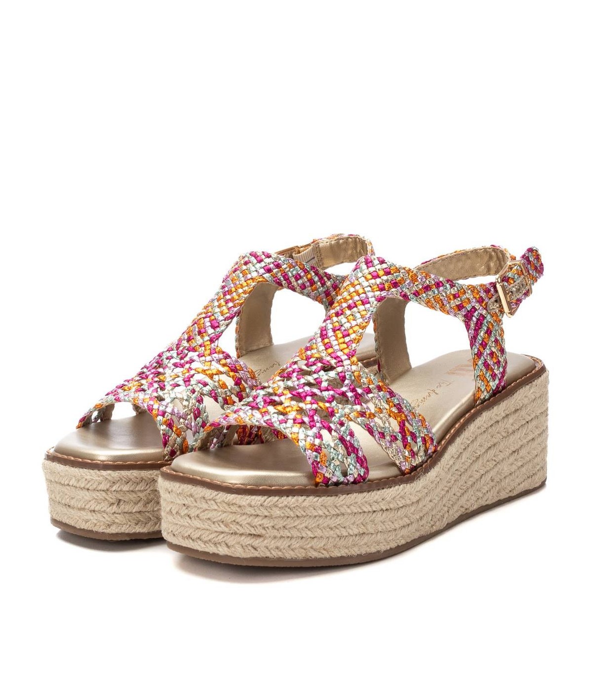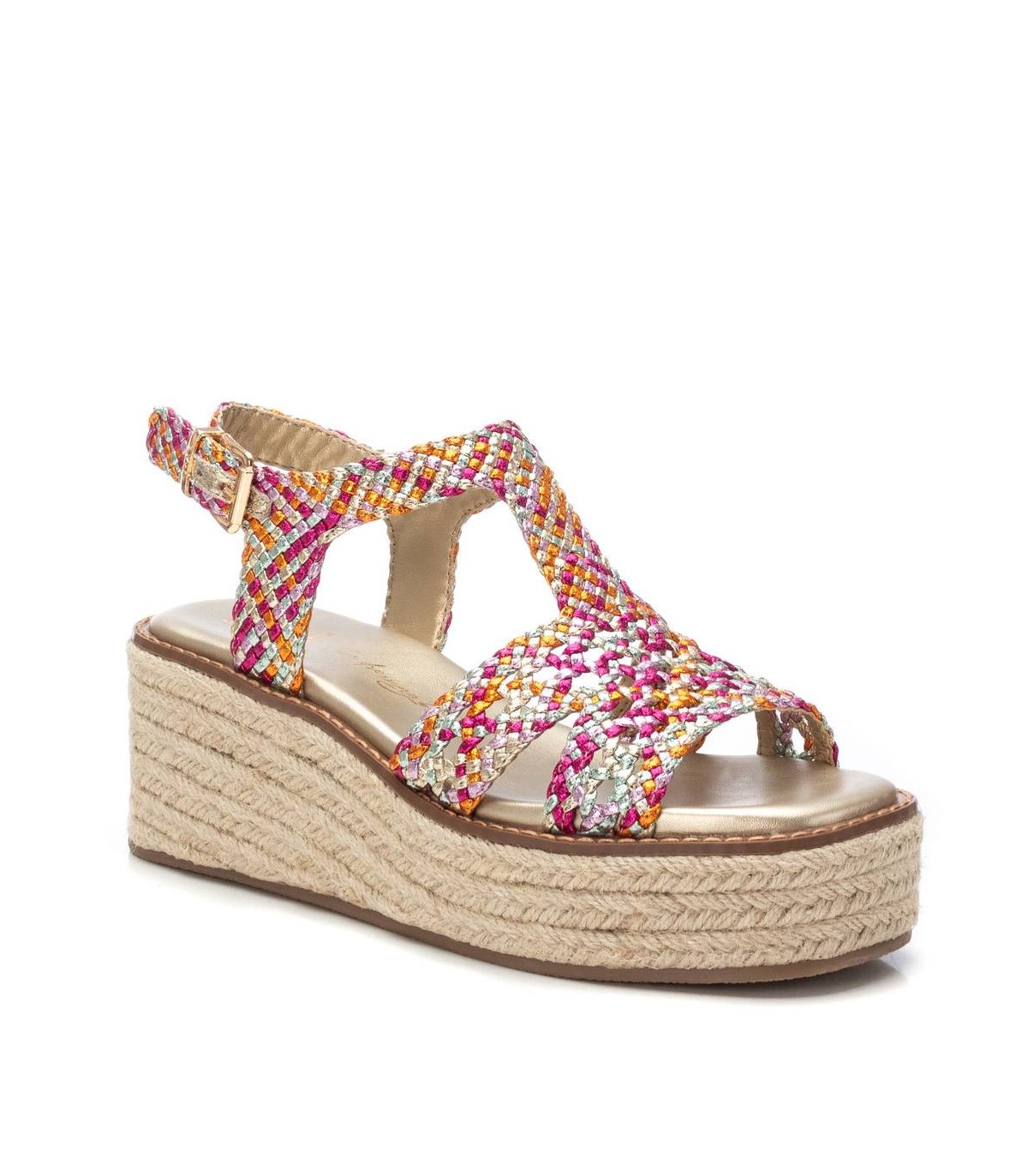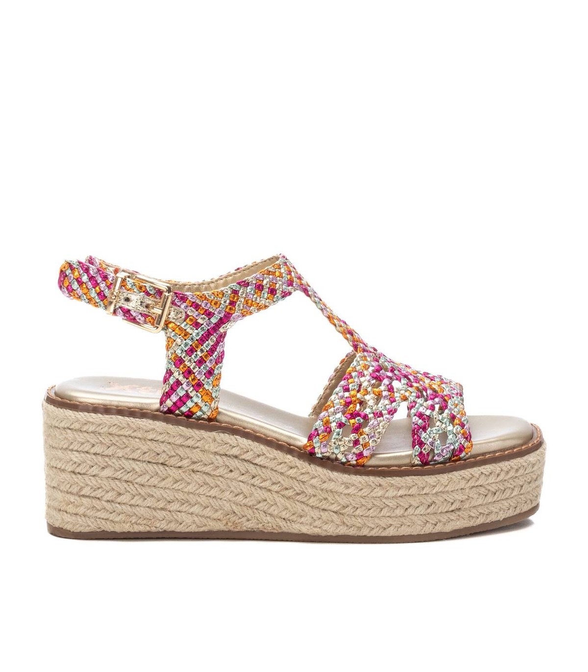 Sandalia de mujer, de la marca Xti. Fabricada en material textil metalizado con un bonito entrelazado. Cómoda cuña con plataforma de yute con suela antideslizante. Con estas sandalias no pasarás desapercibida. Este modelo ha obtenido el certificado vegano por la organización mundial PETA (Organización de los derechos de los animales).