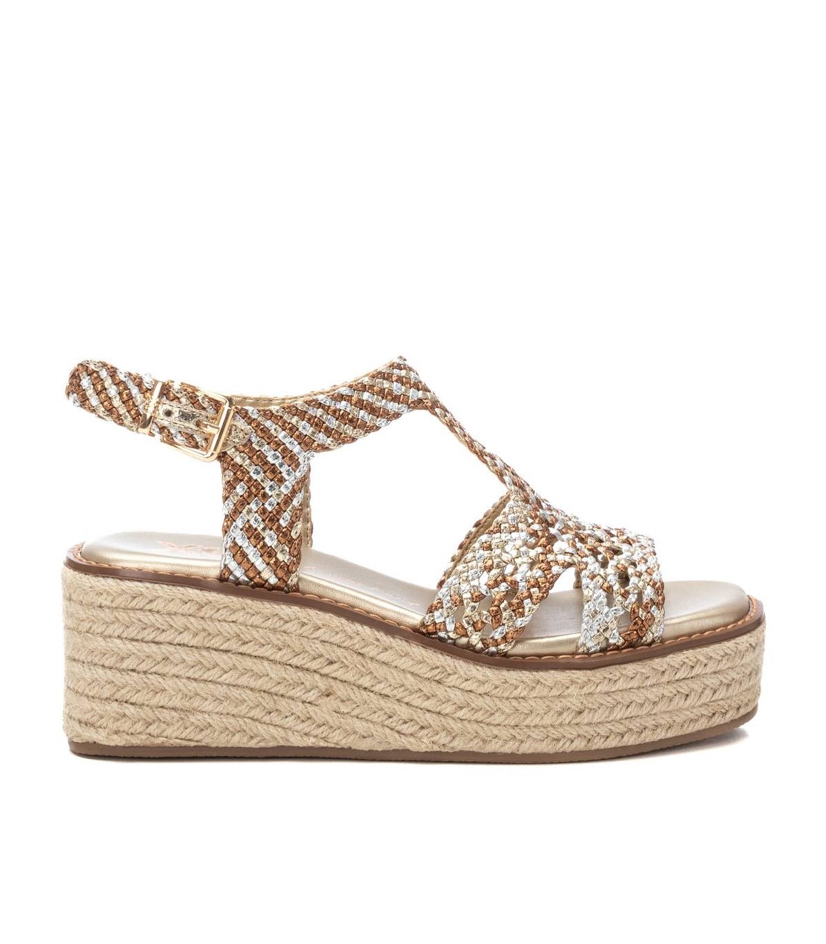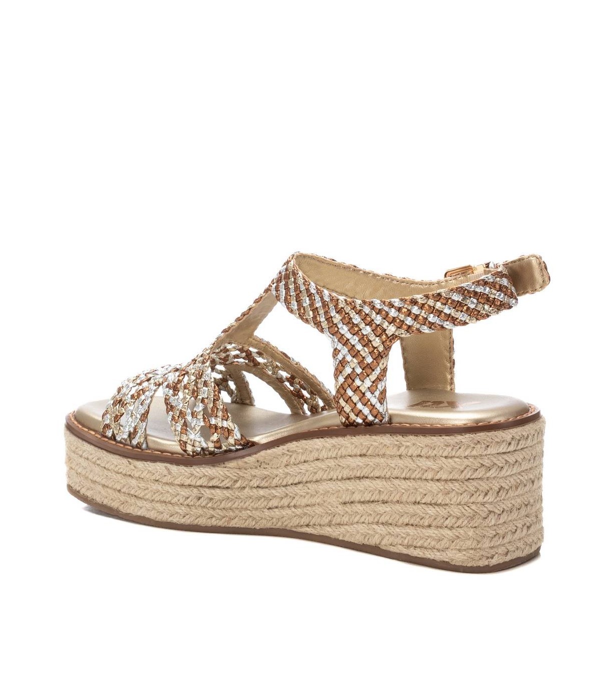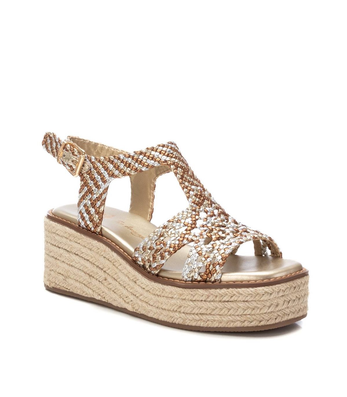 Sandalia de mujer, de la marca Xti. Fabricada en material textil metalizado con un bonito entrelazado. Cómoda cuña con plataforma de yute con suela antideslizante. Con estas sandalias no pasarás desapercibida. Este modelo ha obtenido el certificado vegano por la organización mundial PETA (Organización de los derechos de los animales).