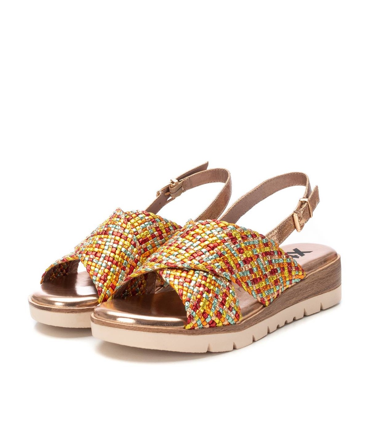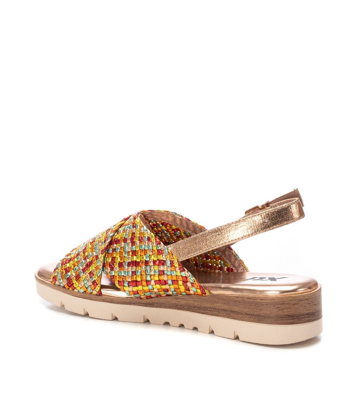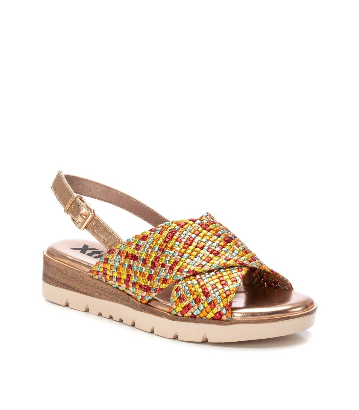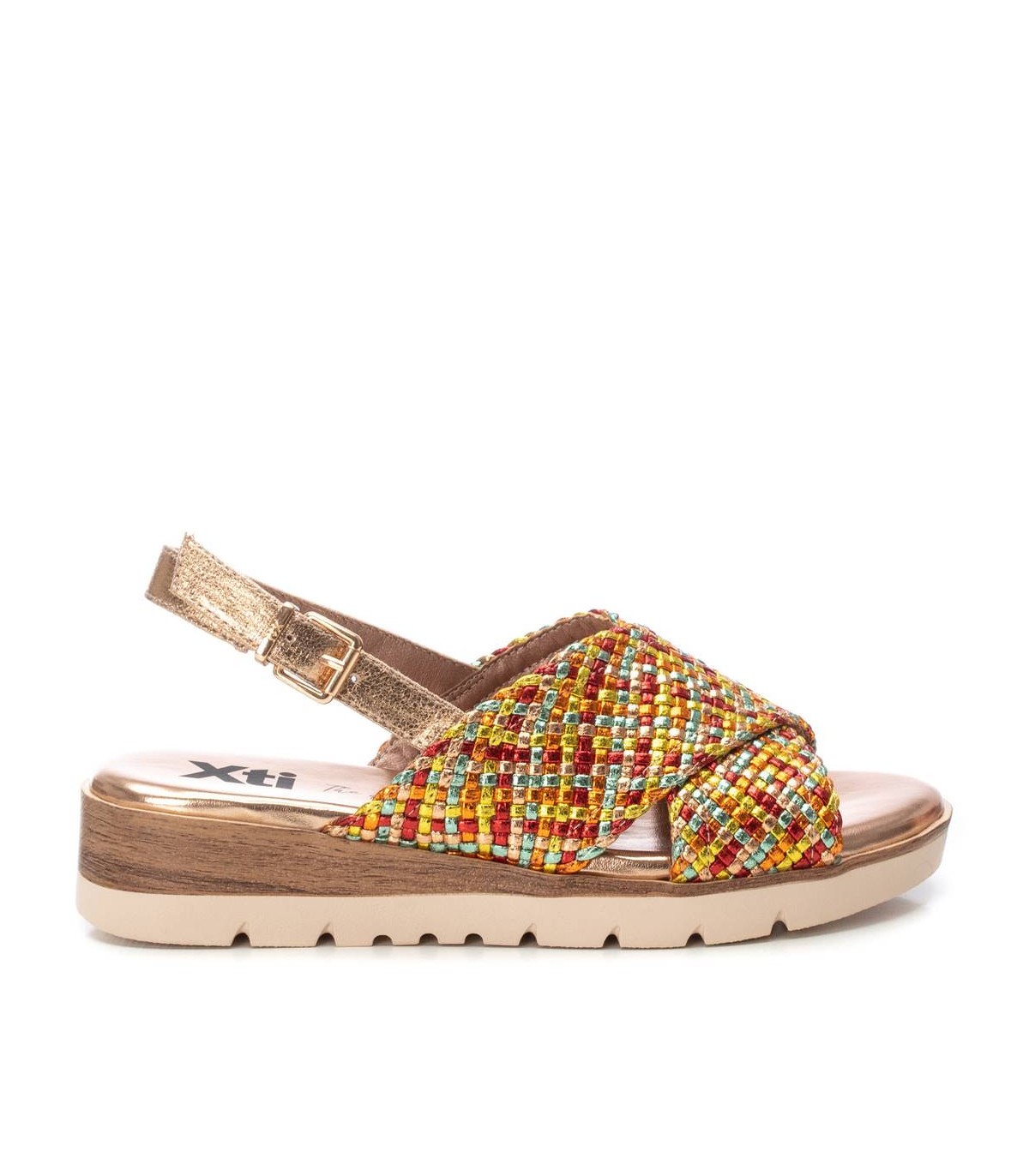 Sandalia de mujer , de la marca Xti. Diseño cruzado con textil con acabado metalizado. Cierre con hebilla metálica para facilitar el ajuste. Cuña baja de 3 cm con suela de goma antideslizante. Este modelo ha obtenido el certificado vegano por la organización mundial PETA (Organización de los derechos de los animales).