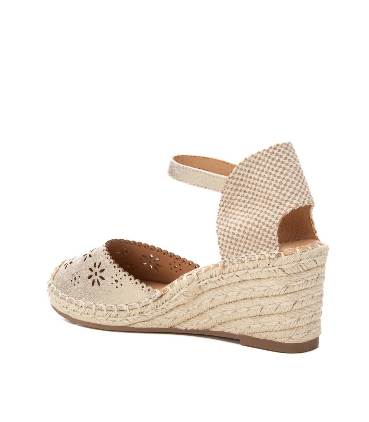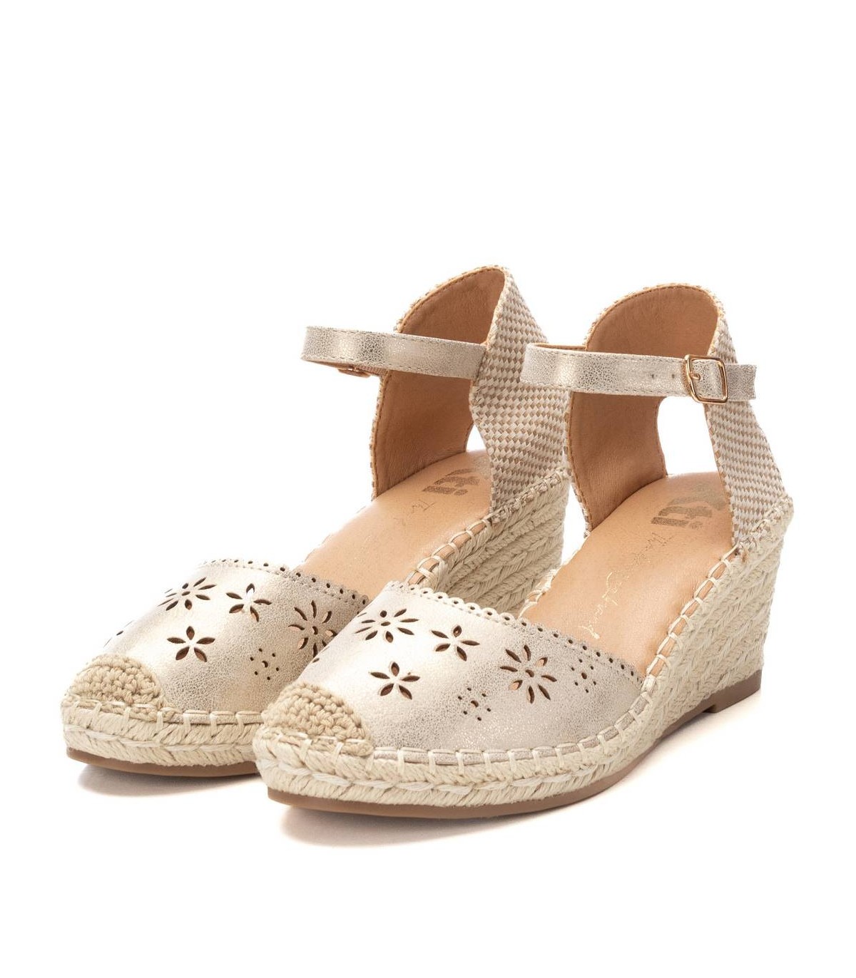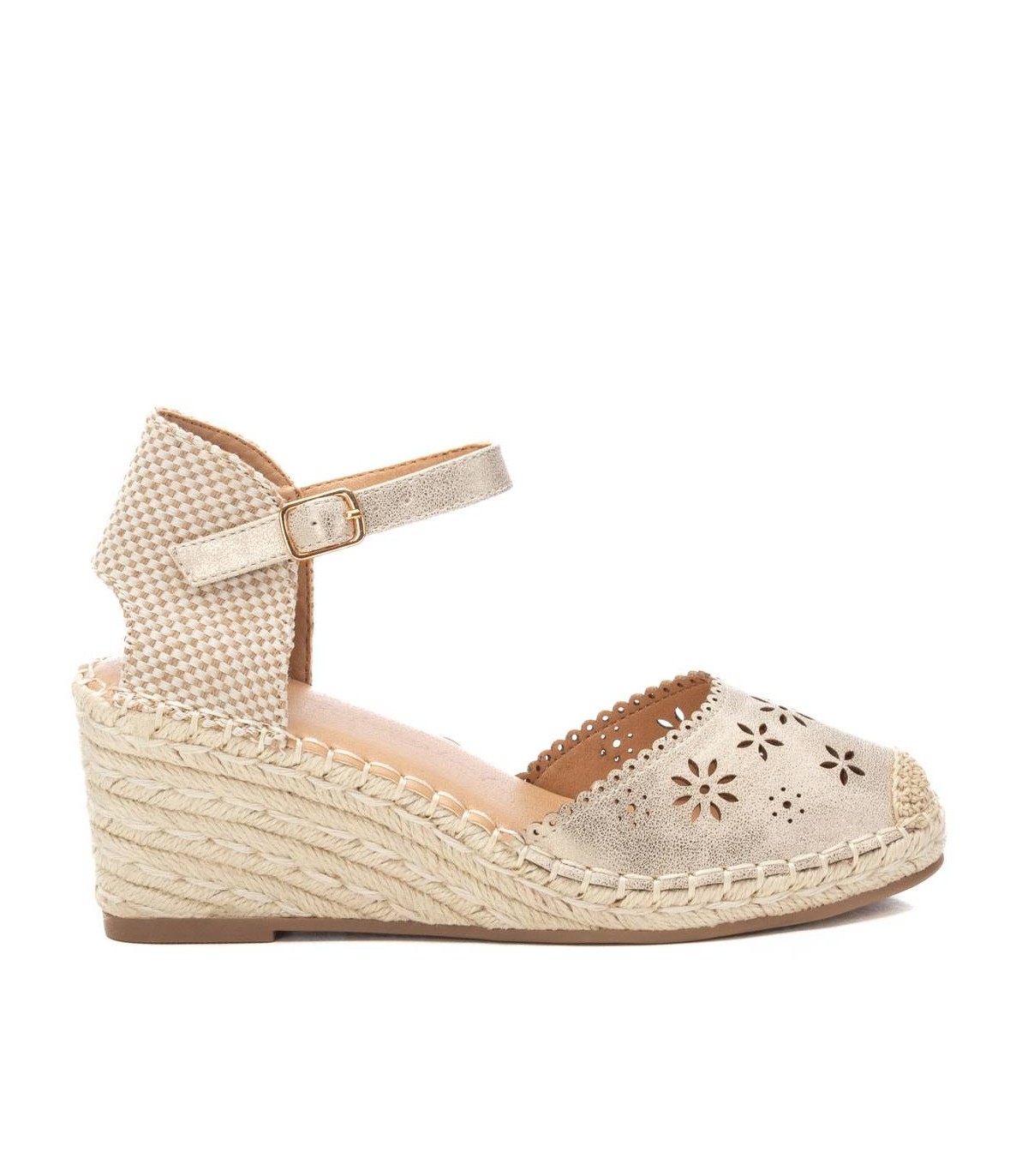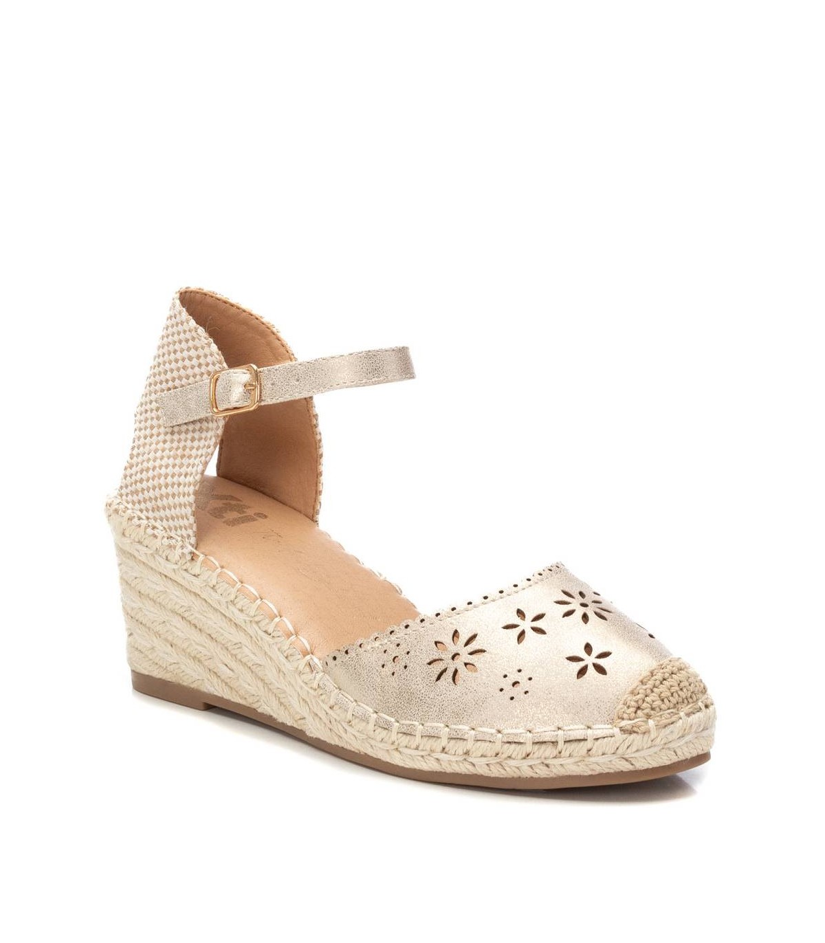 Alpargata tipo valenciana de mujer de la marca Xti. Fabricada en material que imita la piel con acabado metalizado y diseño floral troquelado. Cierre mediante hebilla. Cuña de 7 cm de yute con suela de goma antideslizante. Este modelo ha obtenido el certificado vegano por la organización mundial PETA (Organización de los derechos de los animales).
