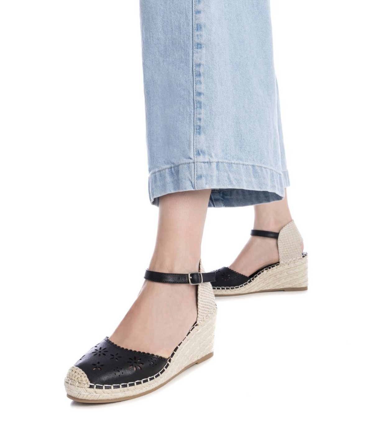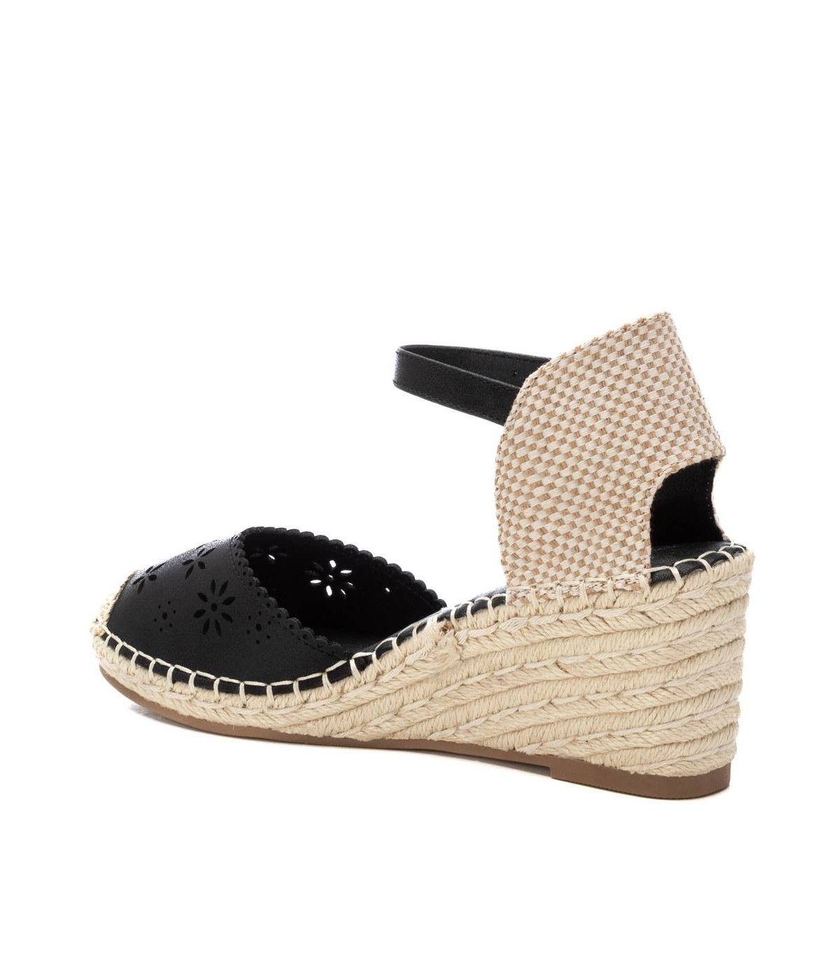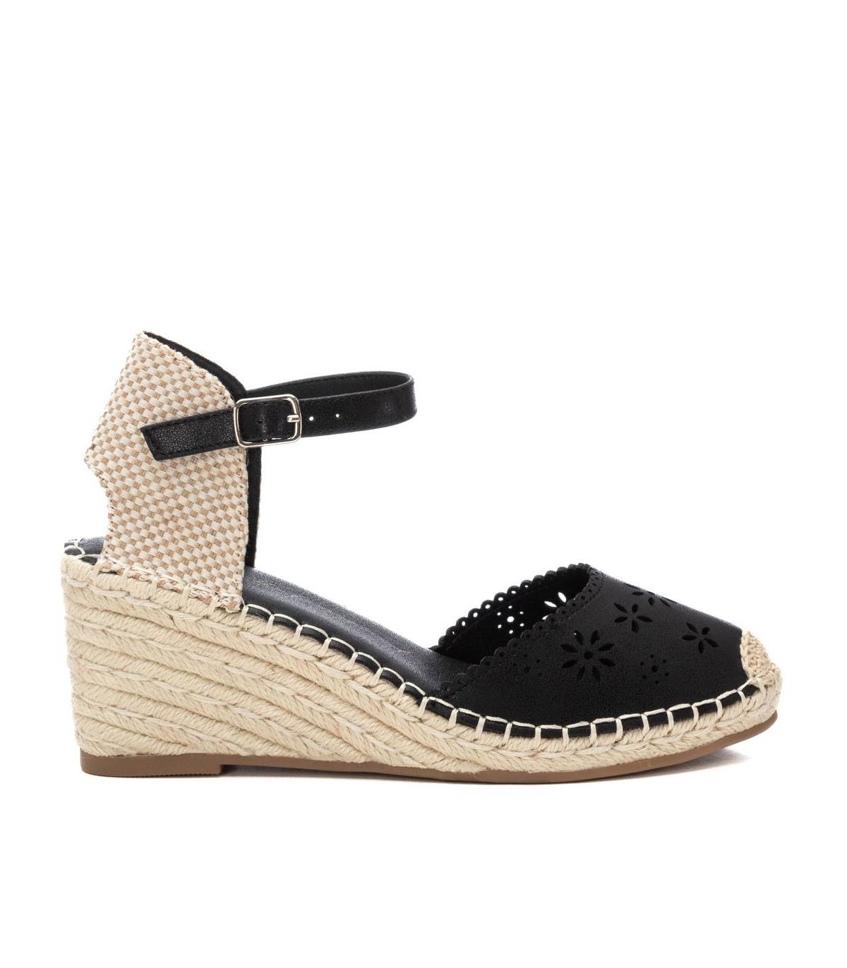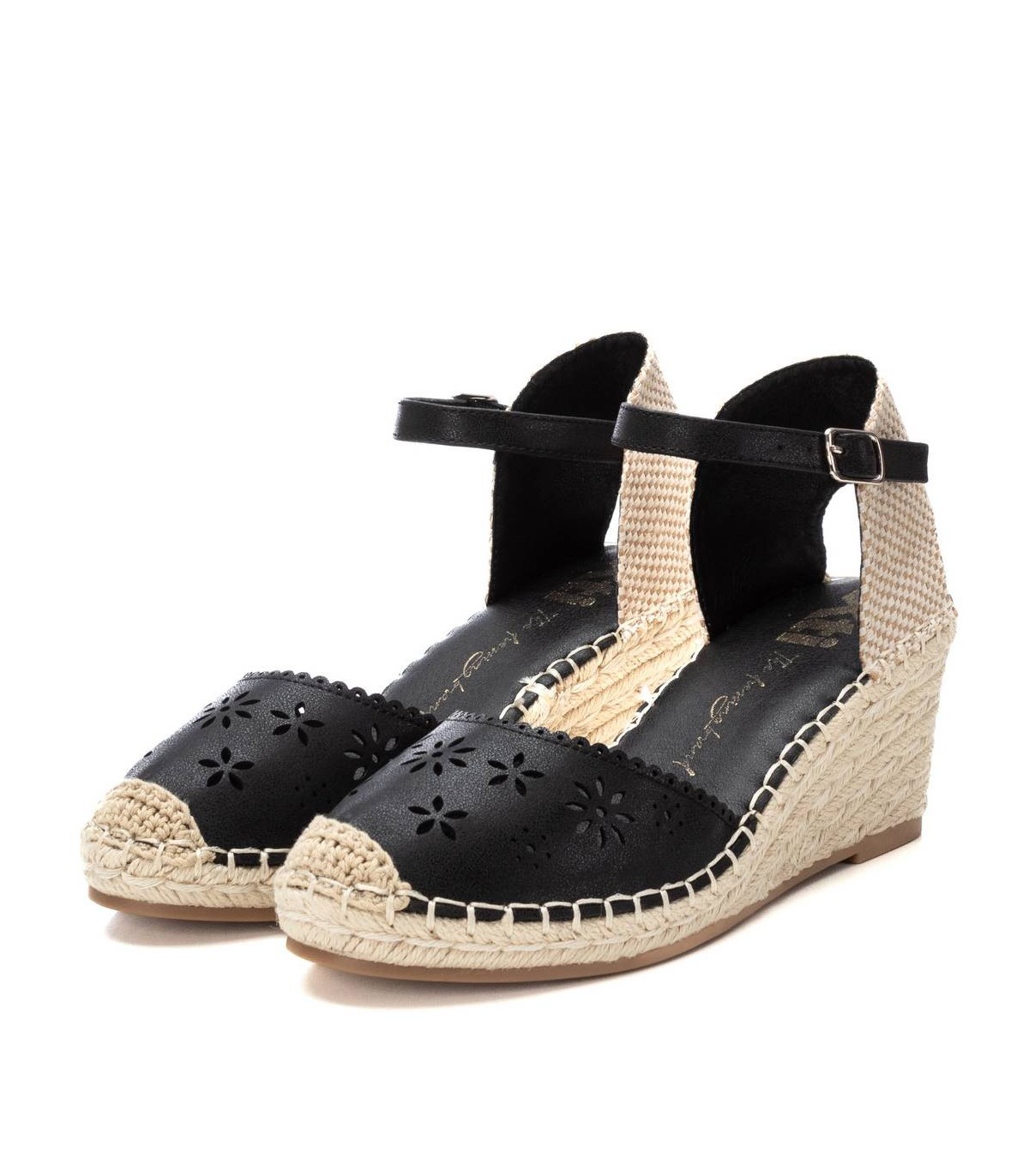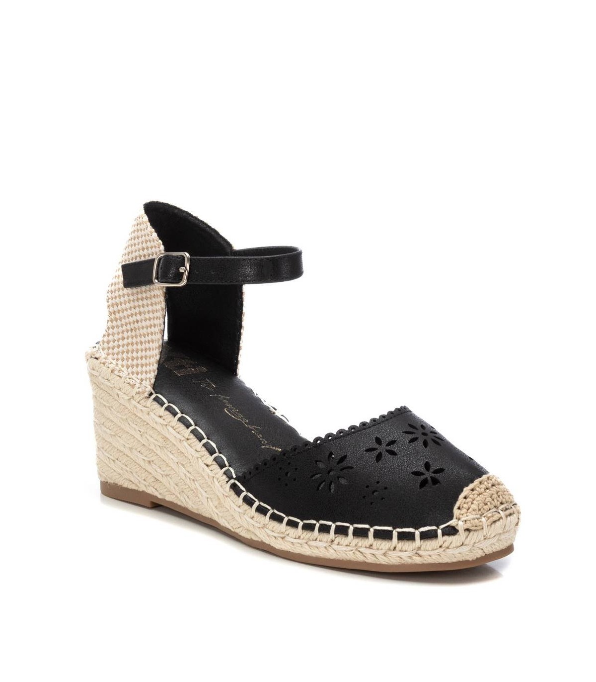 Alpargata tipo valenciana de mujer de la marca Xti. Fabricada en material que imita la piel con acabado metalizado y diseño floral troquelado. Cierre mediante hebilla. Cuña de 7 cm de yute con suela de goma antideslizante. Este modelo ha obtenido el certificado vegano por la organización mundial PETA (Organización de los derechos de los animales).