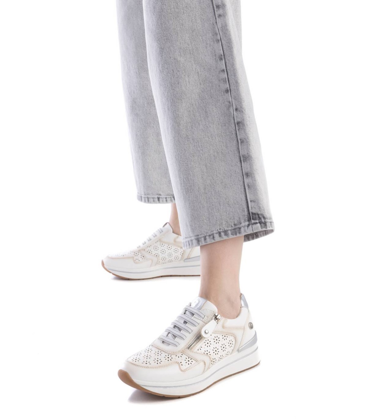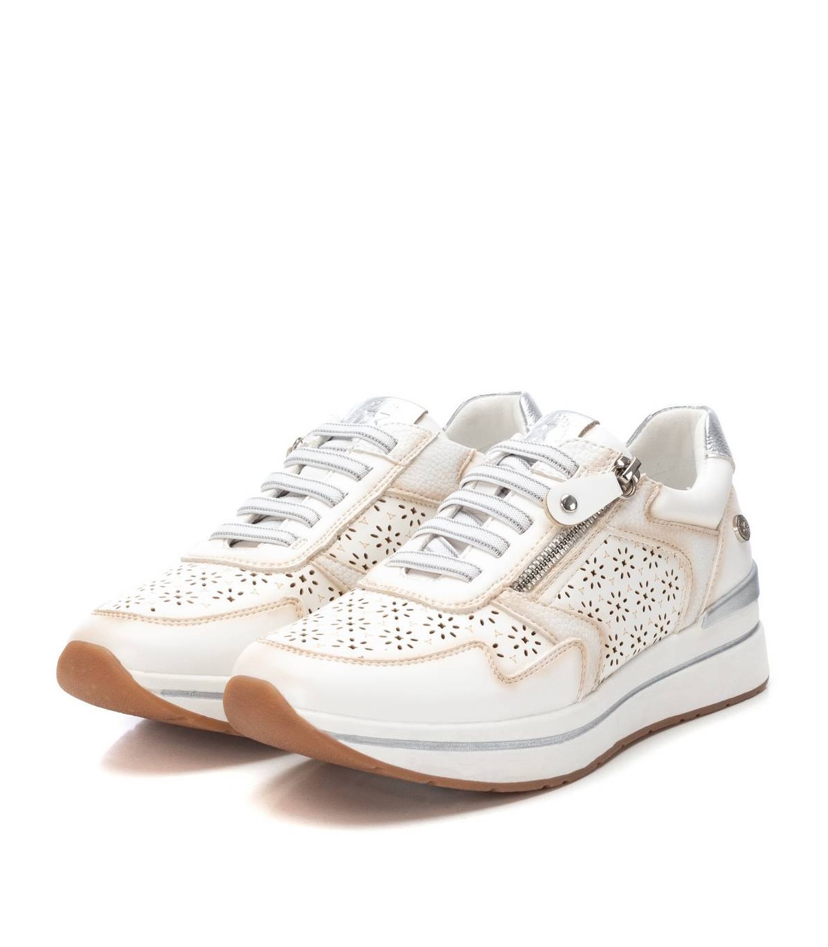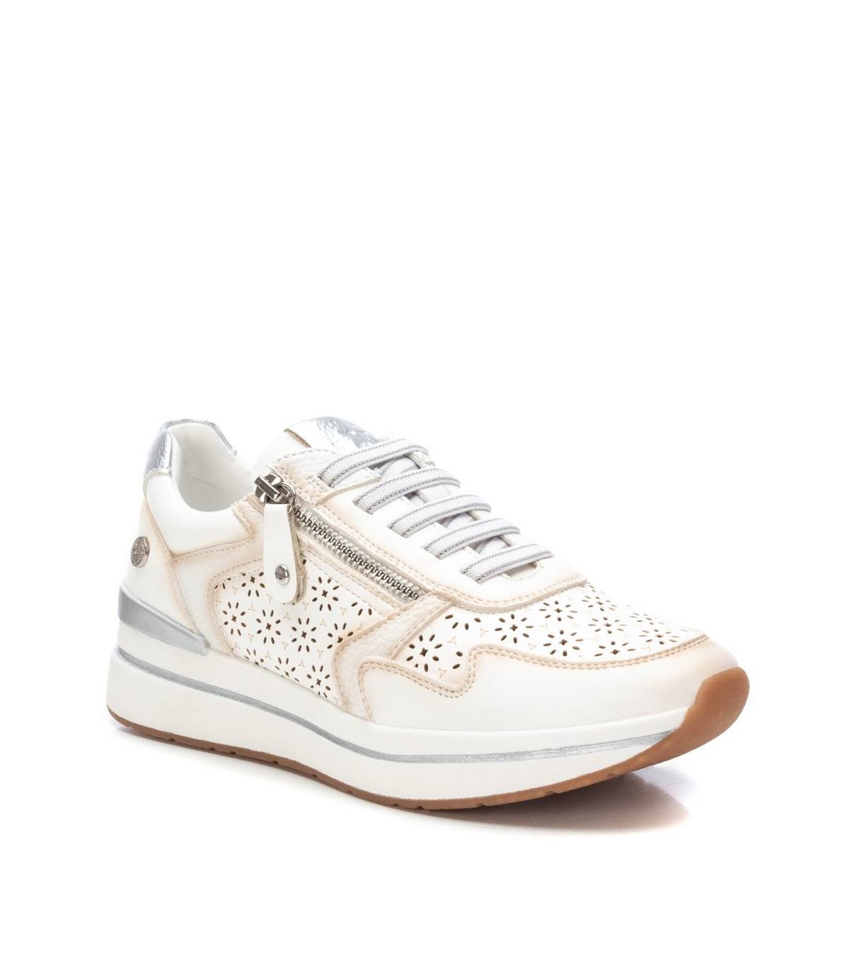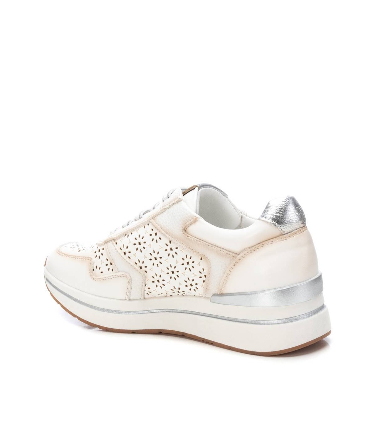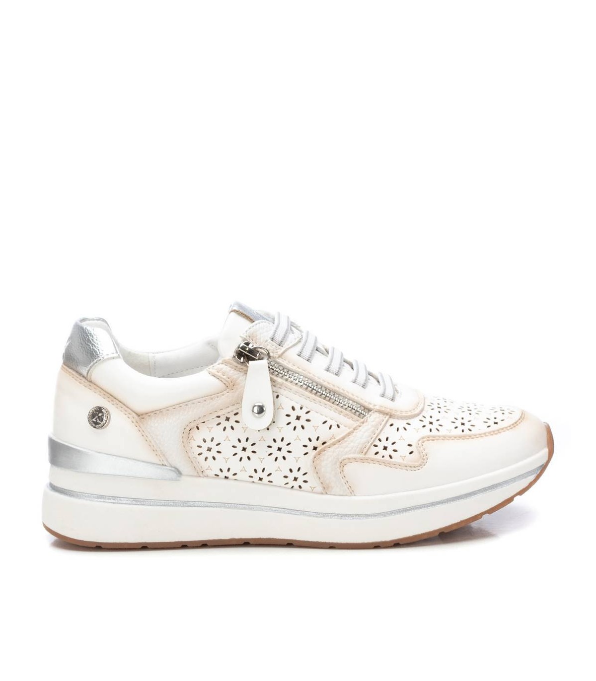 Zapatilla de mujer, de la marca Xti. Fabricada en material que imita la piel. Con bonito troquelado en el lateral y en la puntera. Detalle metalizado en el talón. Cremallera lateral. Suela antideslizante con línea decorativa y pieza color metalizado en el talón. Con plantilla extraíble. Este modelo ha obtenido el certificado vegano por la organización mundial PETA (Organización de los derechos de los animales).