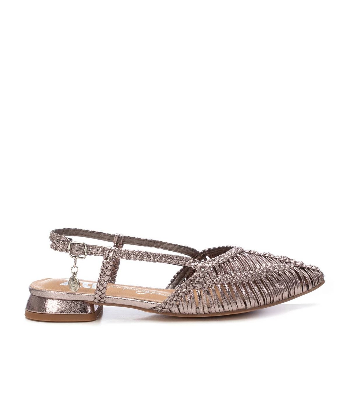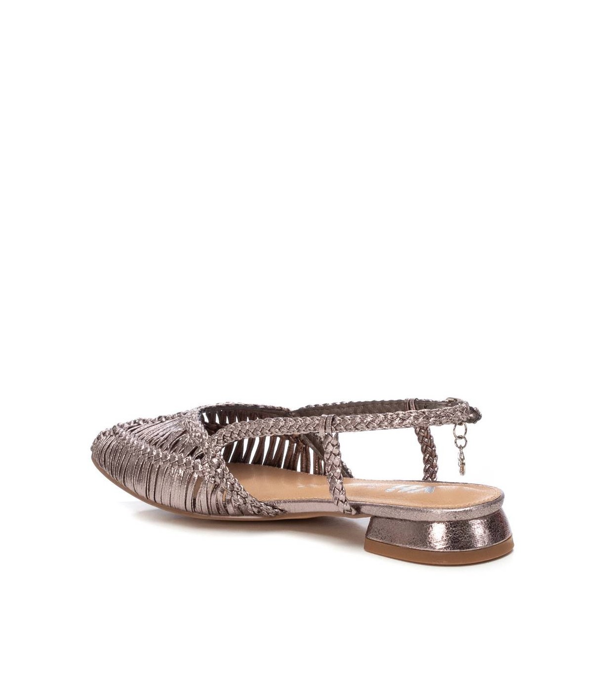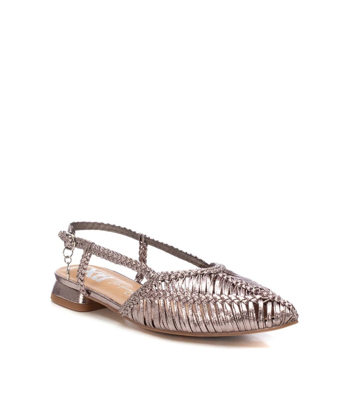 Zapato destalonado de mujer, de la marca Xti. Fabricado en material textil con acabado metalizado. Modelo trenzado con pulsera en el tobillo con muy buena sujeción mediante hebilla metálica. Ideal para todos tus conjuntos. Este modelo ha obtenido el certificado vegano por la organización mundial PETA (Organización de los derechos de los animales).